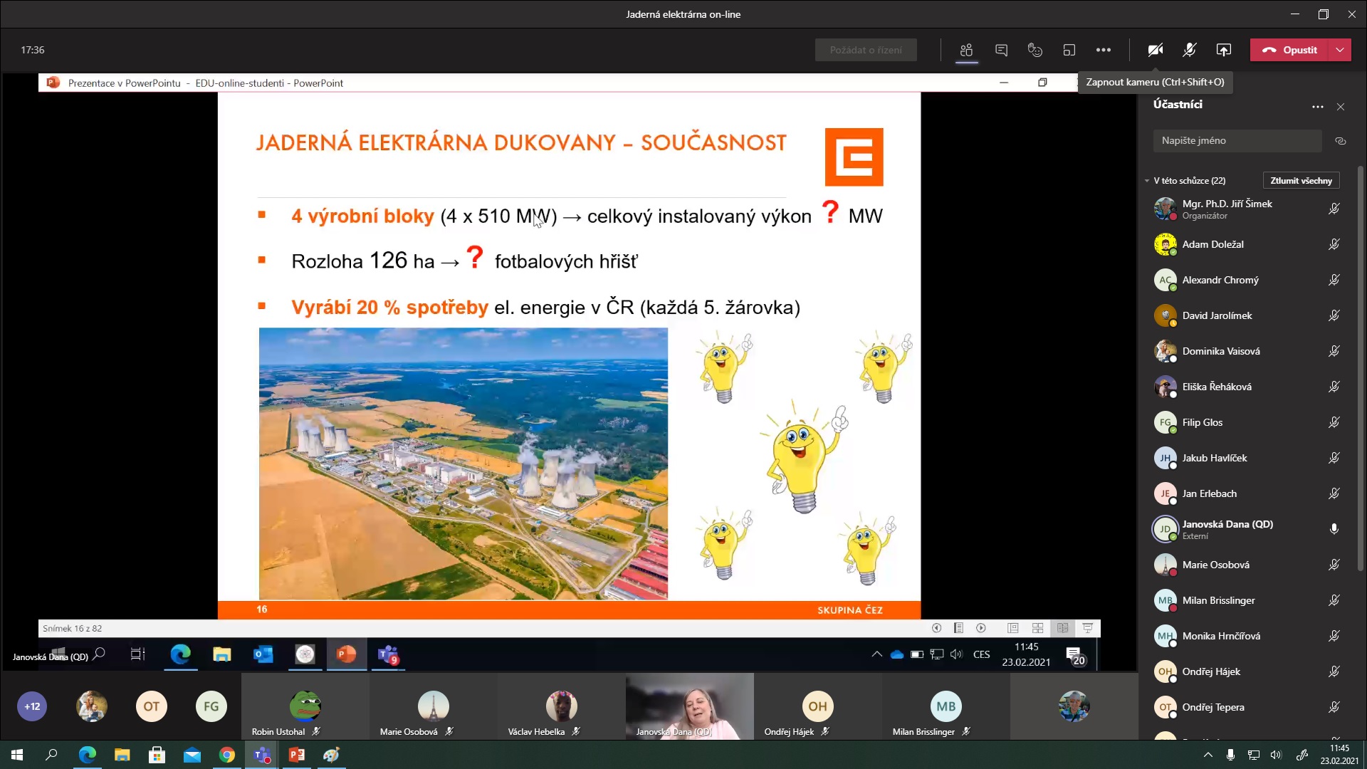 Onen skok byl samozřejmě virtuální a byl realizován ve spolupráci se společností ČEZ. Díky této společnosti byla v naší škole realizována prohlídka, zaměřena na funkčnost elektrárny. Témat, které tato problematika spojuje, se najde hned několik. Pro žáka 9. ročníku, s jistým přehledem a názorem, je pak dobré vidět souvislosti mezi energetickými zdroji, dopady na životní prostředí, technologií a náročností výstavby a výroby energie. Nemluvě o jednom ze stěžejních témat fyziky – jaderné energii. V 45-ti minutách jsme se dostali tam, kam by to za normálních okolností šlo jen velmi těžko či vůbec. Prošli jsme všechna zákoutí jaderné elektrárny a zmatovali cestu jaderného paliva až po svítící žárovku u nás doma. Díky přehledným modelům a animacím jsme pak názorně pochopili celou složitost těchto zařízení, ze kterých si každý většinou pamatuje pouze chladící věže. Diskuze a dotazy žáků vyvrcholily ve vědomostním kvízu o věcné ceny. Z fyzikálního hlediska se pak jednalo o příjemnou přehledovou prezentaci, na kterou budeme navazovat v příštích hodinách právě jadernými reakcemi.