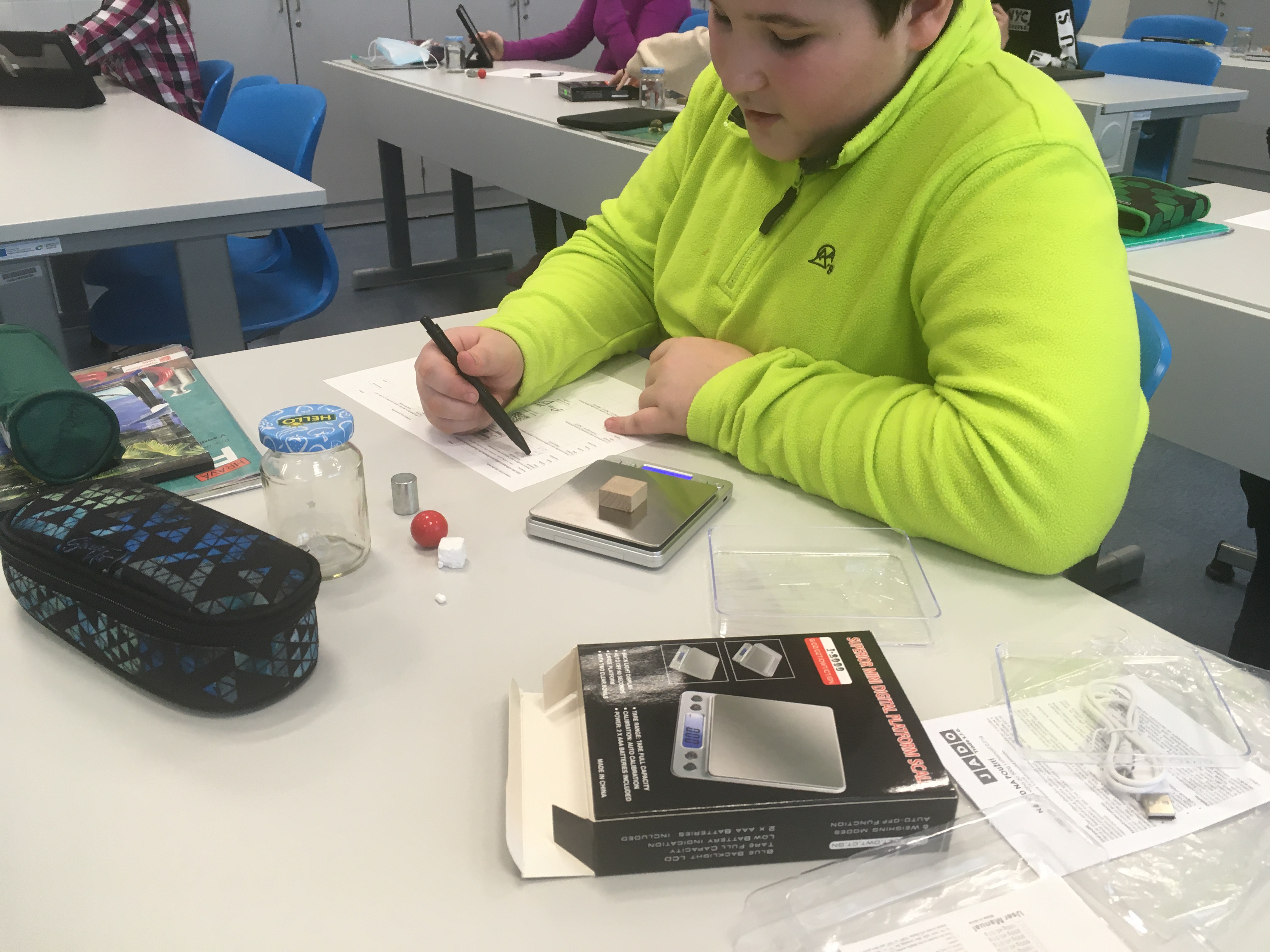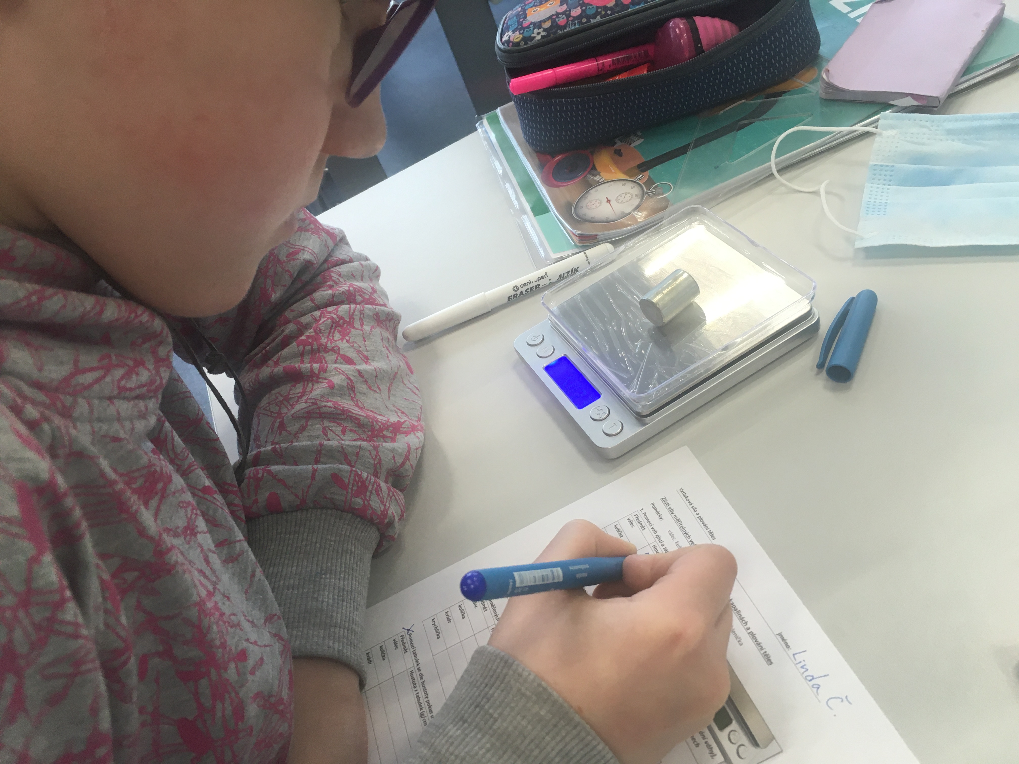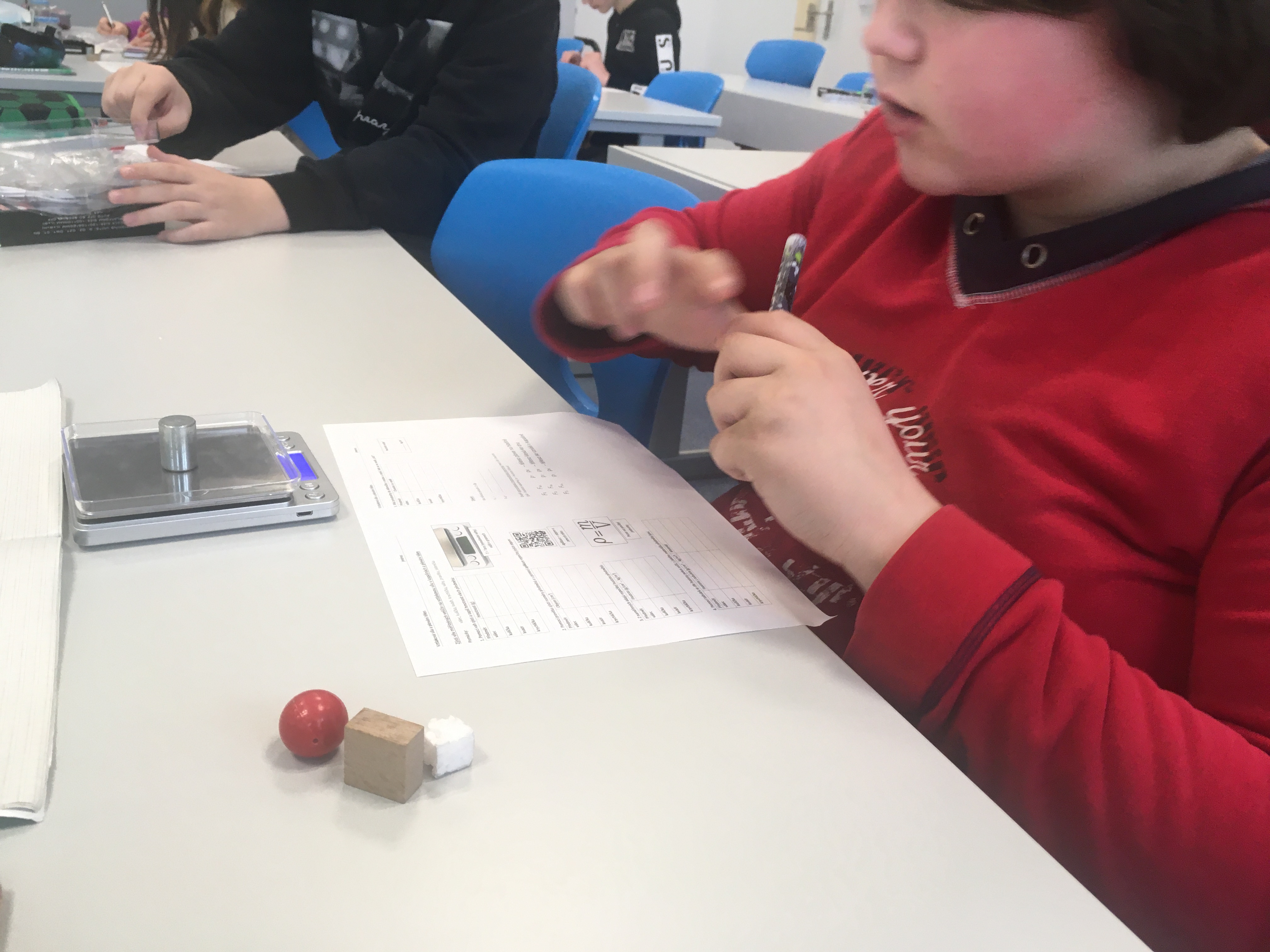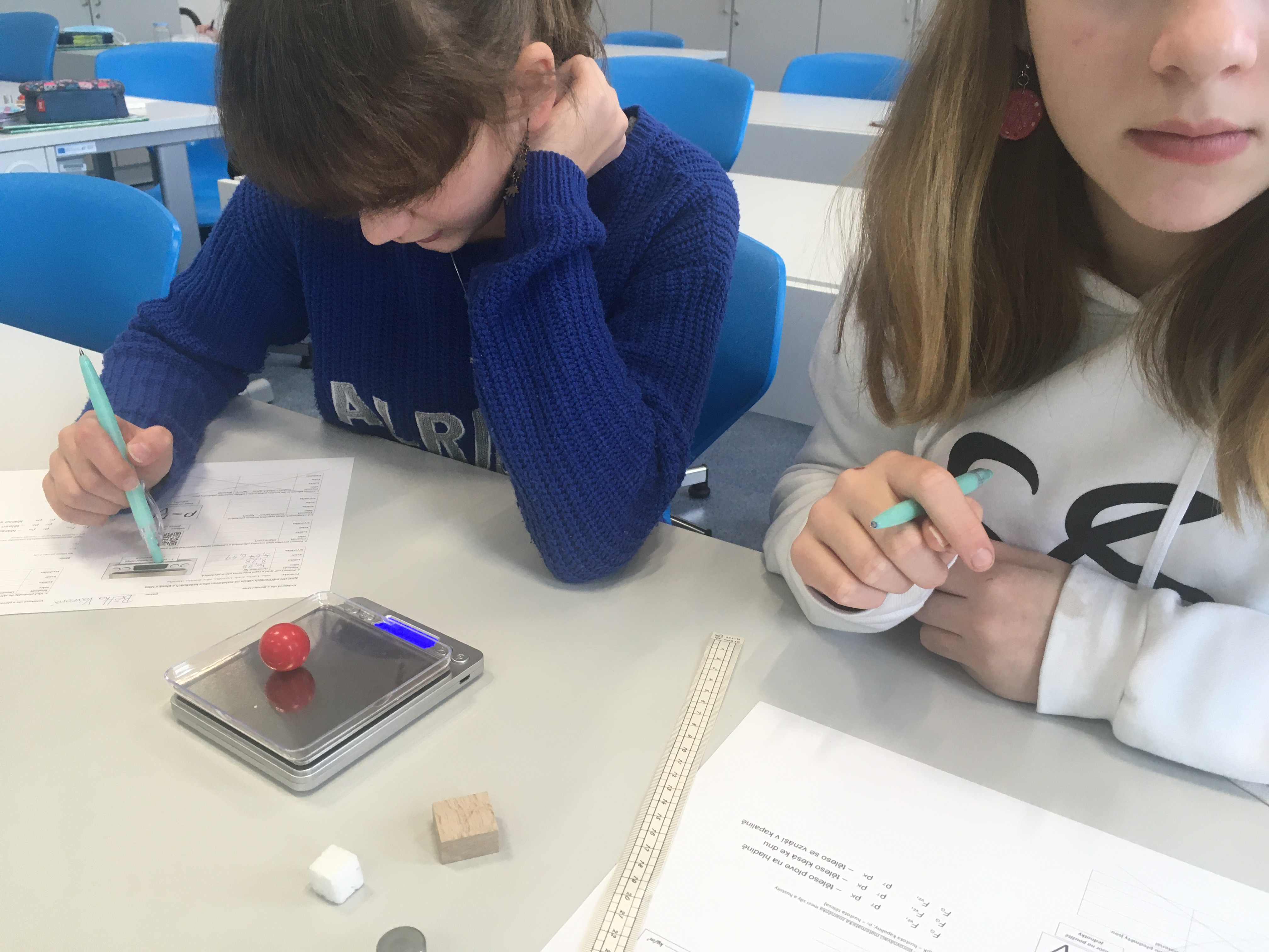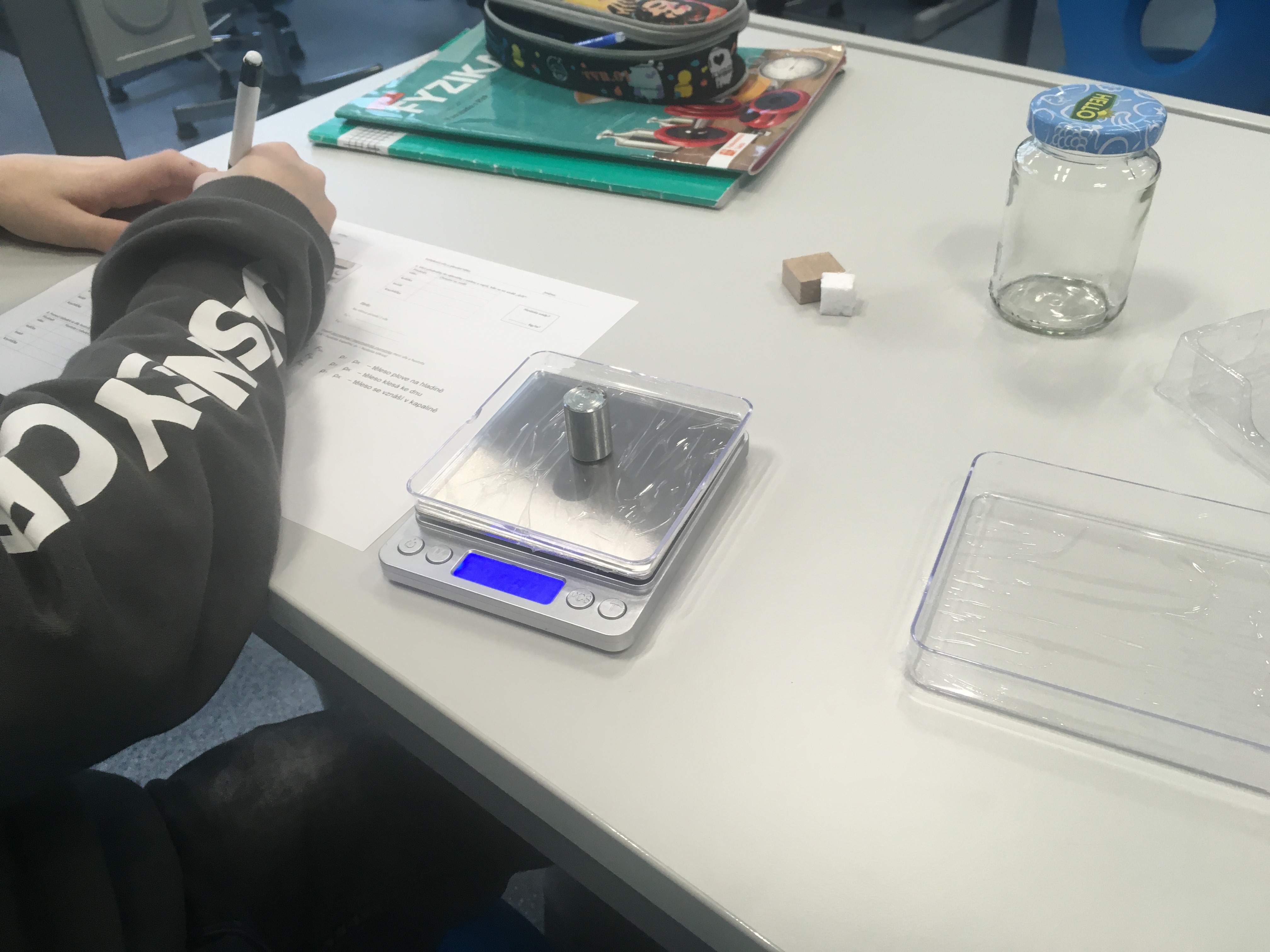 A váhy se hned vrhly do plnění svého popisu práce. Většina žáků 2. stupně se s nimi již seznámila v hodinách fyziky. Přes základní veličiny až po ty odvozené. Naposledy (viz. fotografie) zkoumali žáci 7. třídy vztahy mezi hmotností, objemem a hustotou na plování těles. Díky své univerzálnosti a přesnosti se váhy jistě stanou stálicí ve výbavě pavilonu odborných učeben.