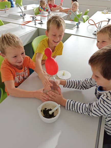 Nejstarší děti z mateřské školy si vyzkoušely pracovat v učebně chemie na základní škole. Všichni jsme se nejprve seznámili s prostory a pravidly při tvoření v učebně. Poté následoval první pokus s listy stromů či rostlin. Děti natrhaly listy na jemné kousky a daly do třecí misky. Přidaly písek a deváťáci přilili rozpouštědlo. Potom opět pracovaly malé děti, důkladně rozetřely listy tloučkem. Připravily si misku s filtračním papírem, do kterého vyrobily knot. Po přelití připraveného vzorku do misky sledovaly, jak se jednotlivé barvy pohybují. Na druhý pokus byl potřebný nafukovací balónek. Děti nasypaly jedlou sodu do balónku, který jim pomohli žáci z deváté třídy upevnit na baňku s octem, a poté předškoláci opatrně vysypali prášek do octa a pozorovali chemickou reakci. Vznikající bubliny oxidu uhličitého balónky nafukovaly.