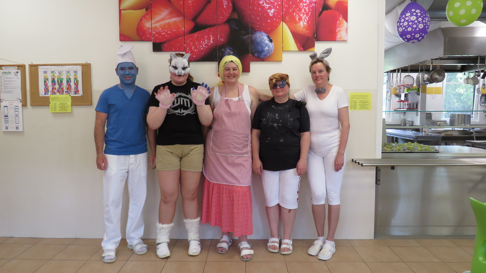 Při příležitosti Dne dětí byla jídelna vesele vyzdobená a při výdeji obědů děti potkaly Šmoulu, Ježibábu, vlka, králíčka a Manku.
