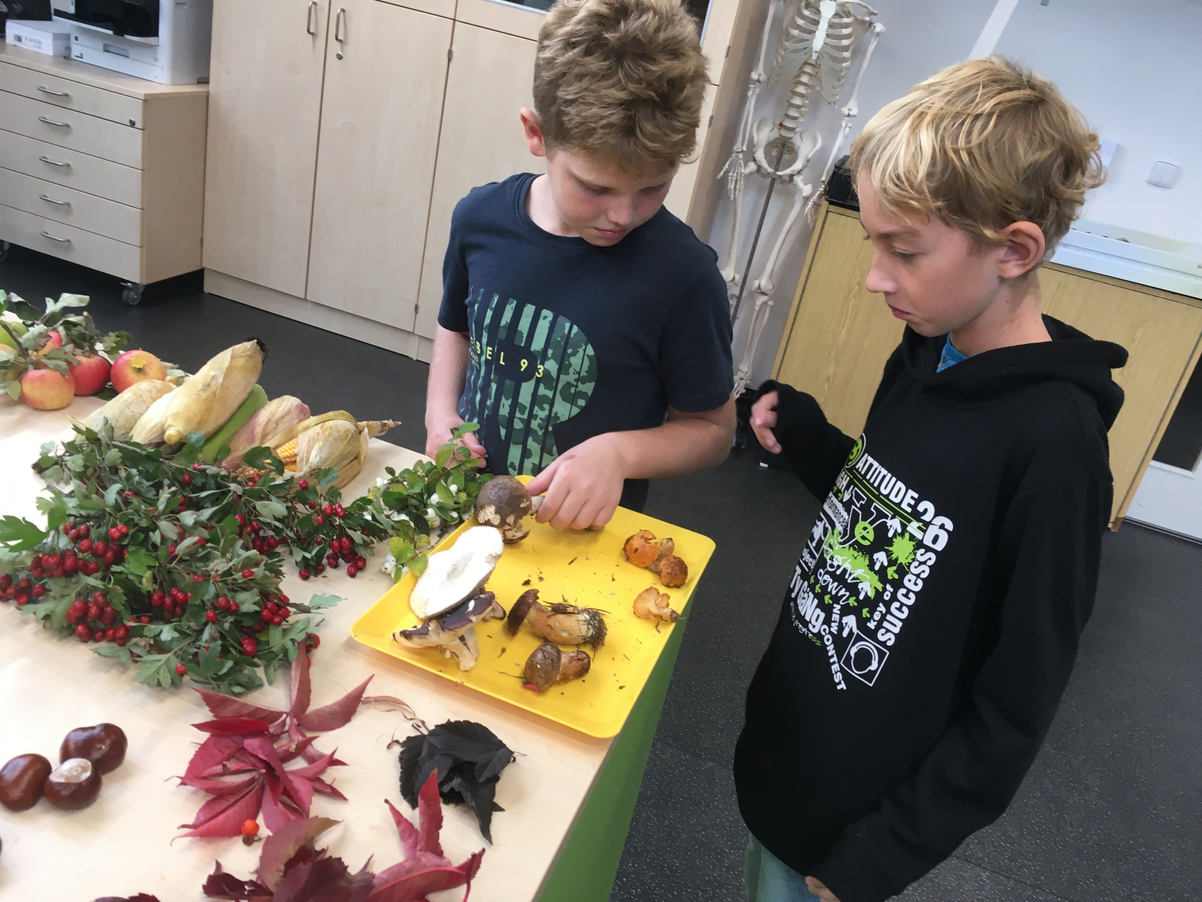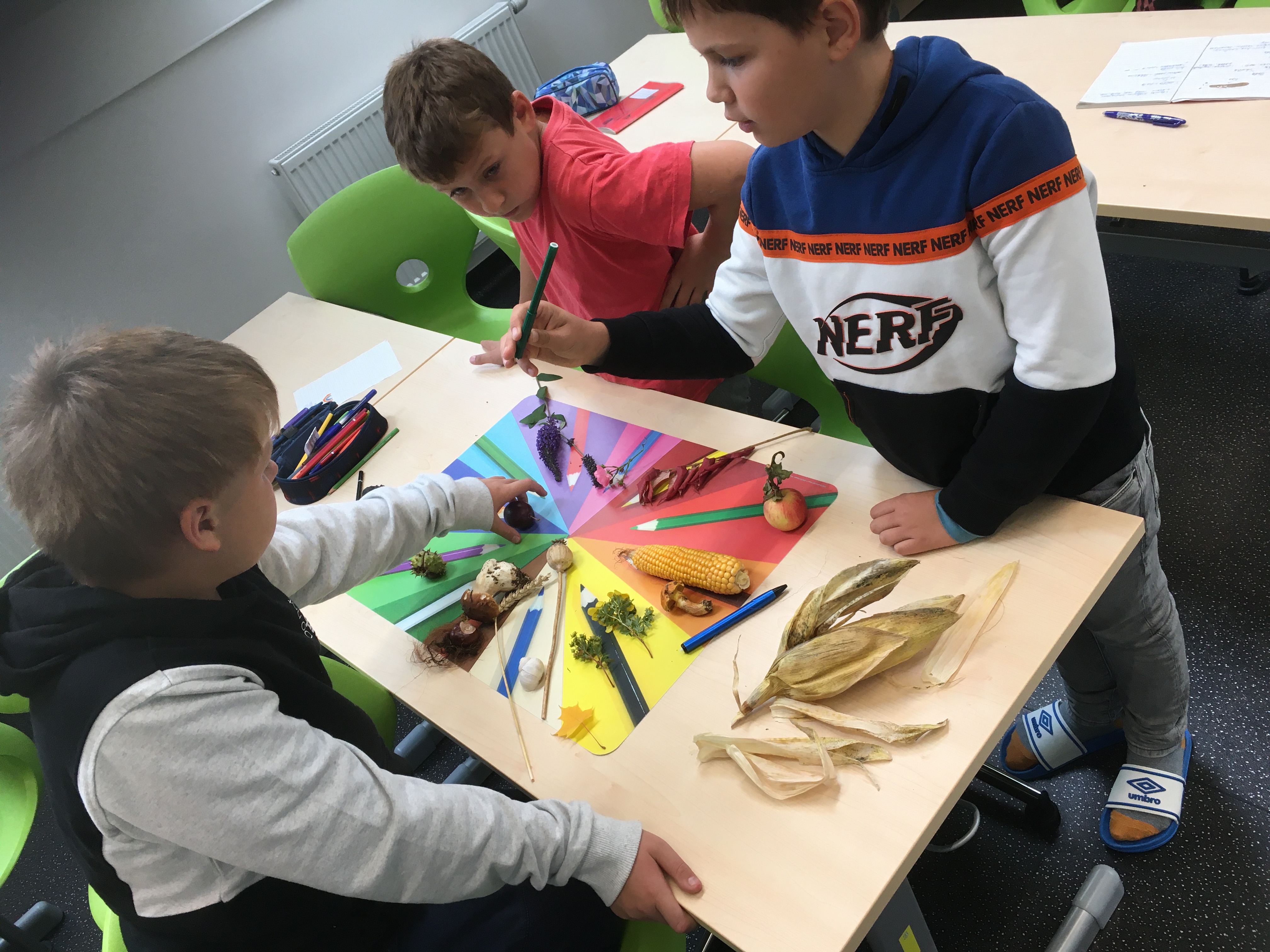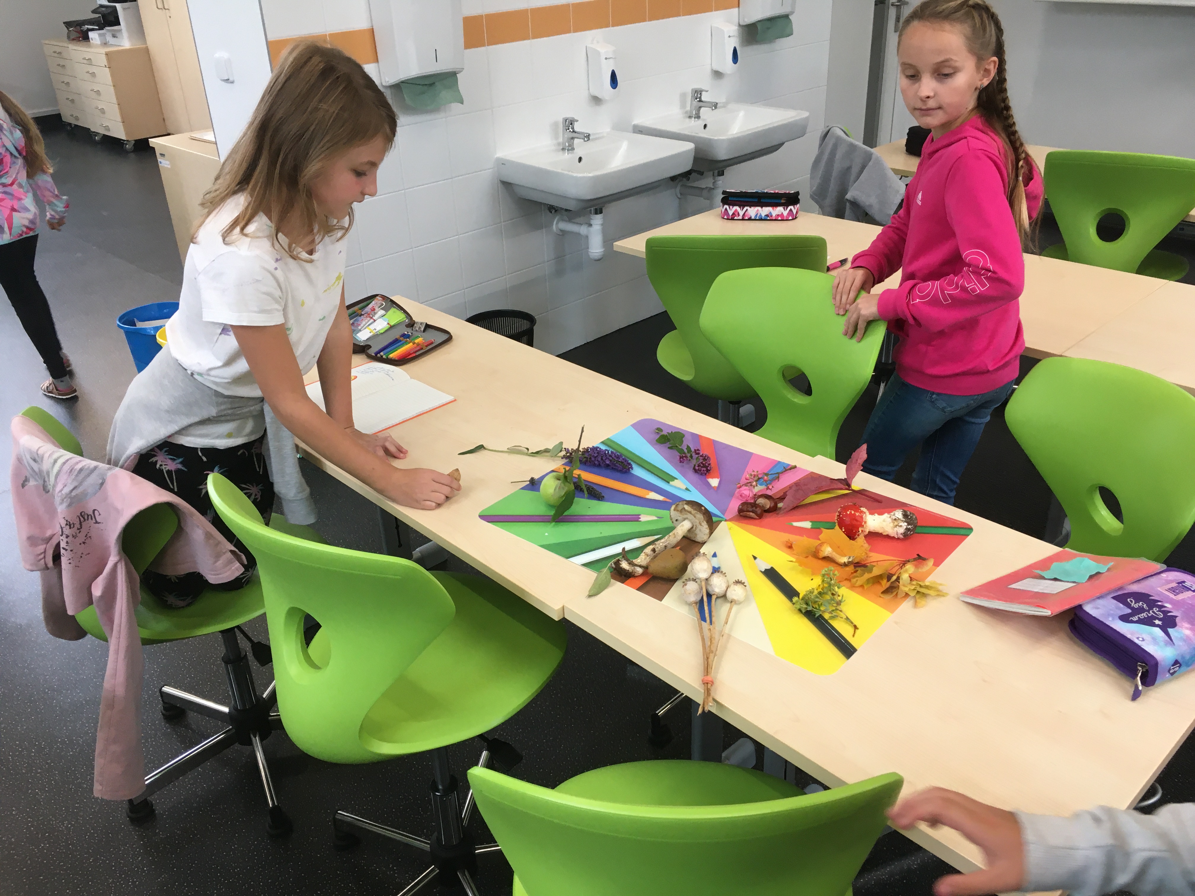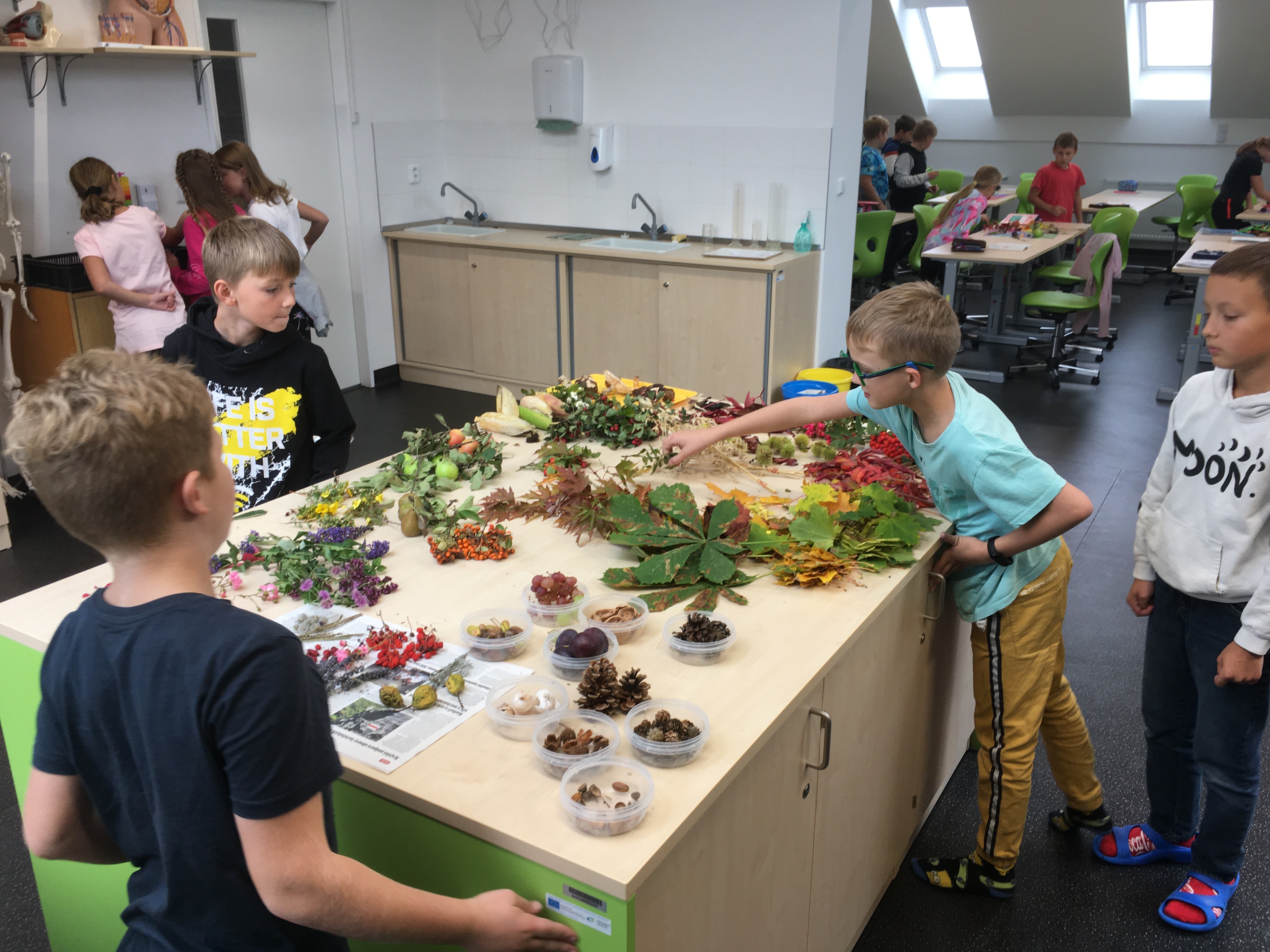 A my k jejímu lepšímu chápání nemuseli chodit moc daleko. Podzim letos přišel s raketovou rychlostí a barevné tóny duhy začala příroda vystavovat na obdiv již během prvního měsíce letošního školního roku. Bylo by doslova nedůstojné to ignorovat a nepřenést ten barevný nádech podzimu i k nám do výuky. Kniha je kniha, ale vnímat přírodu všemi smysly je základ. A tak si mohly prakticky všechny třídy během září tyto vjemy na vlastní kůži vyzkoušet. Hráli jsme různá pexesa, přiřazovali plody k listům, třídili, poznávali, výjimečně i ochutnávali nebo dokonce vše skládali do barevného spektra. A v tomto ohledu by s námi jistě souhlasil i Přemek Forejt – „je to fresh a my to máme rádi!" ;-)