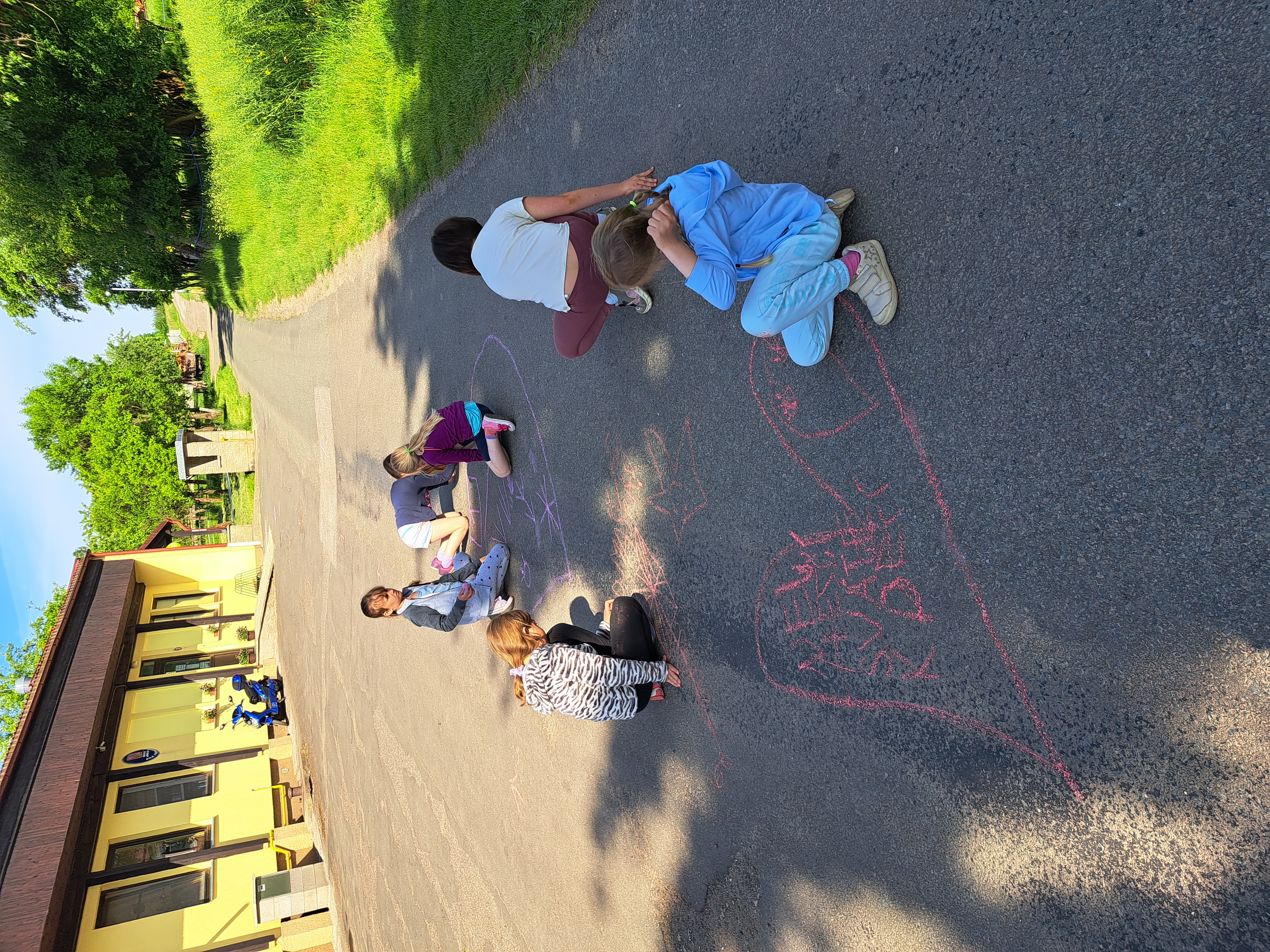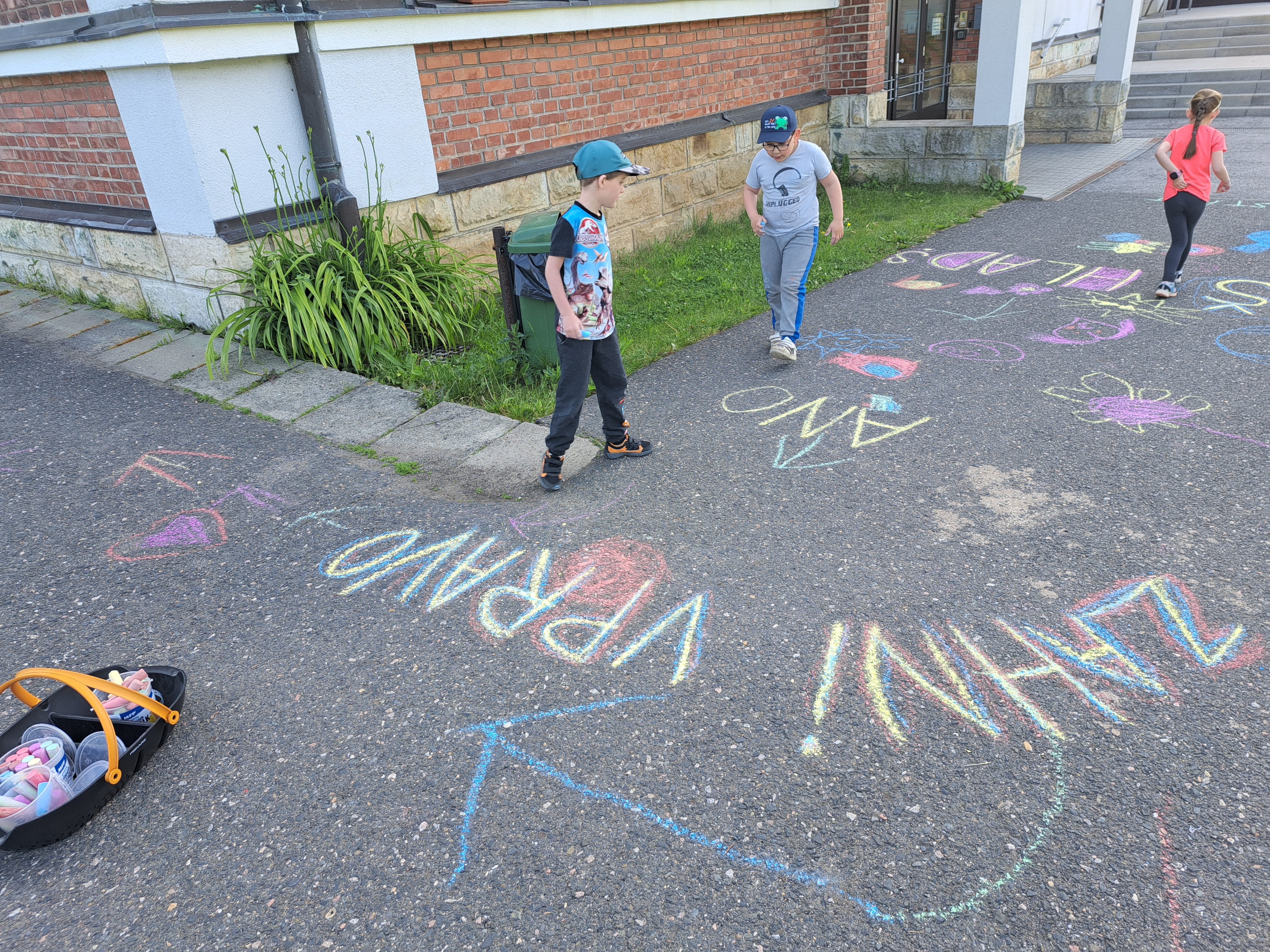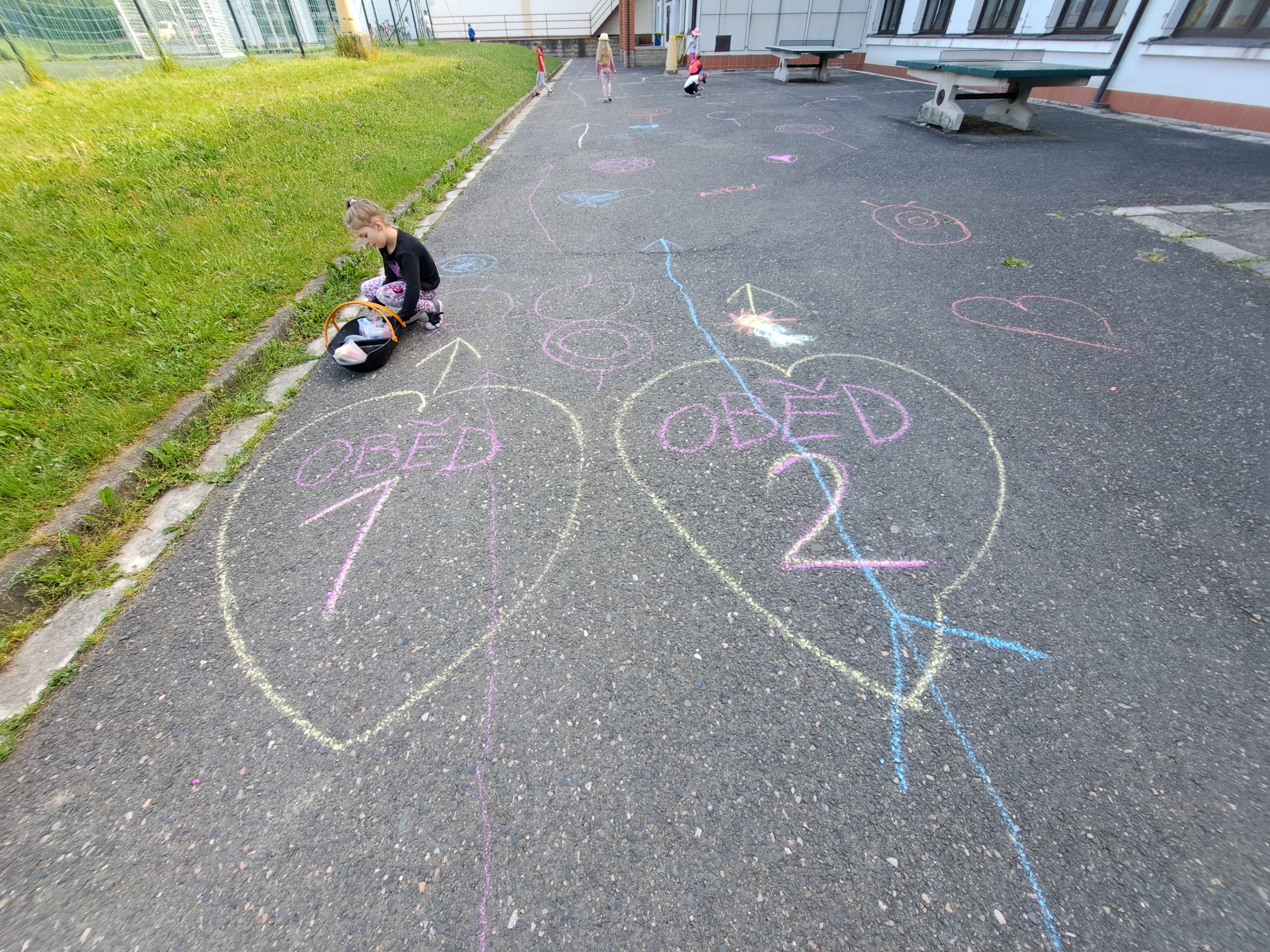 Na 1. června jsme s prvňáky na výtvarce vyrazili ven a nachystali barevnou cestu, která vedla od školy až k naší jídelně. Vzali jsme si křídy a pomocí nápisů a šipek jsme nakreslili tajemnou stezku. Nakreslili jsme i obrázky a panáky na skákání, aby se spolužáci cestou na jídlo i protáhli a více jim chutnal slavnostní oběd.