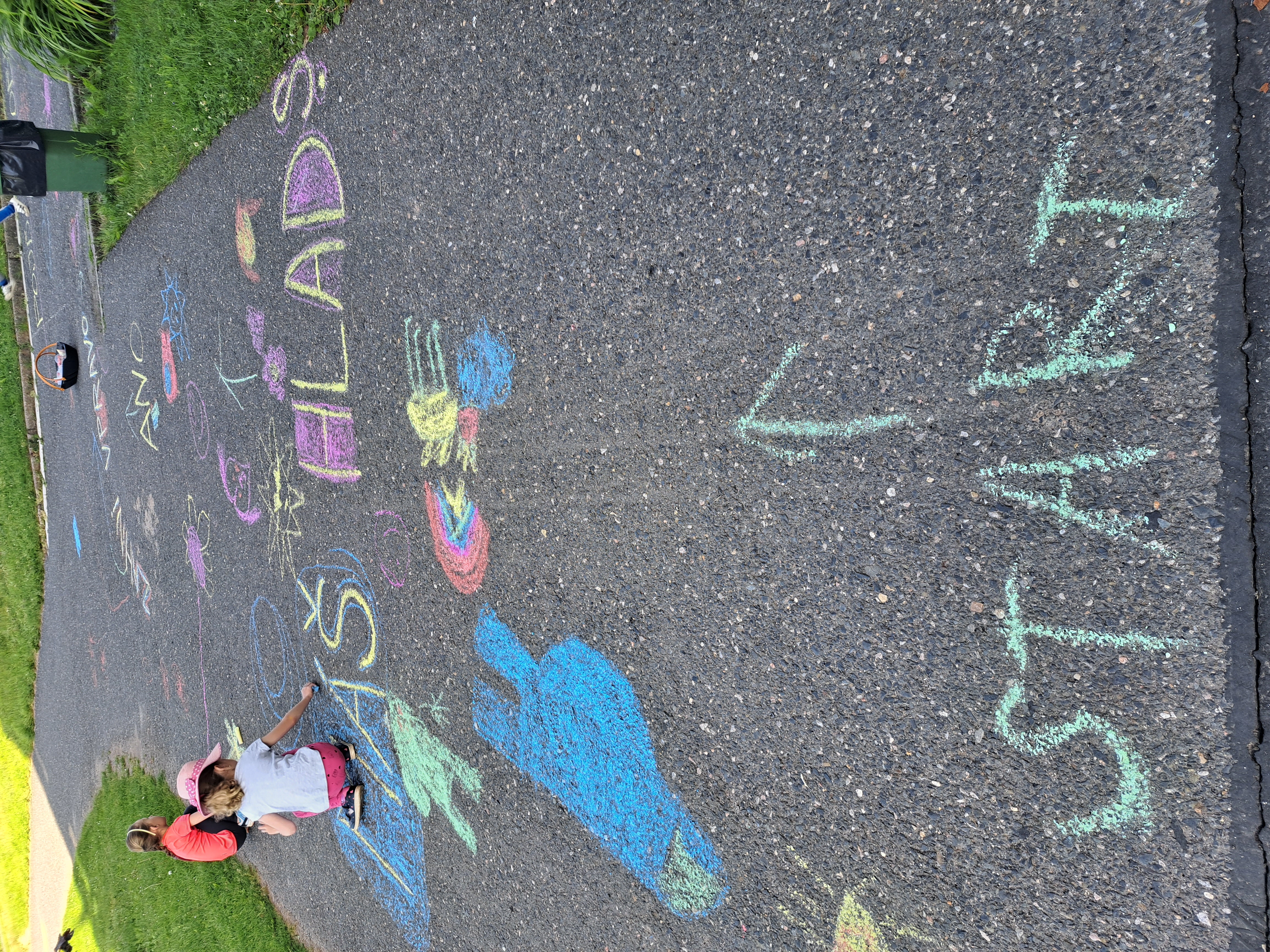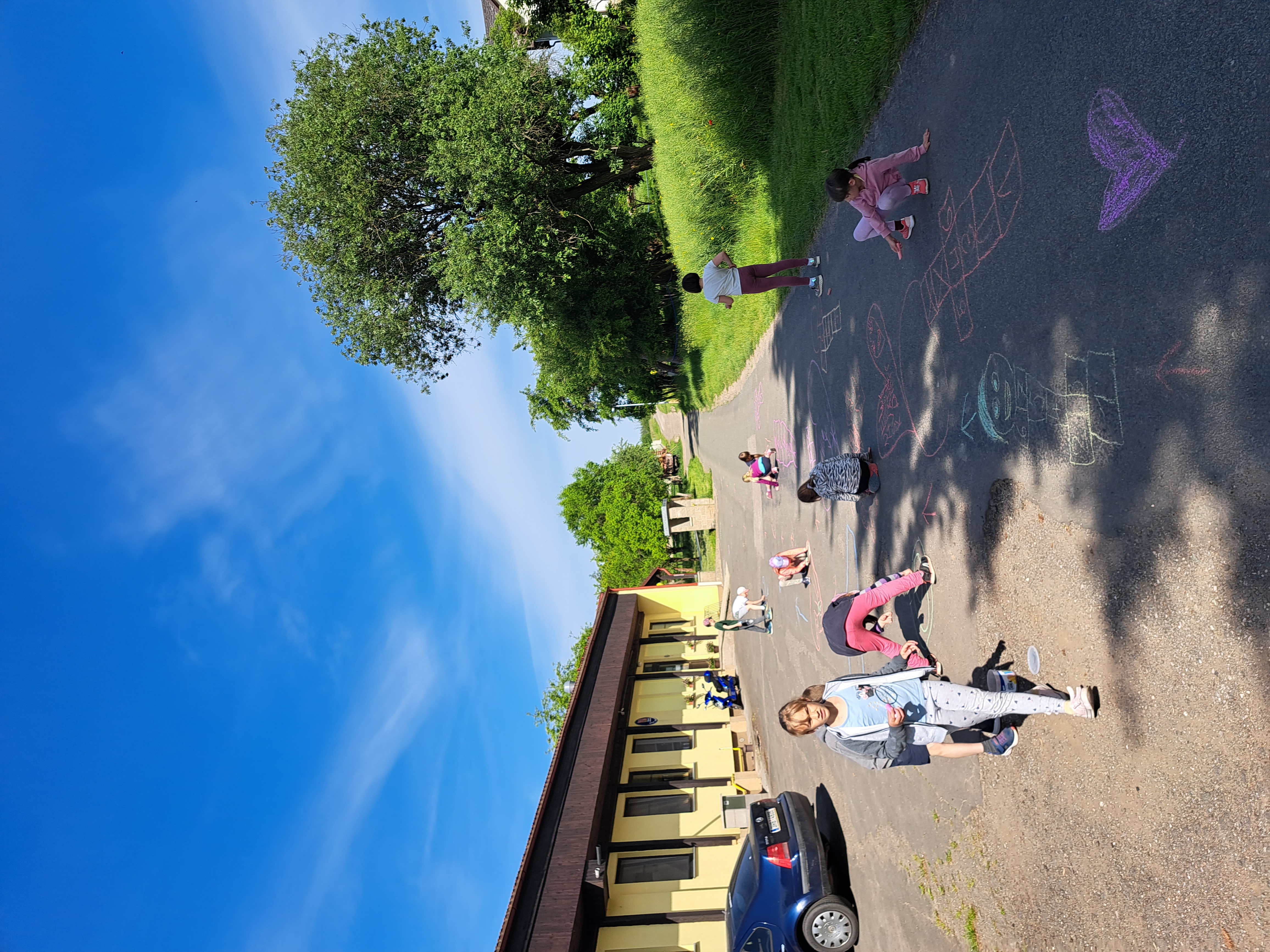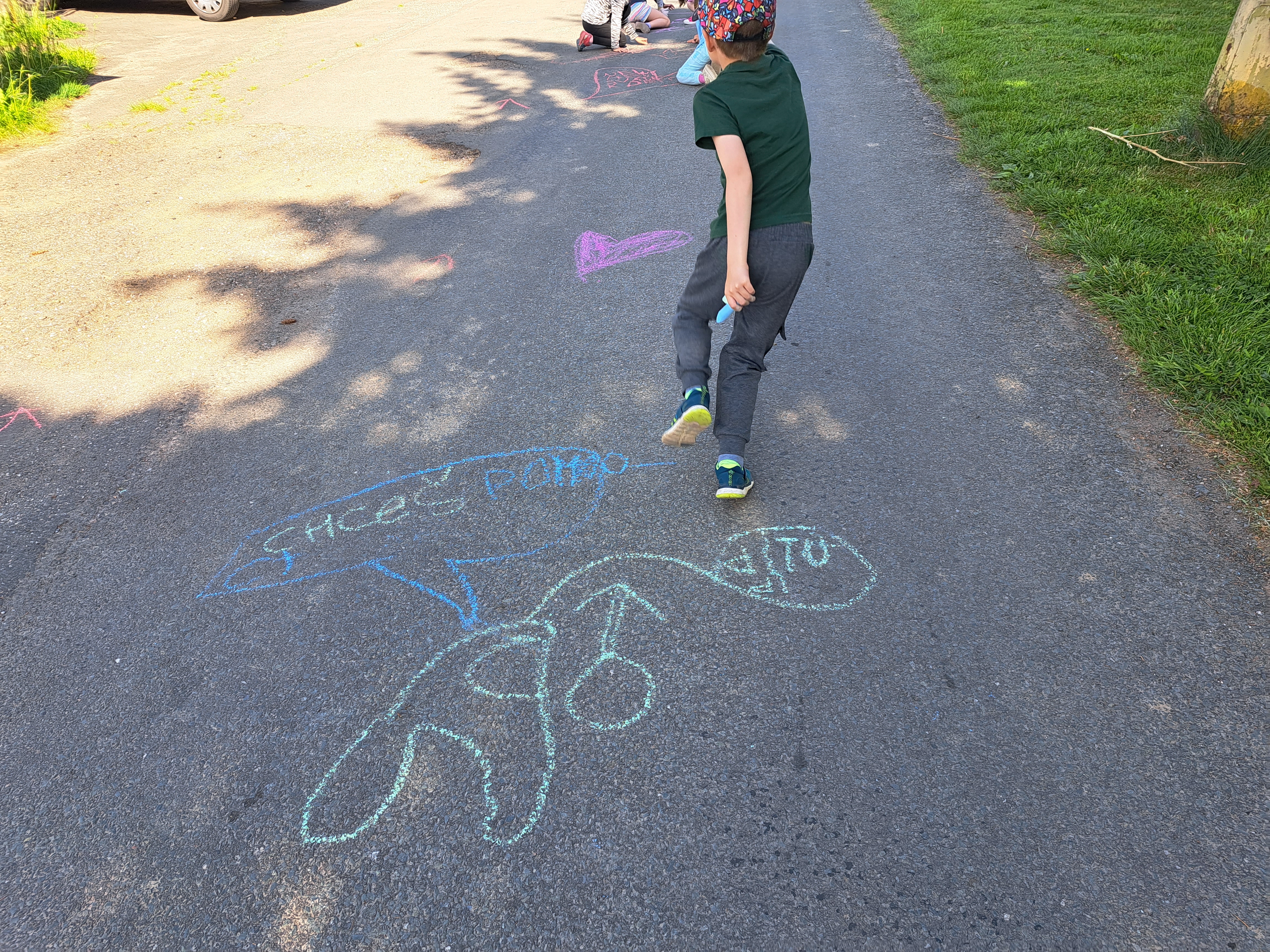 Na 1. června jsme s prvňáky na výtvarce vyrazili ven a nachystali barevnou cestu, která vedla od školy až k naší jídelně. Vzali jsme si křídy a pomocí nápisů a šipek jsme nakreslili tajemnou stezku. Nakreslili jsme i obrázky a panáky na skákání, aby se spolužáci cestou na jídlo i protáhli a více jim chutnal slavnostní oběd.