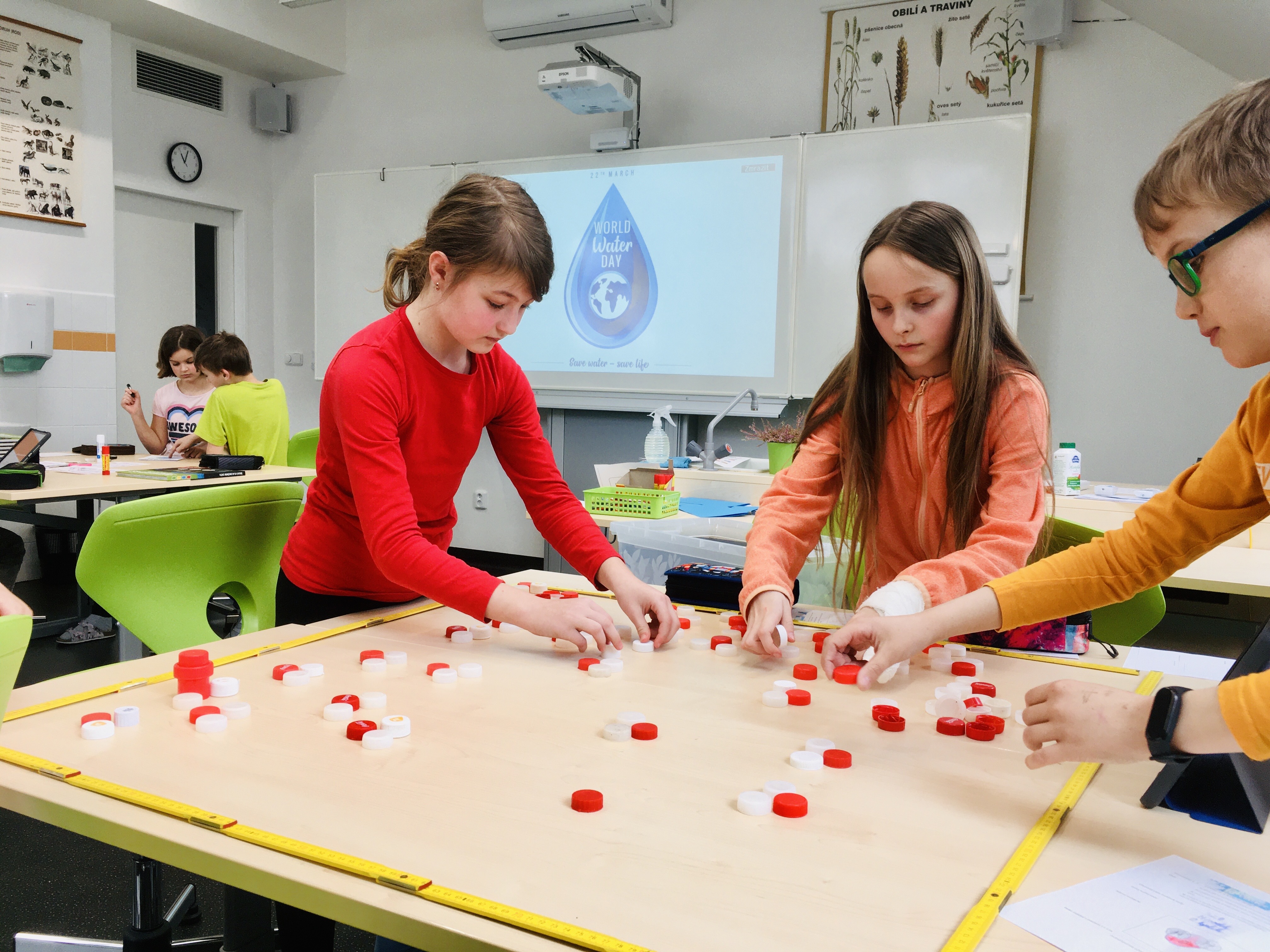 Nejinak tomu bylo i v naší organizaci. Pro 4. – 9. třídu se sloučenina se vzorcem H2O, stala náplní hodiny přírodopisu. Pro žáky bylo nachystáno několik stanovišť, kde ve skupinkách zkoumali vodu z různých pohledů. Prohledávali světové mapy, o vodu si říkali v cizích jazycích, vážili vodu, skládali molekuly vody do prostoru nebo se snažili co nejvíce špinavé vody přefiltrovat. Celé snažení zaznamenávali do připravených archů, které zakládali do vlastnoručně tvořených desek. Vše mělo charakter bodovací soutěže, kdy si nejlepší týmy (viz. foto) v mladší (4.-6. tř.) i starší (7.-9. tř.) kategorii odnesly, kromě cenných zkušeností, i drobné ceny a něco na zub.