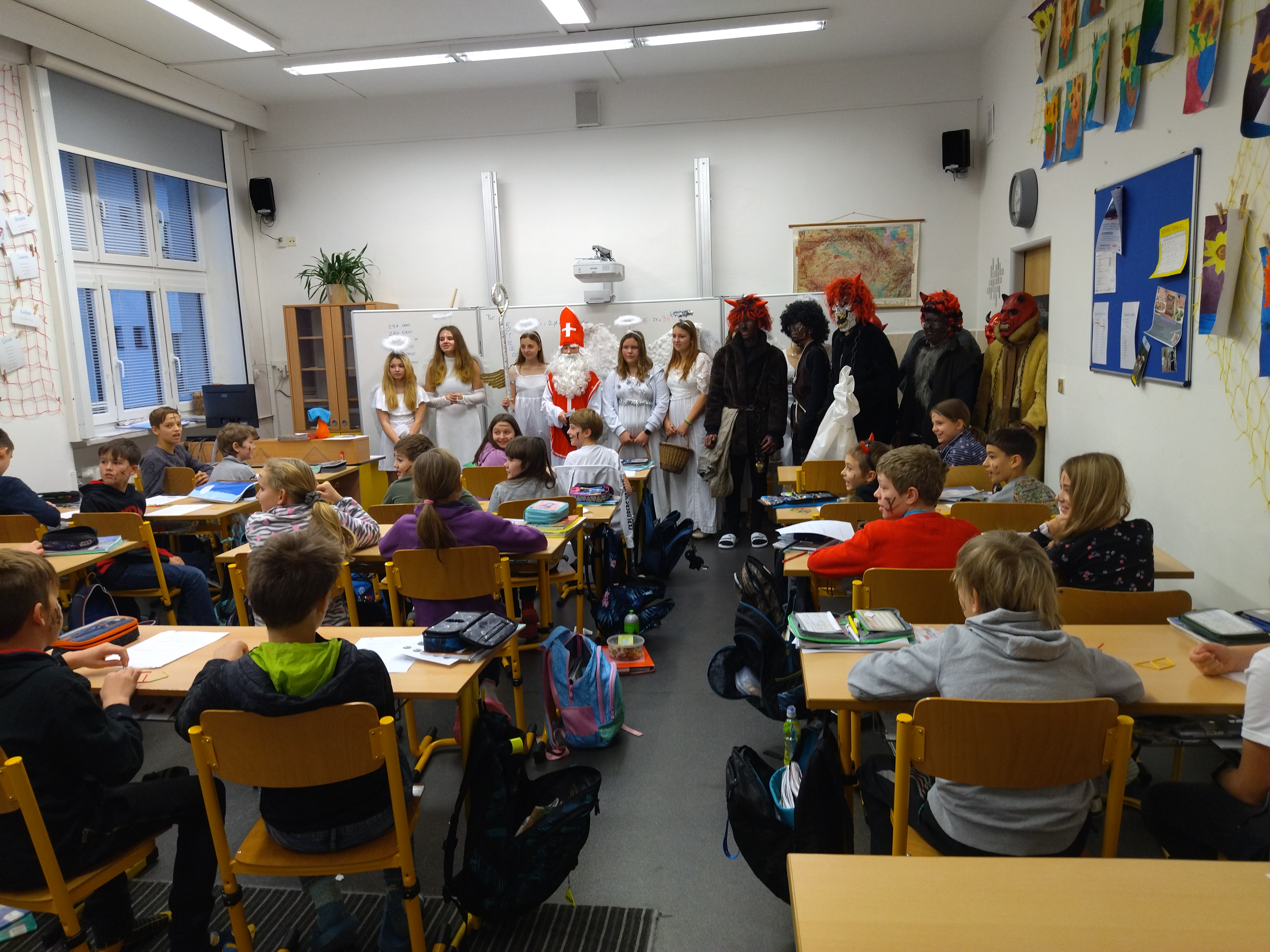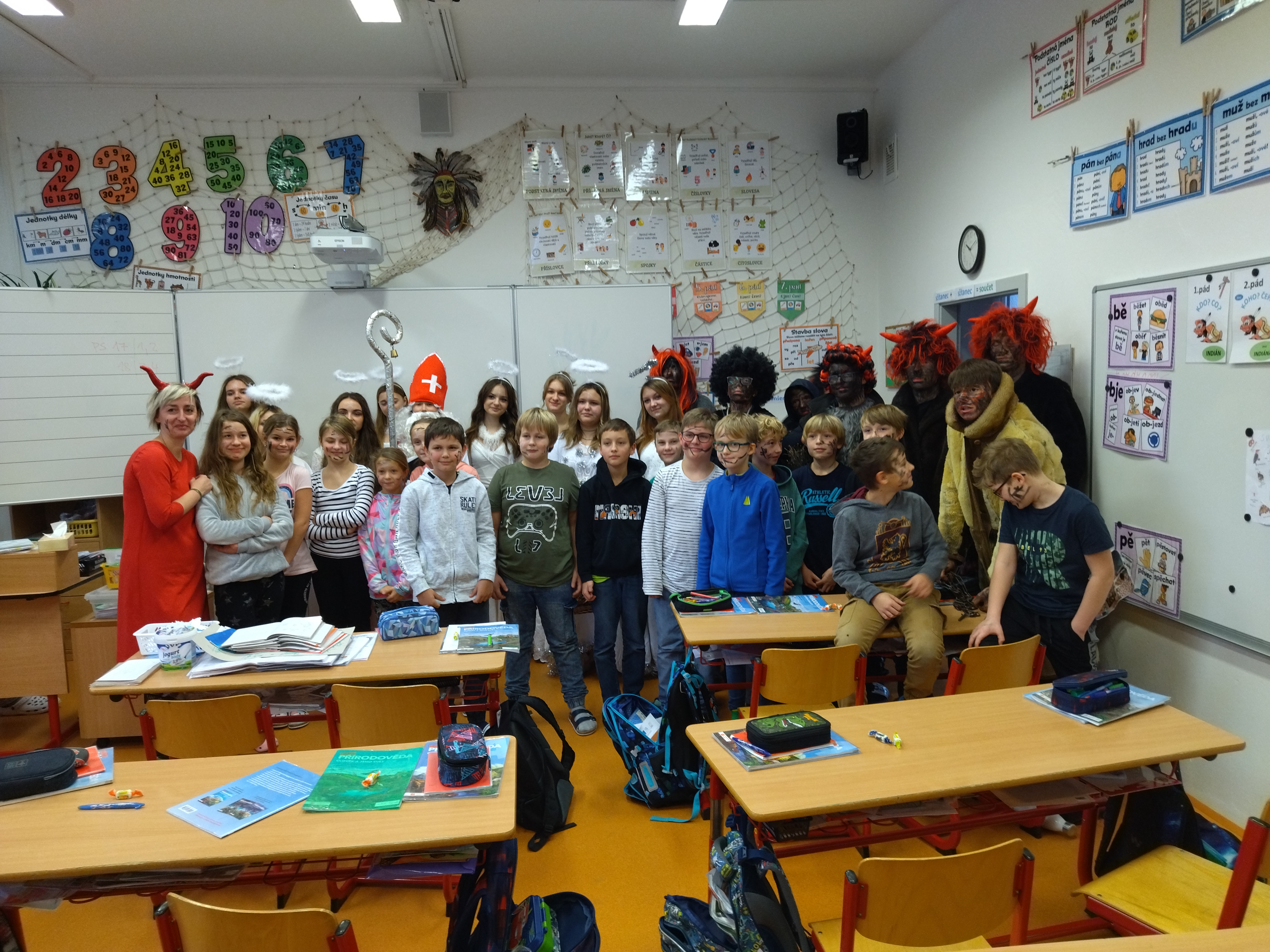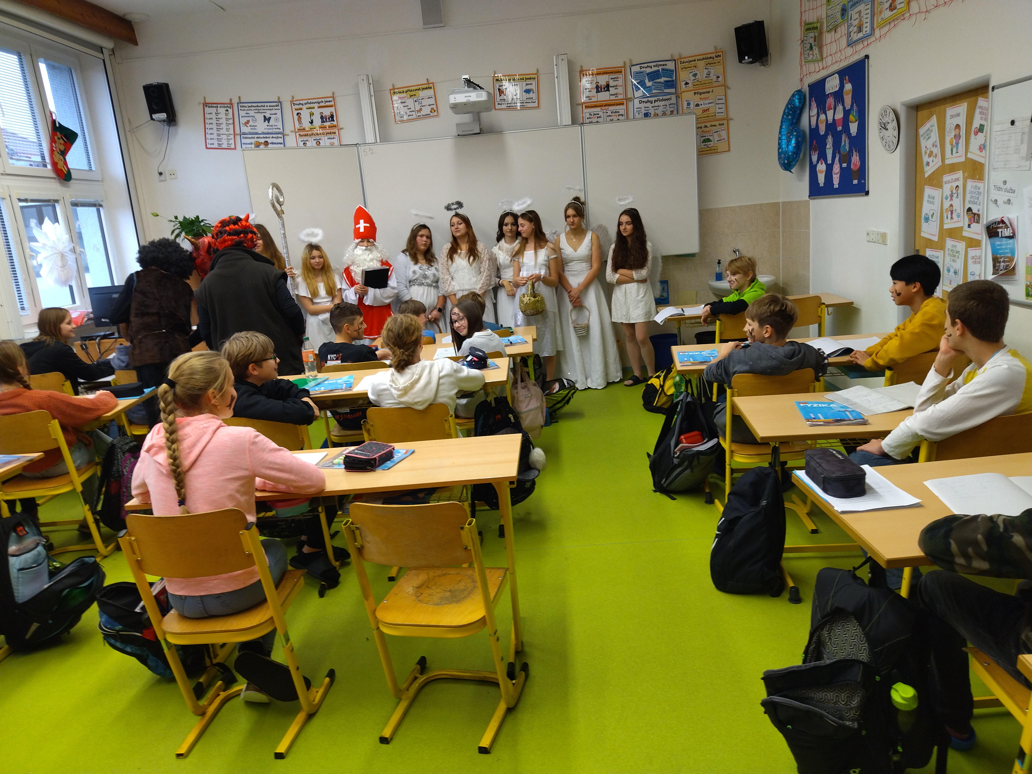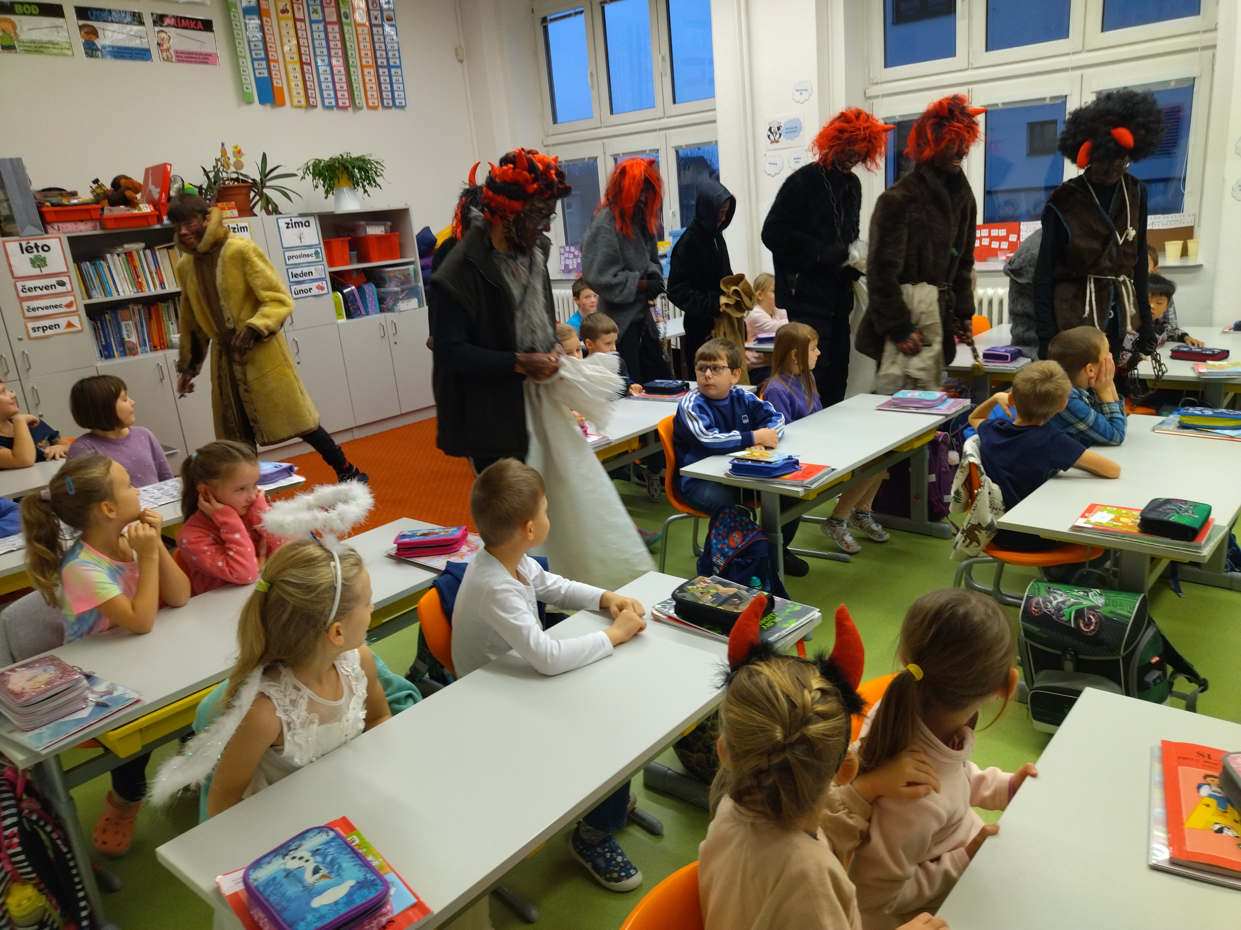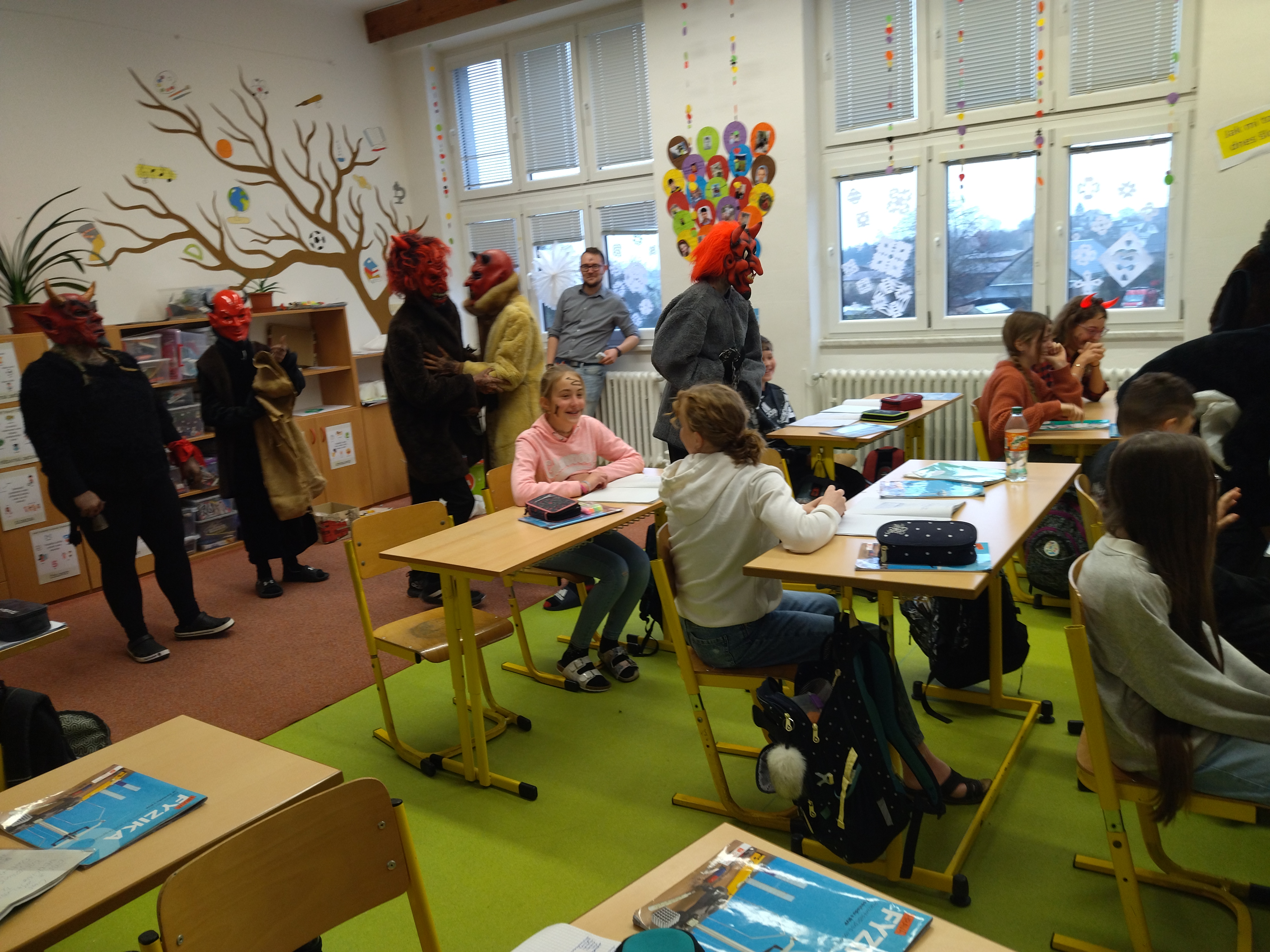 Během pondělního dopoledne jste mohli zaslechnout v budovách ZŠ i MŠ neobvyklé řinčení řetězů a cinkání nejrůznějších zvonečků. To se k nám opět po roce přišla podívat nadpřirozená družina ve standardní sestavě reprezentovaná jedním Mikulášem a letos velkým množstvím čertů i andělů.