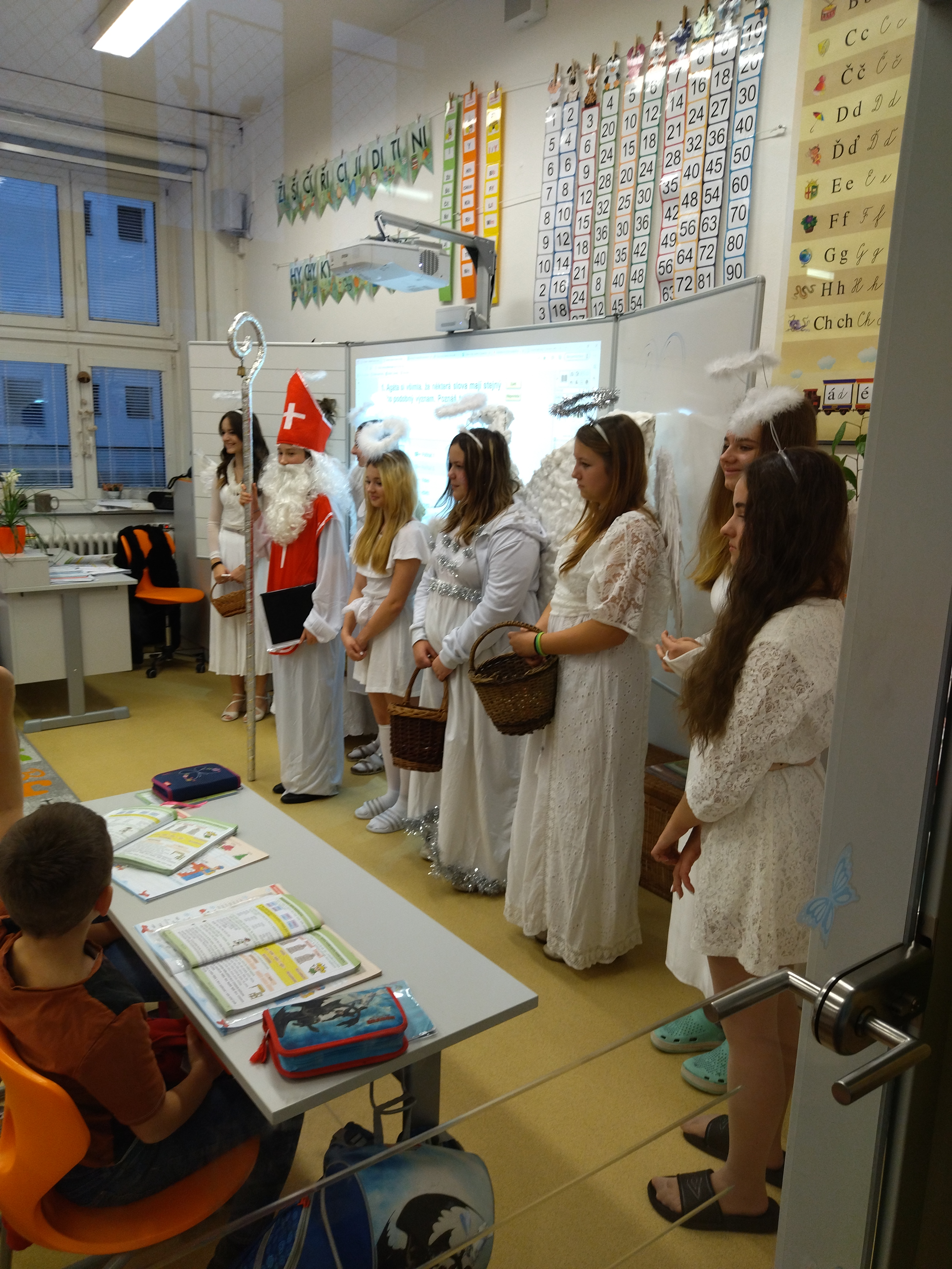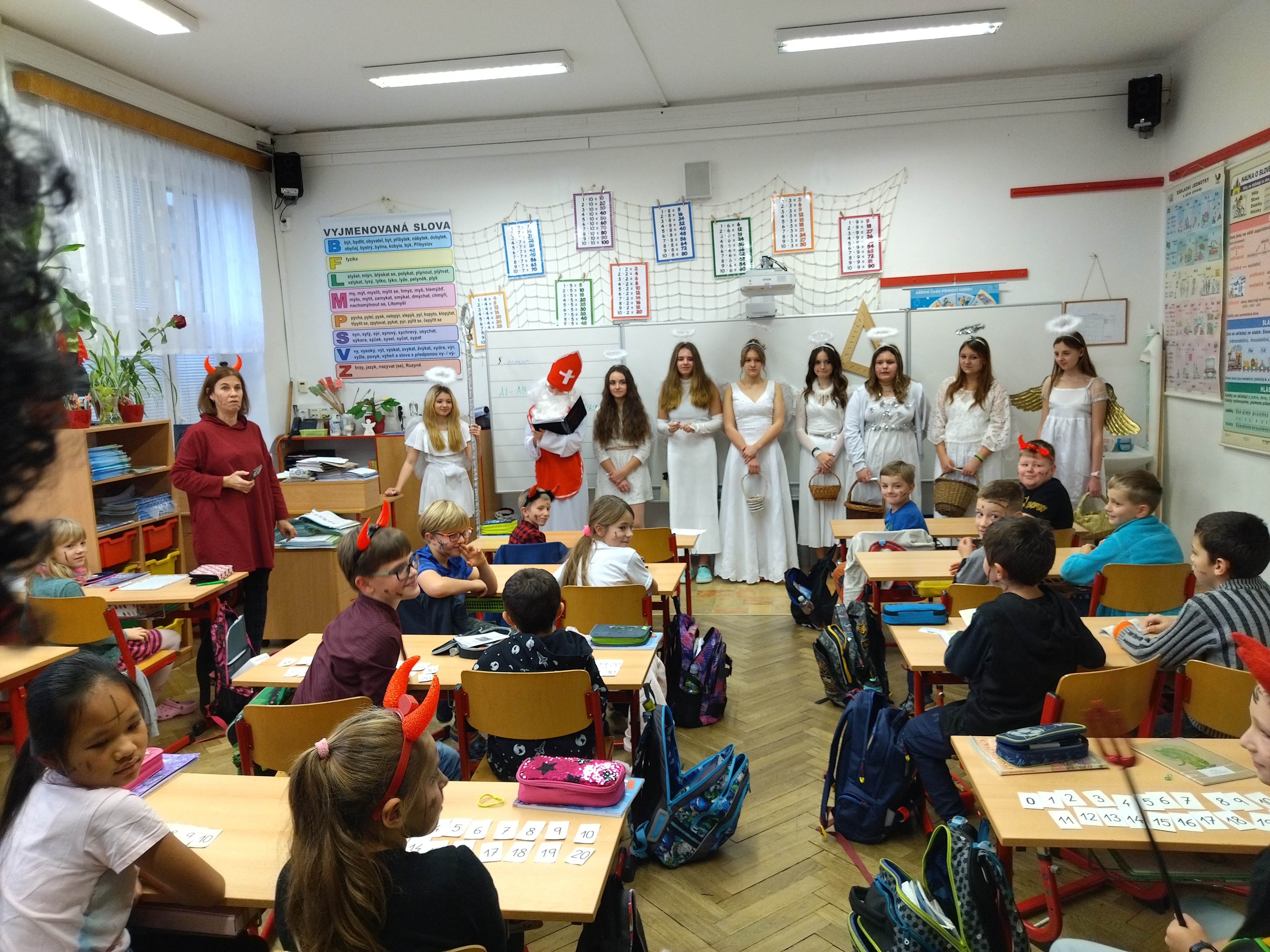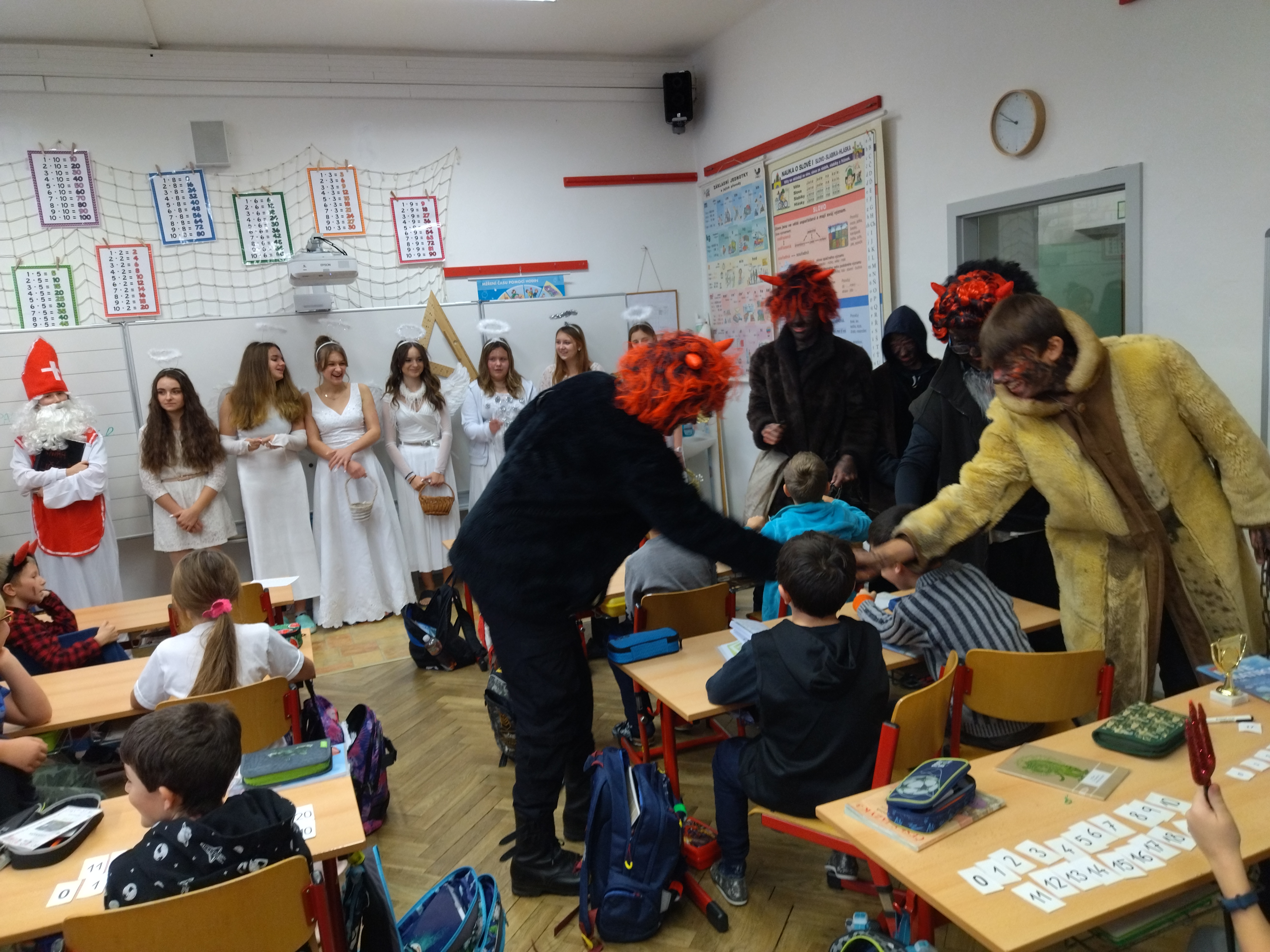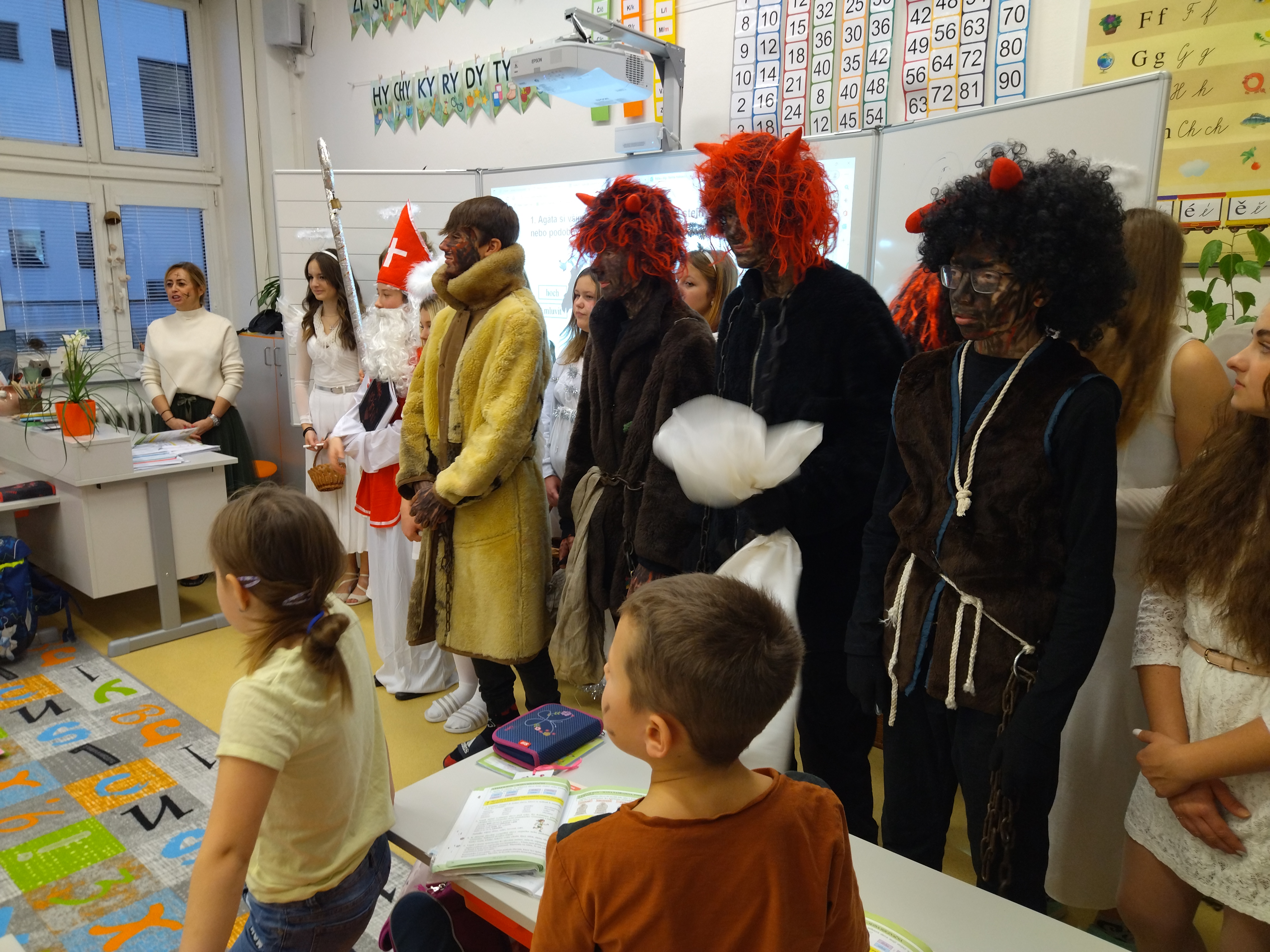 Postupně tito vyslanci nadpřirozených světů obešli všechny třídy a hlavně na menších dětech bylo vidět, že ne vždy je zejména přítomnost zástupců pekelné říše vítaná. Přesto se snažily ve většině případů zachovat dekórum a po zpěvu písniček se ze svých ,,hříšků“ včas vykoupily. Odměnou jim pak všem byly bonbonky rozdávané hodnými a krásnými anděly. Vševědoucí slova přísného, ale vlídného Mikuláše dávala tušit, že mu žádné lidské konání neujde a jen uvědomění si svých vlastních chyb nás všechny může posunout dál.