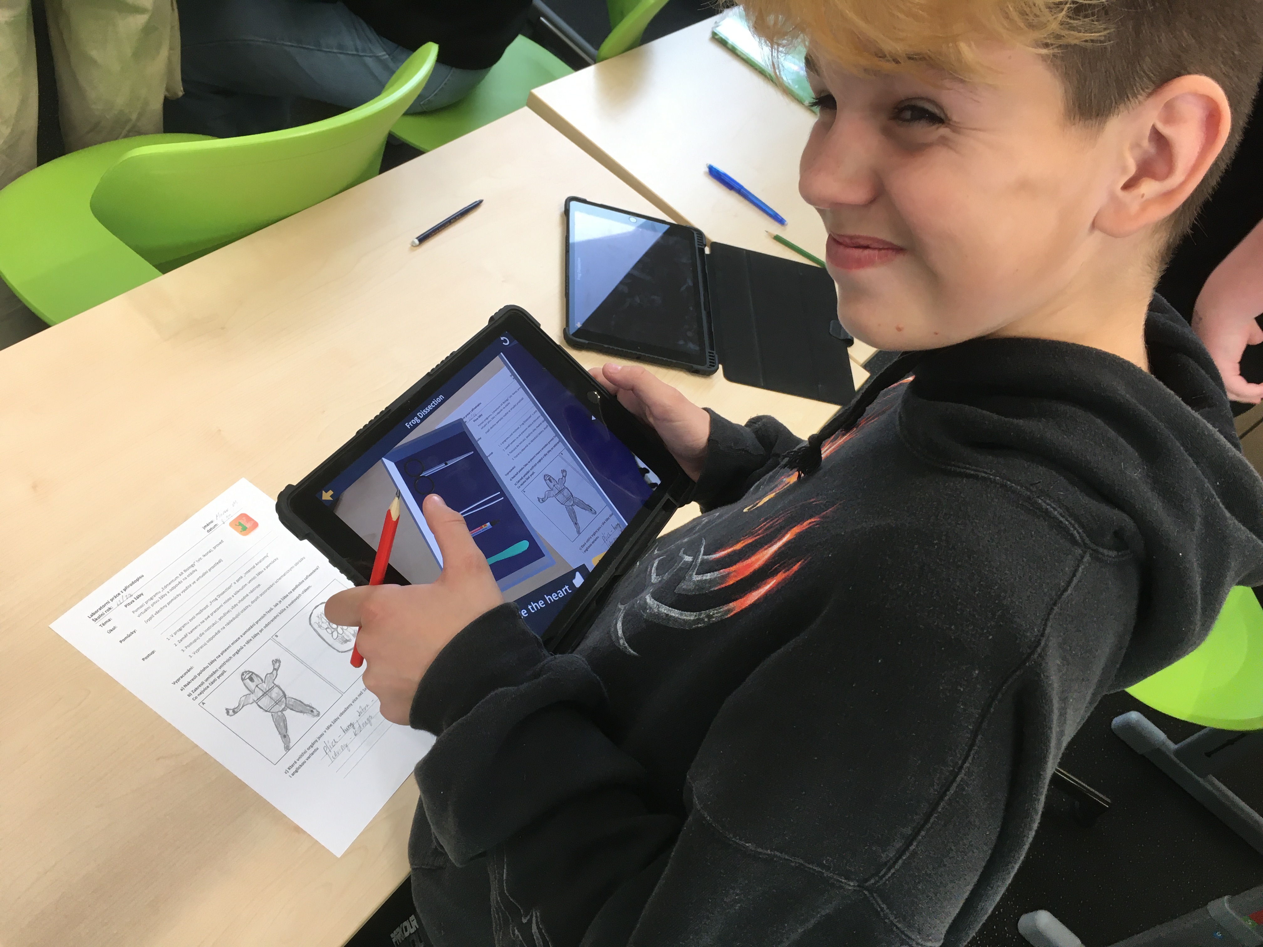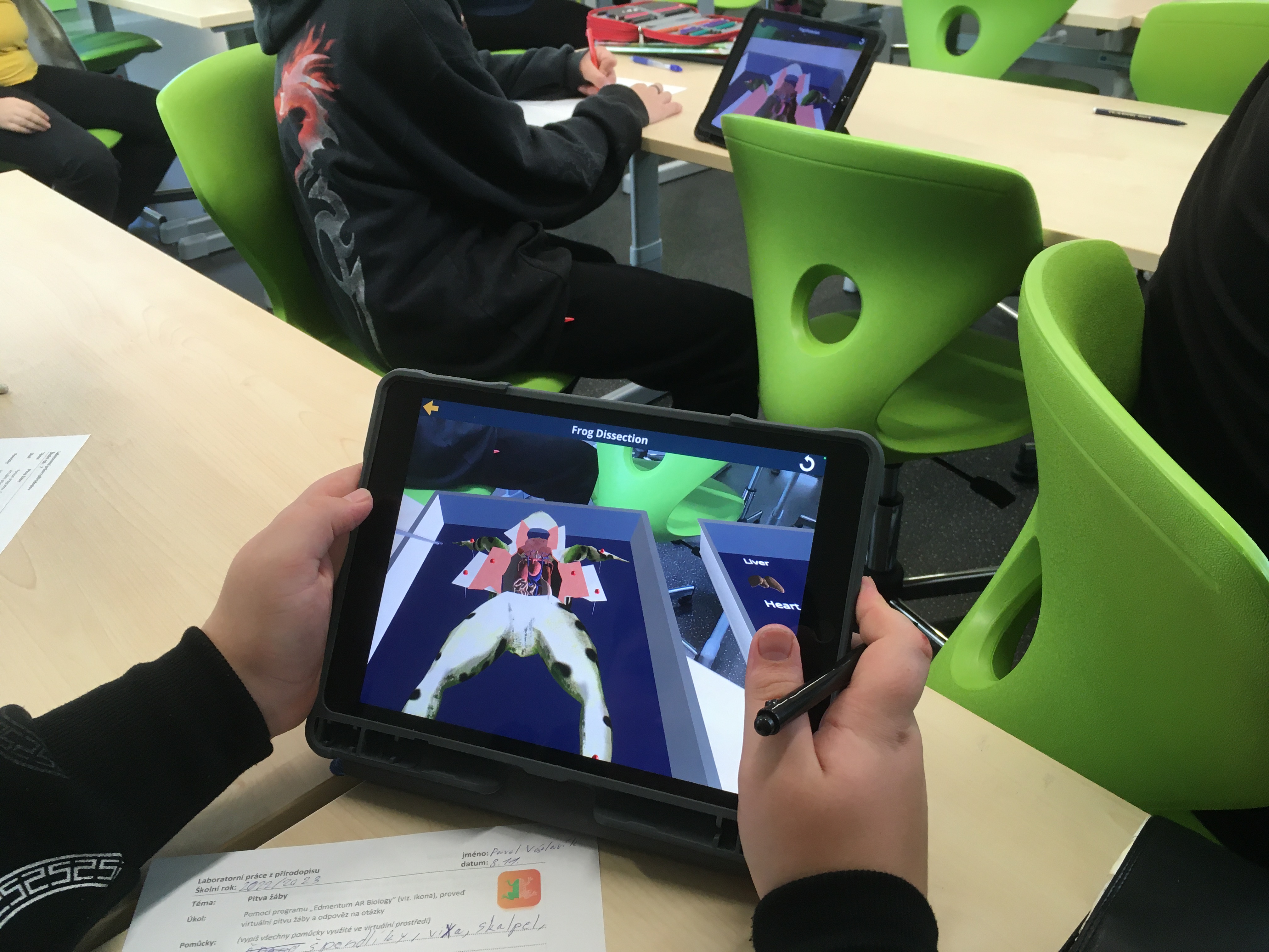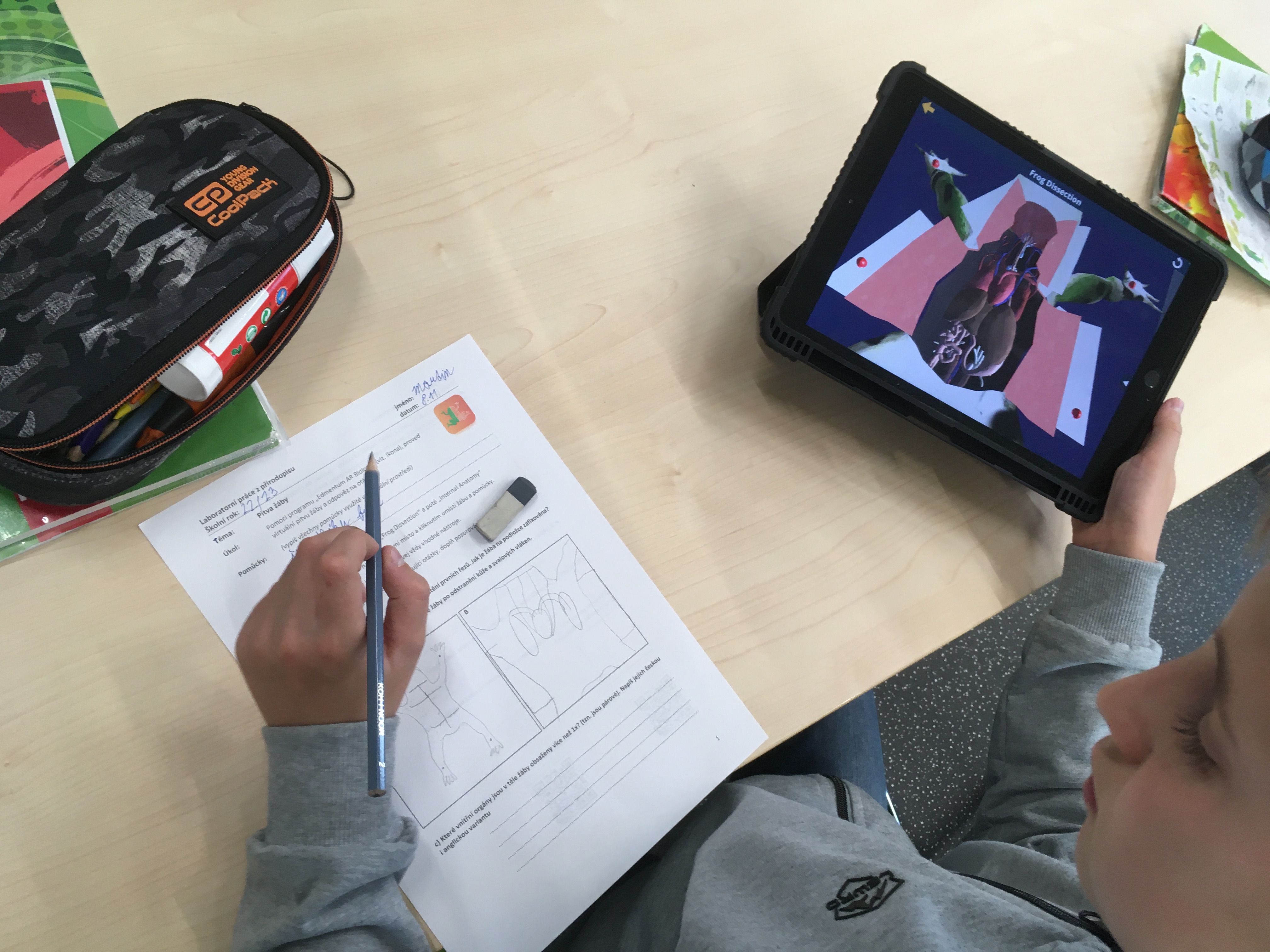Touha po znalosti stavby těla nejrůznějších životních forem provází člověka od nepaměti. Možnost podívat se do nitra některých probíraných organismů se nabízí žákům v hodinách přírodopisu. Po laboratorních úlohách zaměřených na tělní pokryv savců či ryb, byla dnes pro sedmáky nachystána trochu odlišná úloha. Učivo o obojživelnících bylo obohaceno o pitvu žáby. A přestože by i tady byla jistě zajímavá pitva klasická, se všemi jejími náležitostmi, vyzkoušeli jsme z prozaických důvodů virtuální možnost. Díky rozšířené realitě a iPadům měl i tak každý žák „na stole“ vše potřebné. Žáci si vyzkoušeli posloupnost jednotlivých postupů, zopakovali laboratorní náčiní a v neposlední řadě i nahlédli do nitra samotné žáby, ze které vypreparovali dílčí orgány. O nich pak nabízela aplikace i další, zajímavé informace. Vše schematicky znázorňovali do laboratorních protokolů a získané vědomosti nakonec uplatnili v on-line kvízu. Nutno podotknout, že se jednalo o premiéru, která ale dopadla na výbornou – jak co se týče časového, tak i obsahového rozložení. Zájem a zaujetí žáků rovněž naznačil, že jde o dobrou a nenásilnou variantu, která může sloužit jako vhodný doplněk ke „klasickému“ zkoumání.