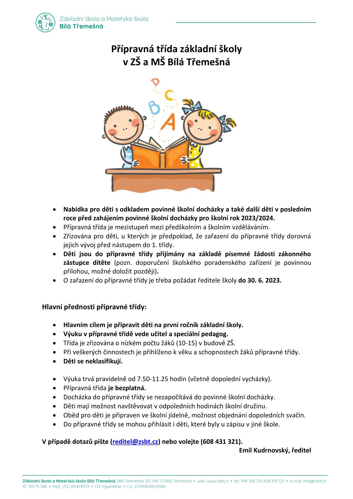 Přípravná třída základní školy v ZŠ a MŠ Bílá Třemešná pro děti s odkladem povinné školní docházky a také další děti v posledním roce před zahájením povinné školní docházky pro školní rok 2023/2024.