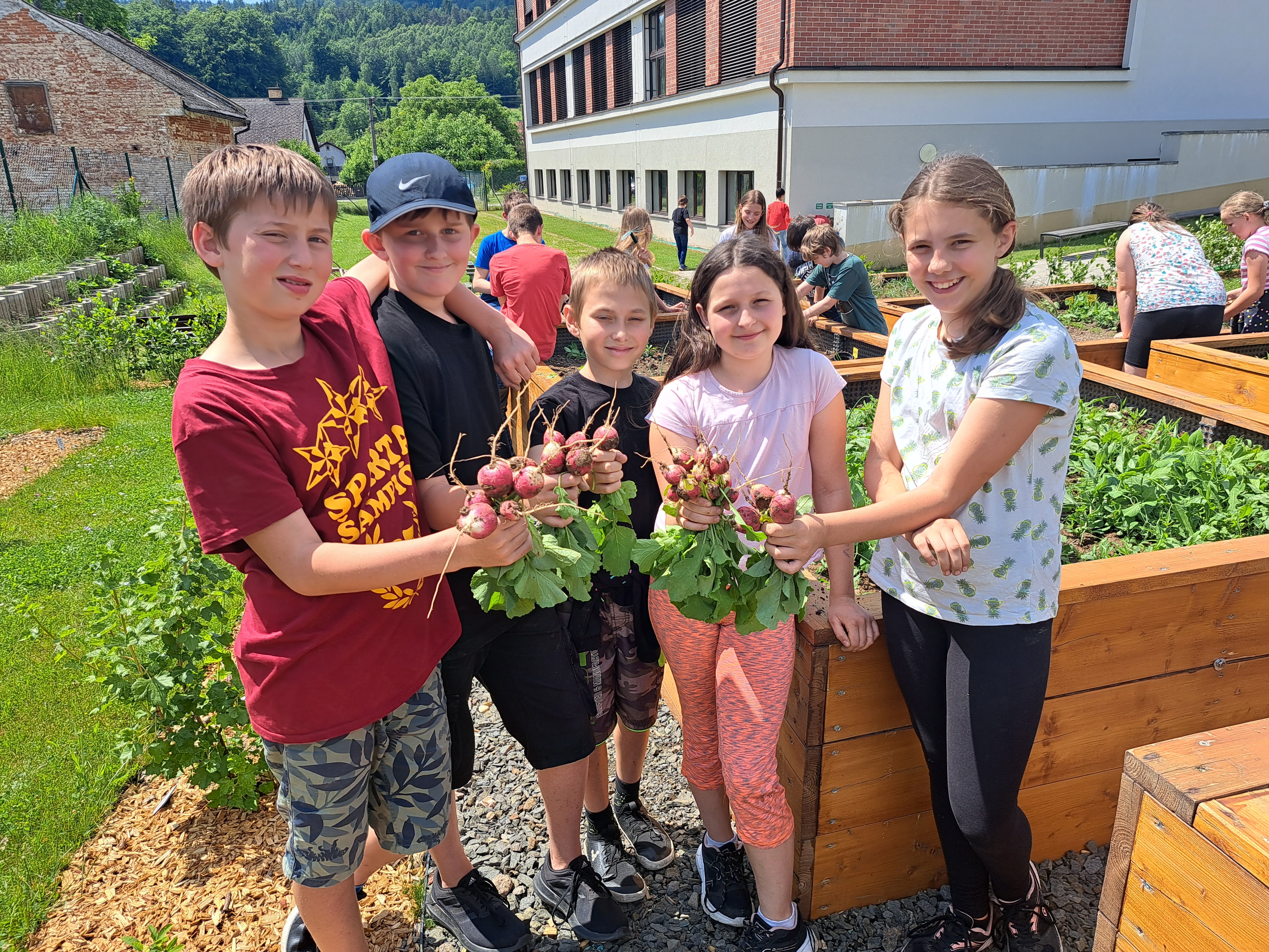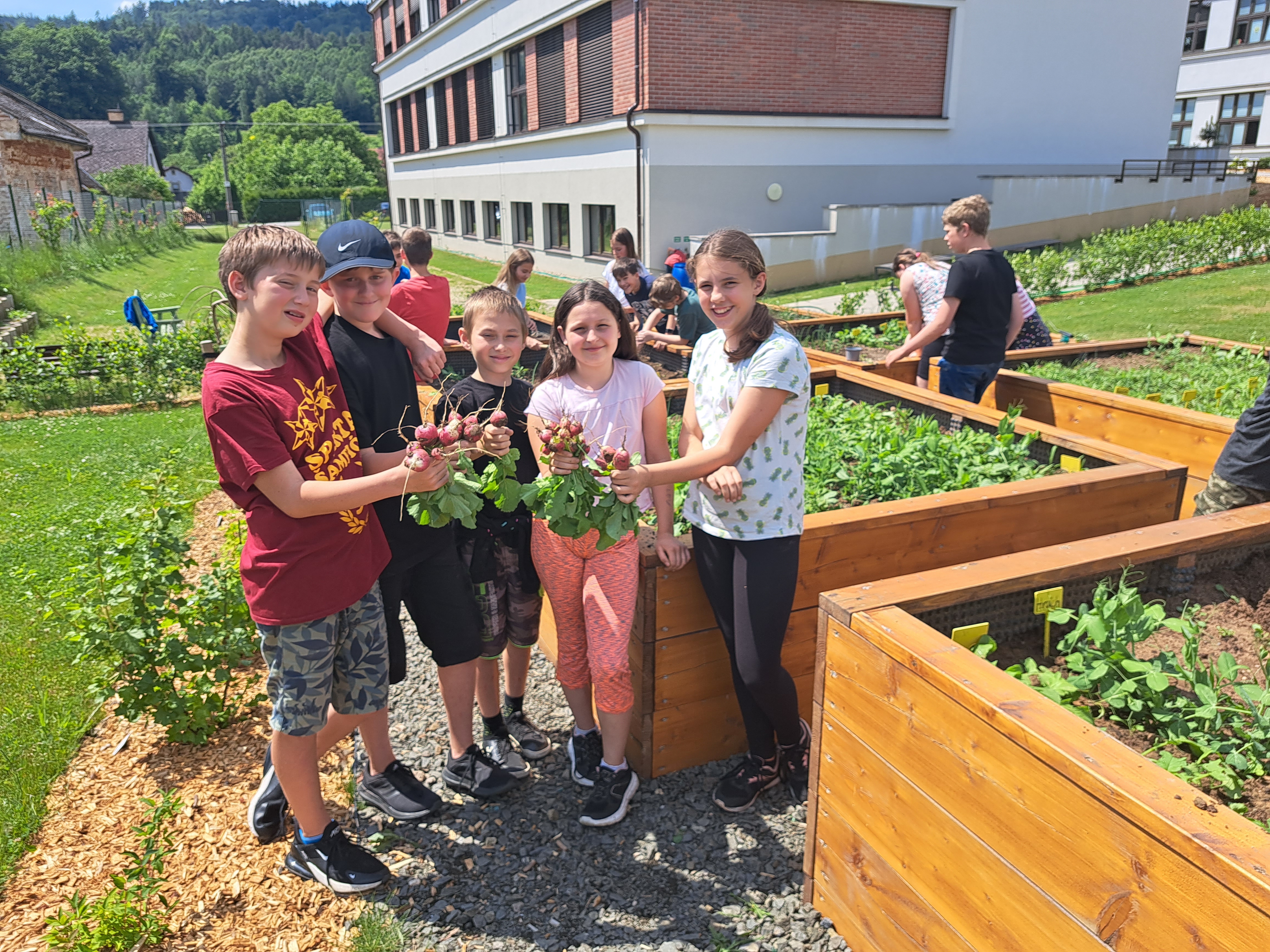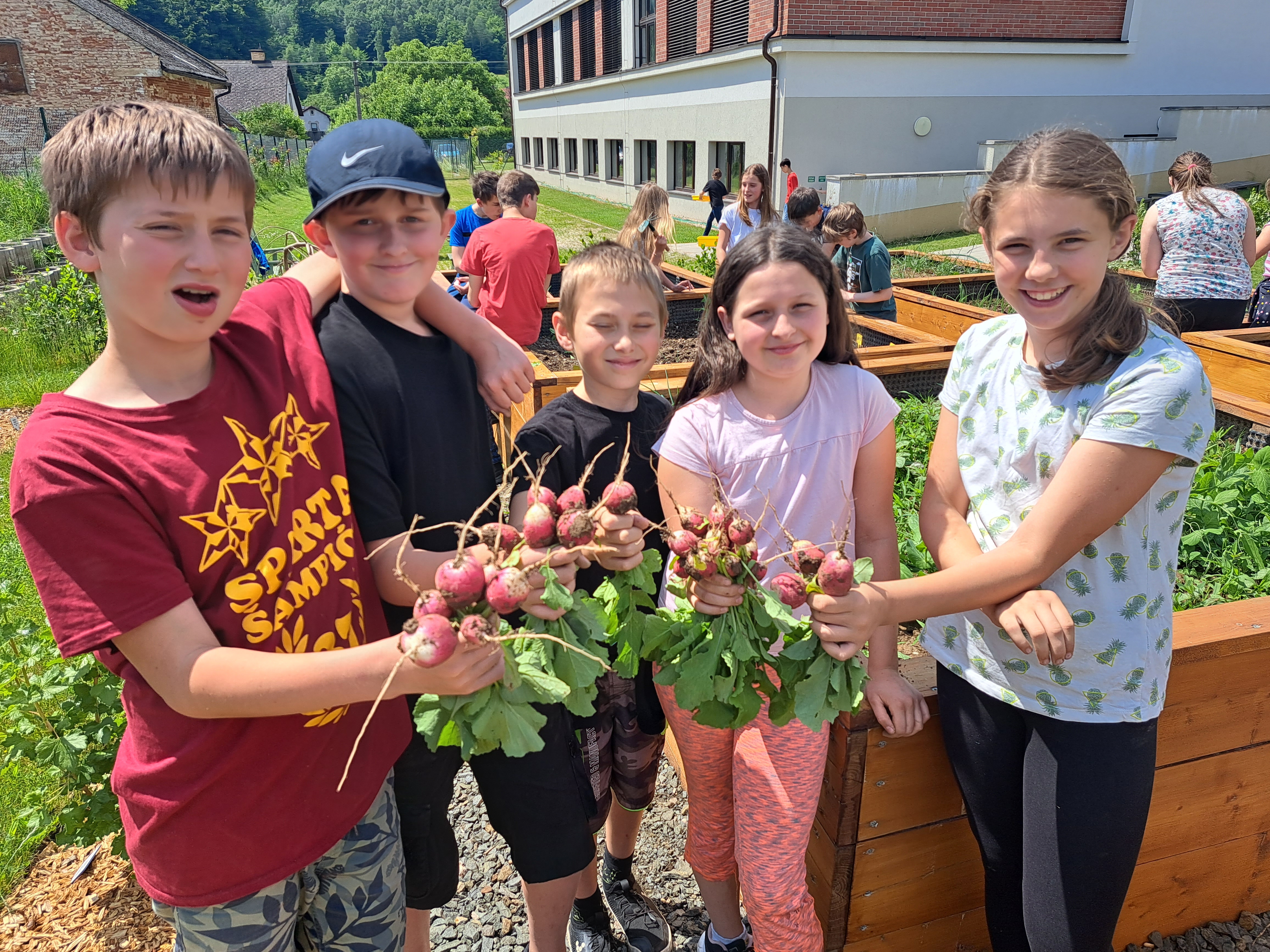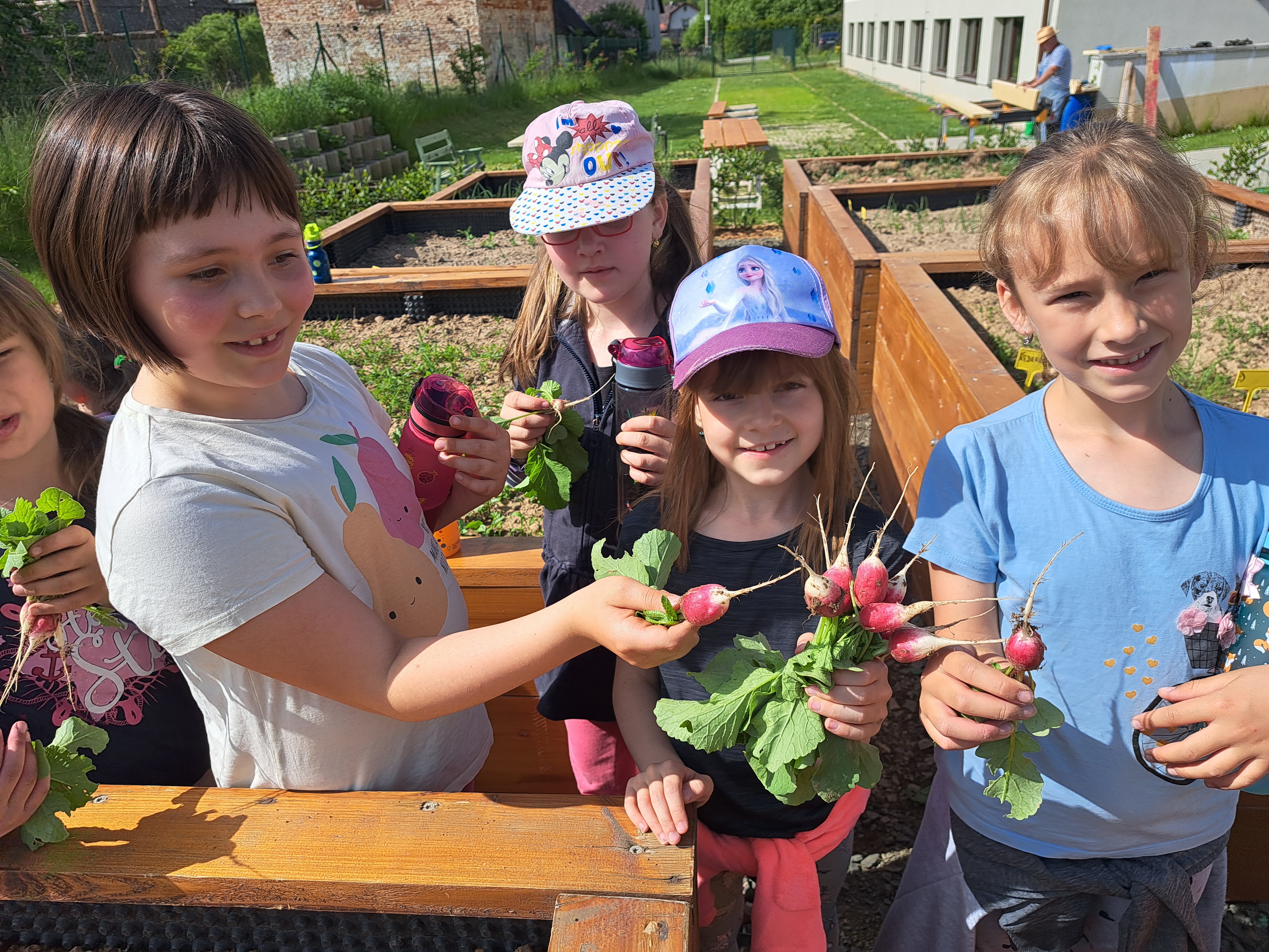 Na naší školní zahradě vyrostlo 8 nadzemních záhonů a naším úkolem bylo je osázet. Letos se nám z hlíny klube hrášek, řepa, mrkev, cibule, ředkvičky a slunečnice. Ze semínek jsme předpěstovali lilky, cukety a dýně. O pracovních činnostech se o ně staráme, okopáváme, plejeme a zalíváme. Obrovskou radost už zažily třídy, které mohly sklízet první ředkvičky, které letos narostly do gigantických rozměrů. K jídlu už jsou i jahůdky a hrášek na sebe nenechá dlouho čekat.