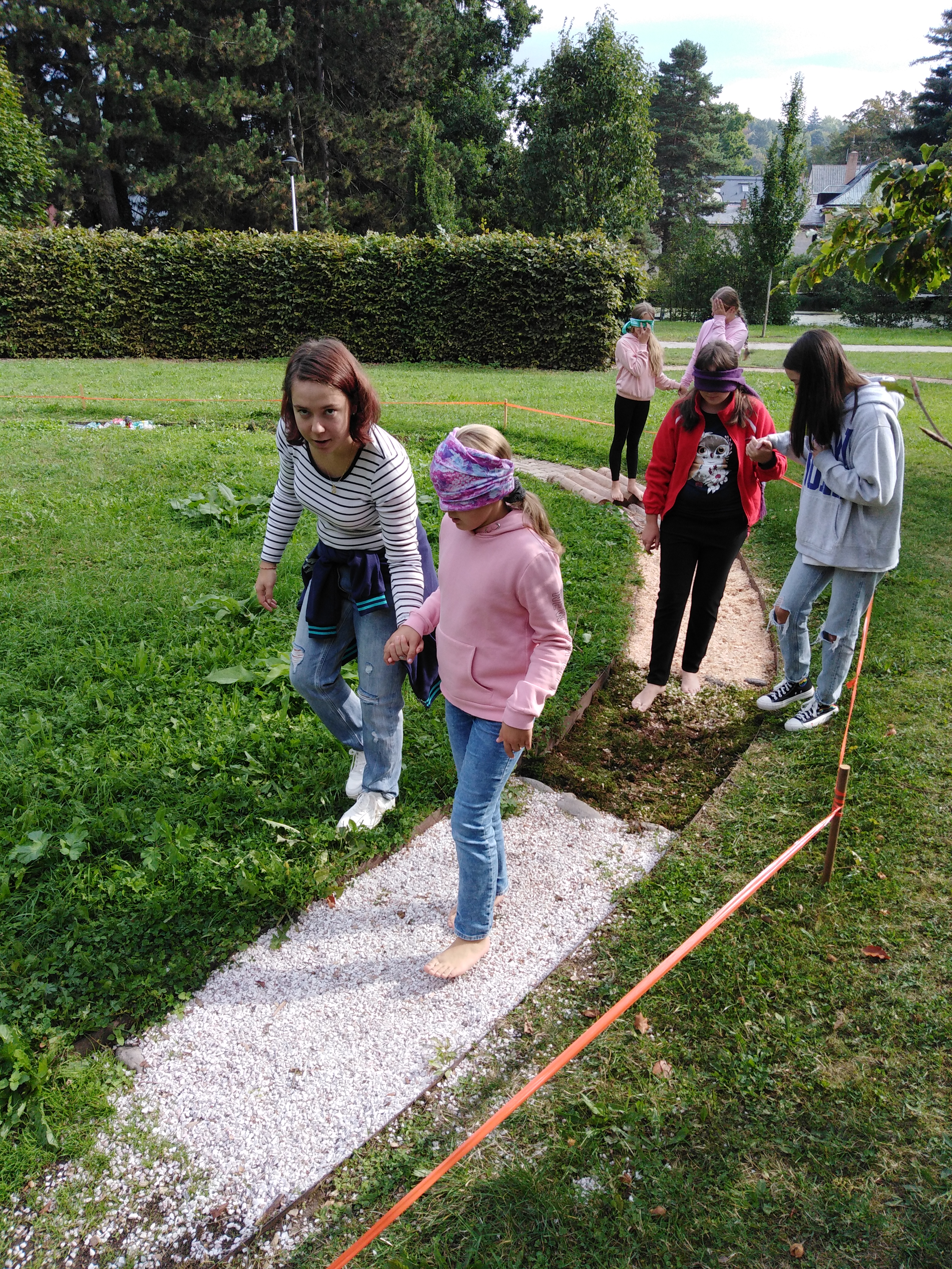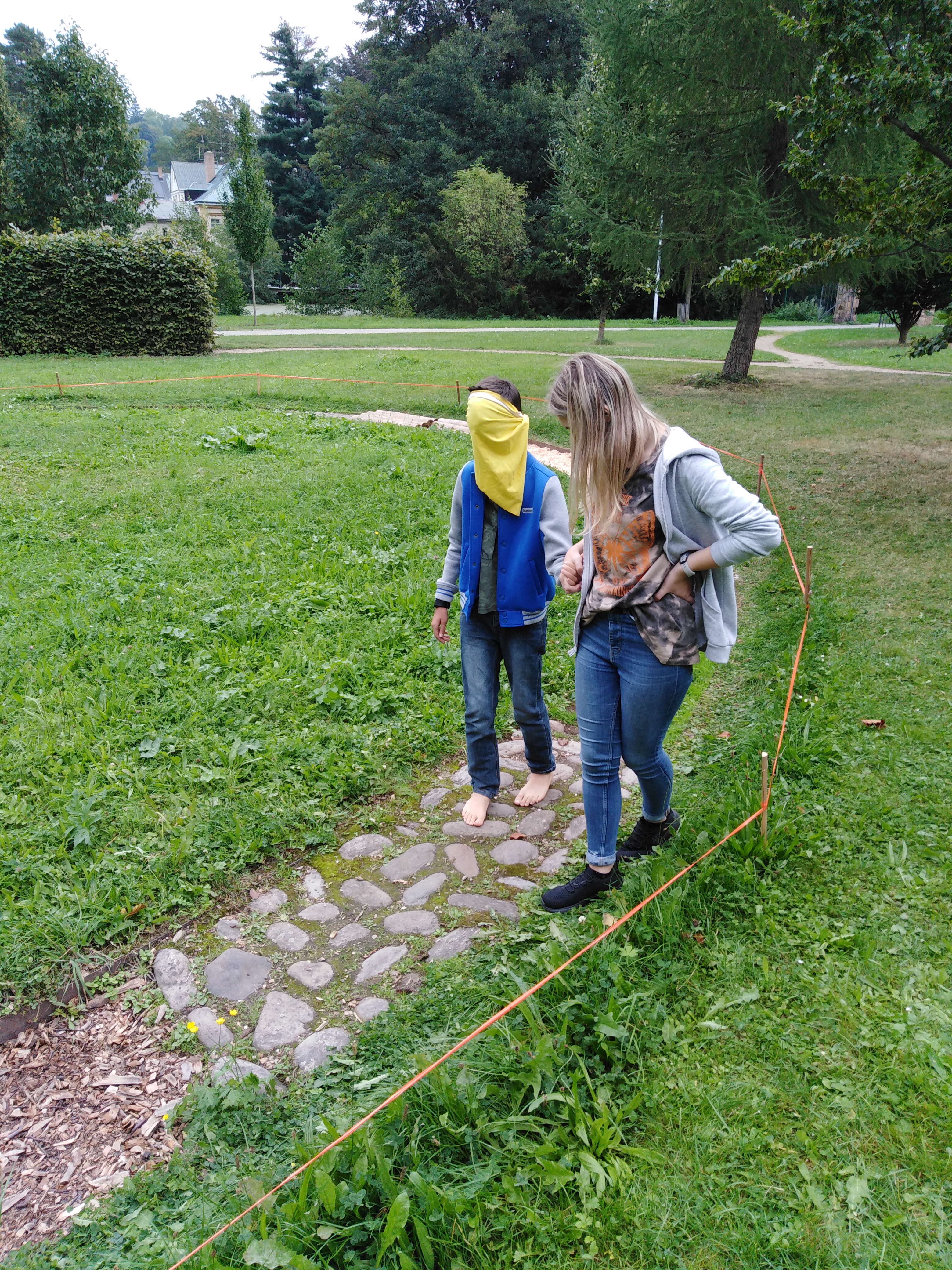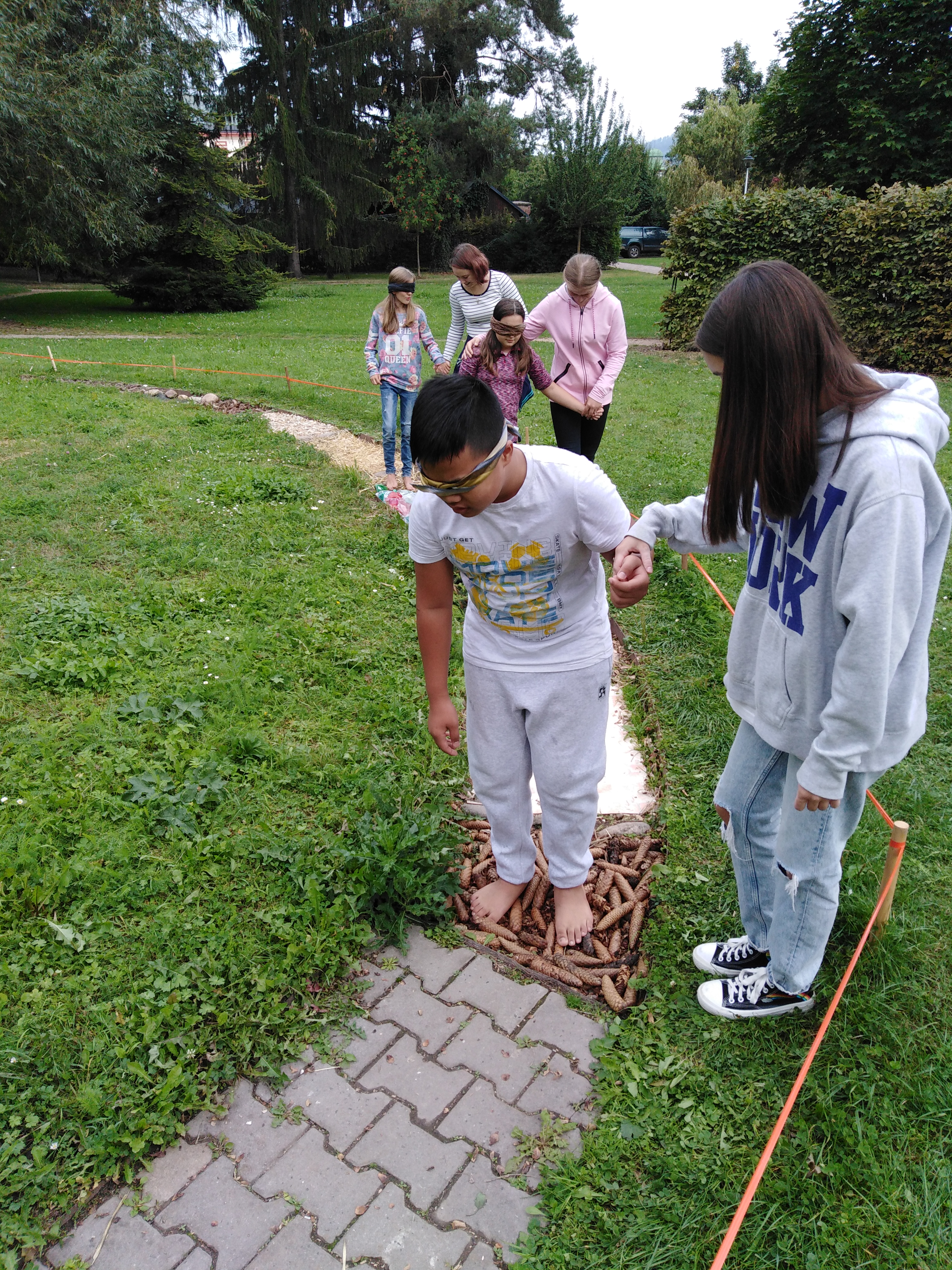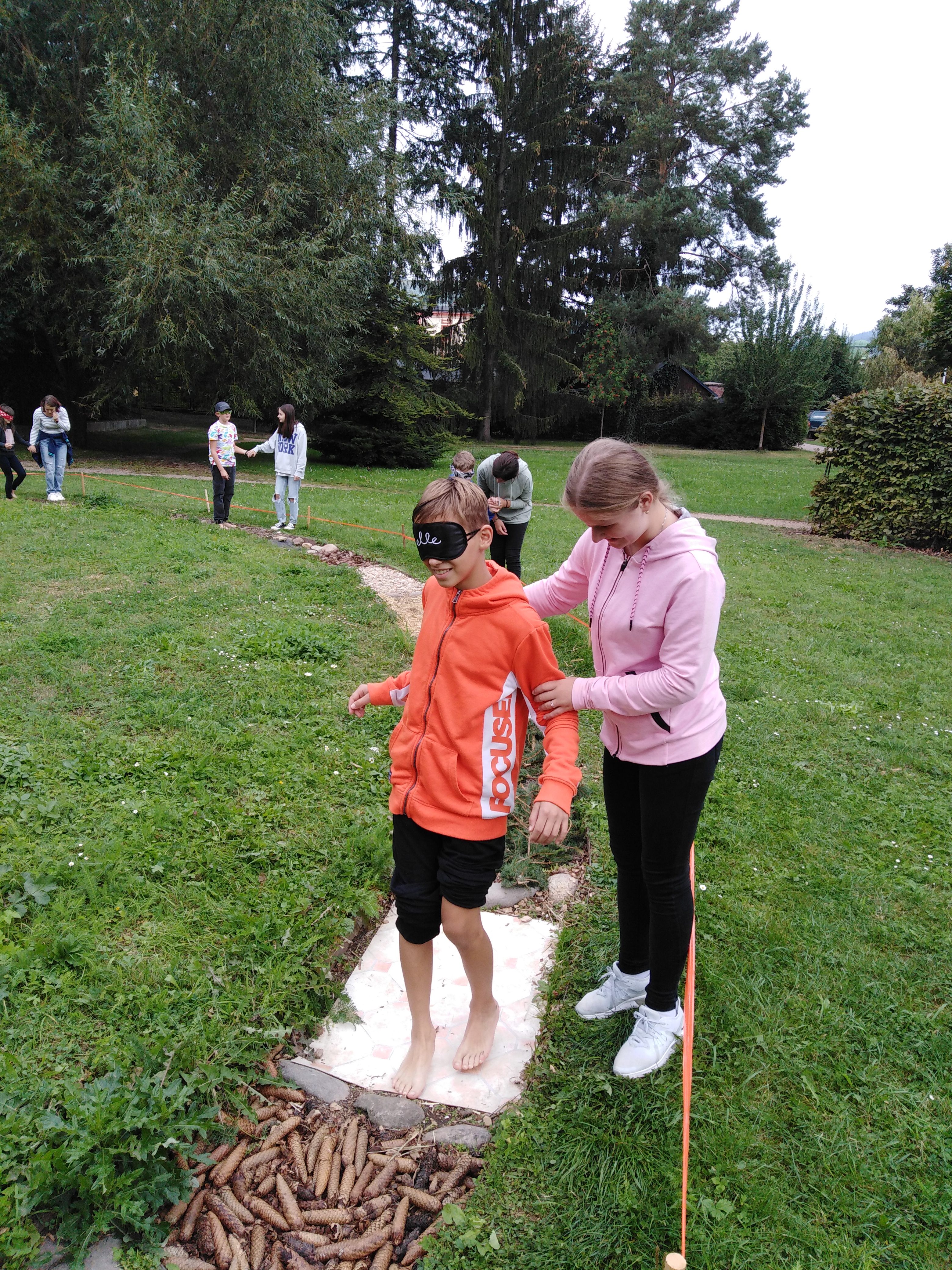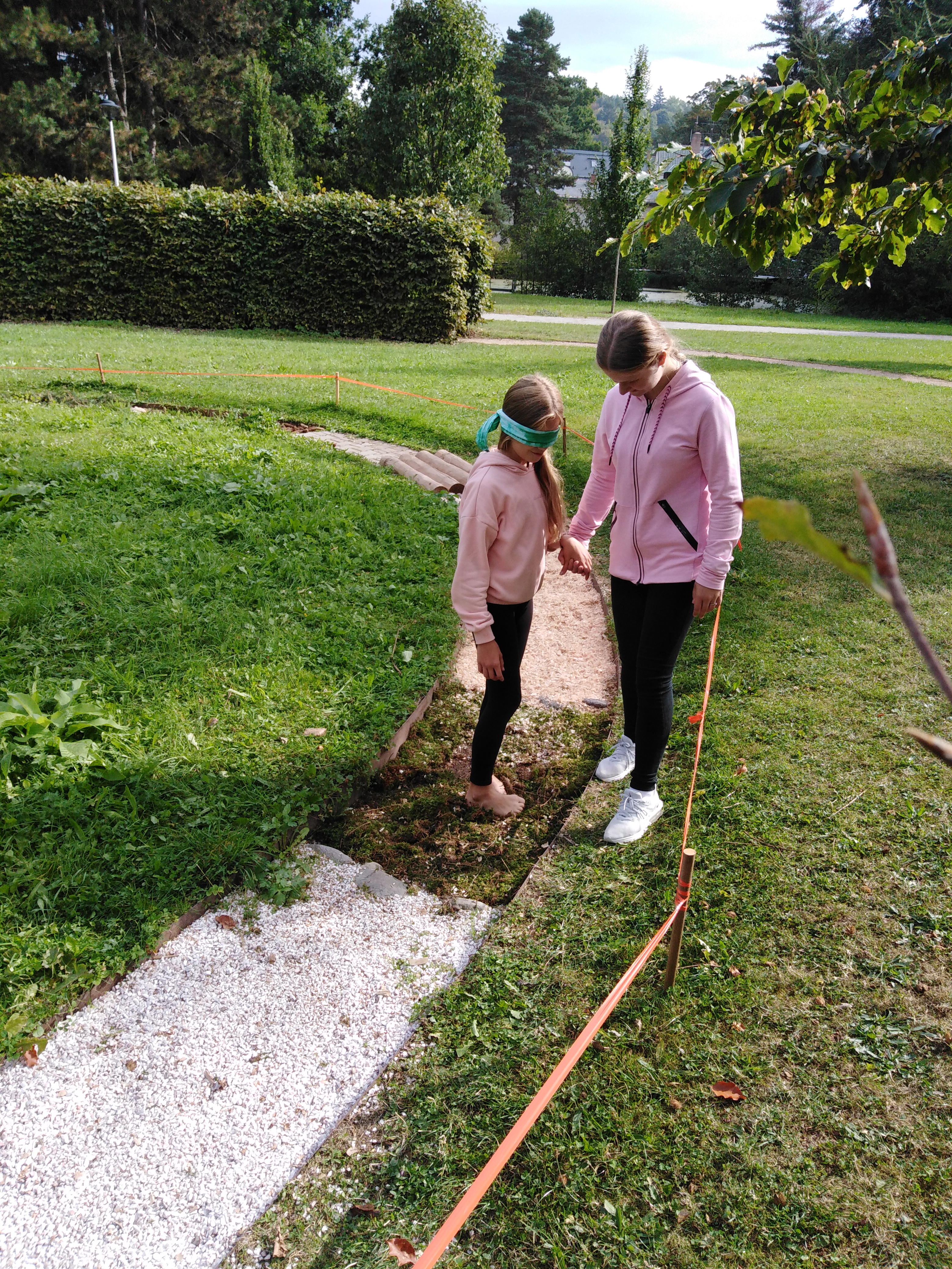 Vyzkoušeli jsme si spoustu aktivit poslepu: poznávali jsme stromy pomocí čuchu, jen s pomocí hmatu jsme si zahráli přírodní pexeso a podle sluchu jsme se snažili "zasáhnout" spolužáky. Také jsme si prošli smyslovou stezku - se zavázanýma očima jsme naboso poznávali, po čem zrovna jdeme - kamínky, písek, dřevěné kulánky apod.