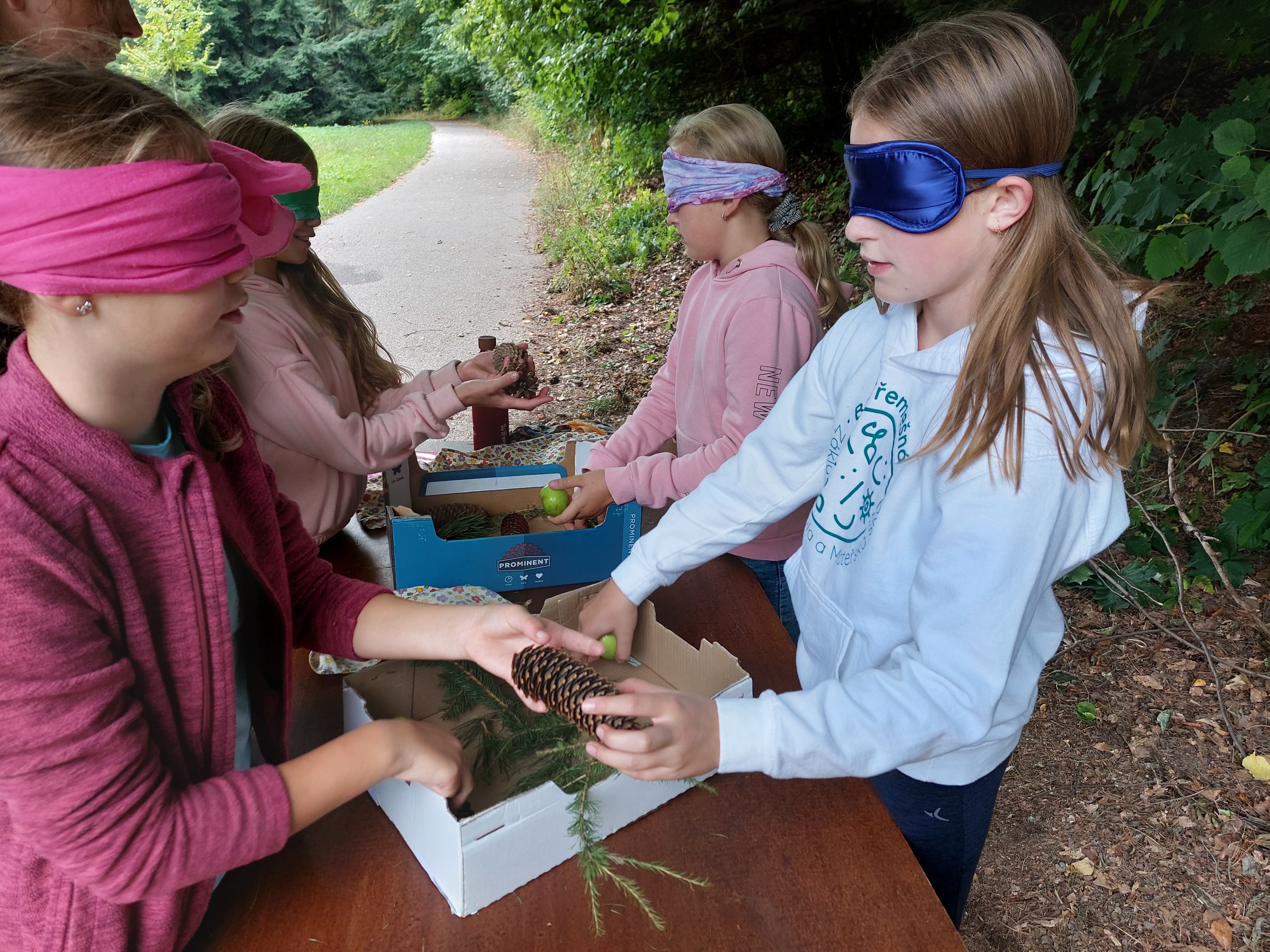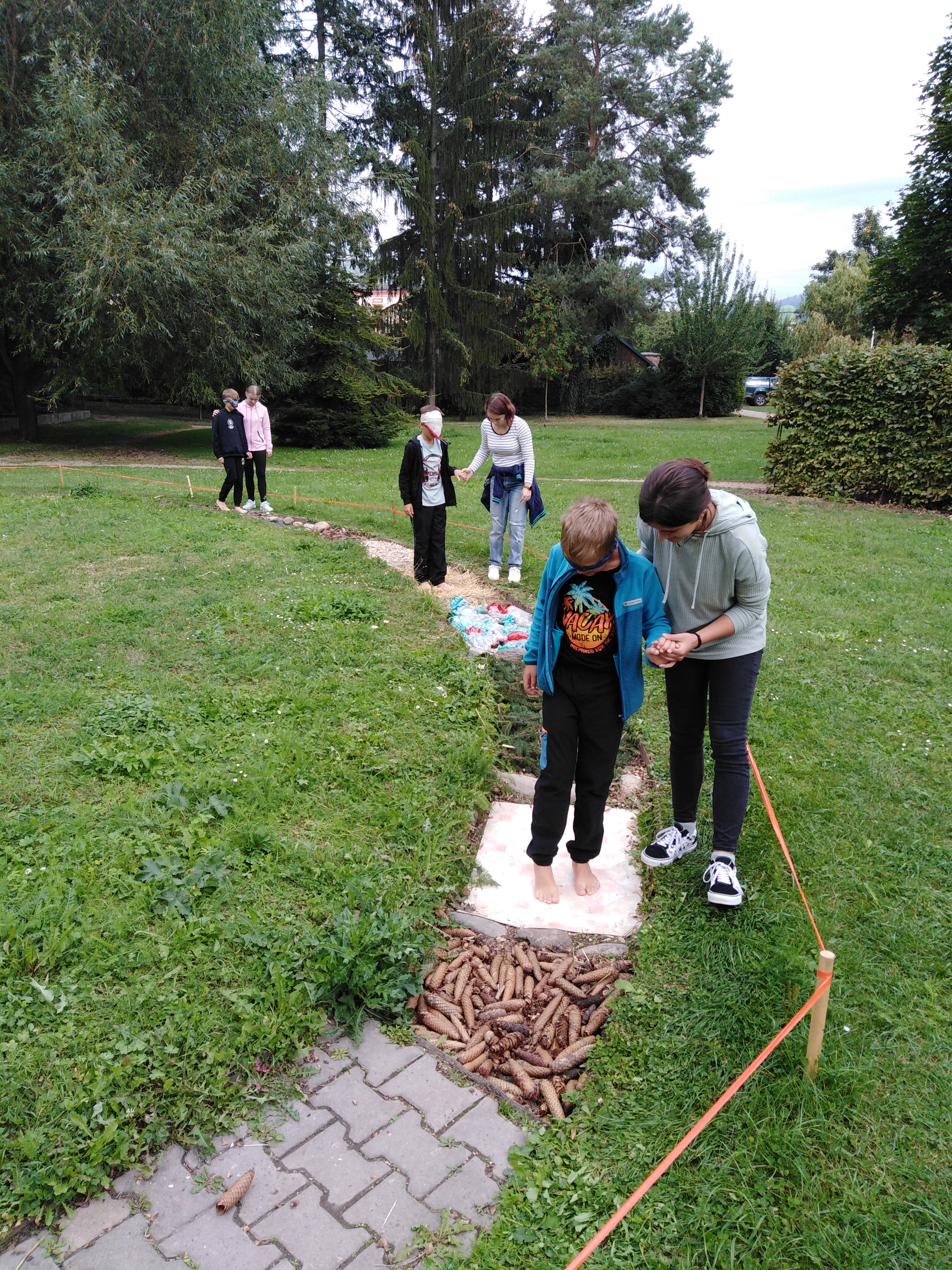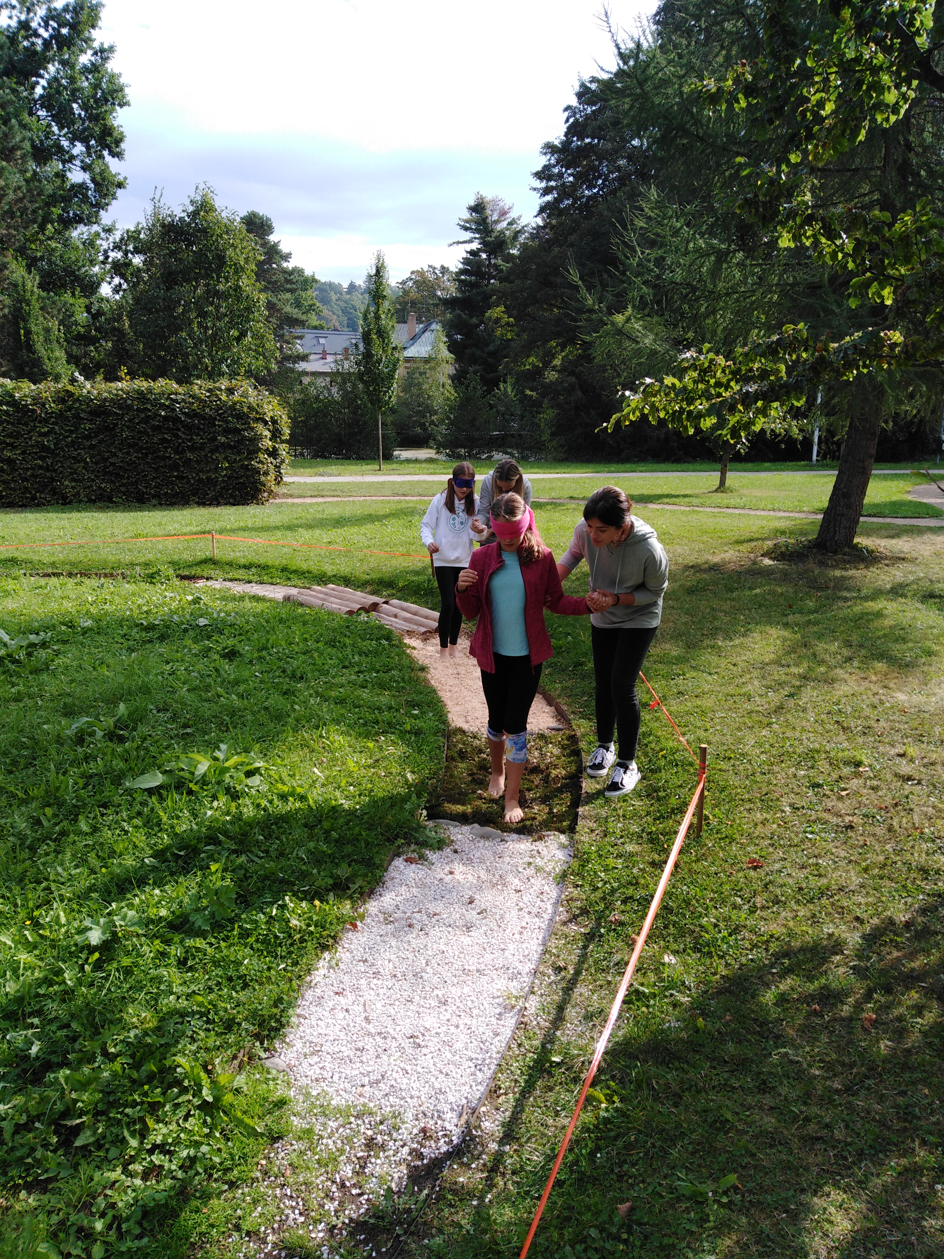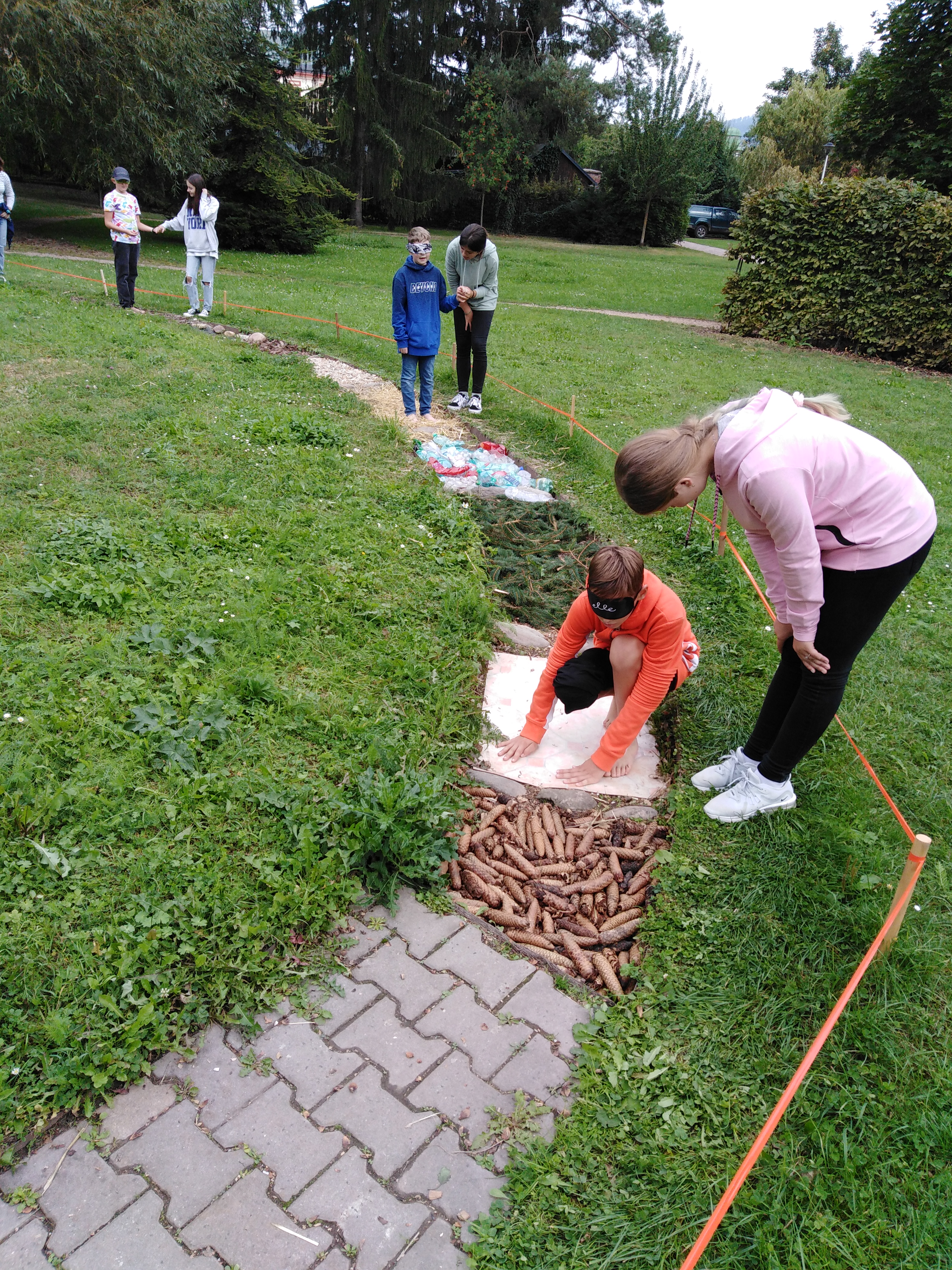 Vyzkoušeli jsme si spoustu aktivit poslepu: poznávali jsme stromy pomocí čuchu, jen s pomocí hmatu jsme si zahráli přírodní pexeso a podle sluchu jsme se snažili "zasáhnout" spolužáky. Také jsme si prošli smyslovou stezku - se zavázanýma očima jsme naboso poznávali, po čem zrovna jdeme - kamínky, písek, dřevěné kulánky apod.