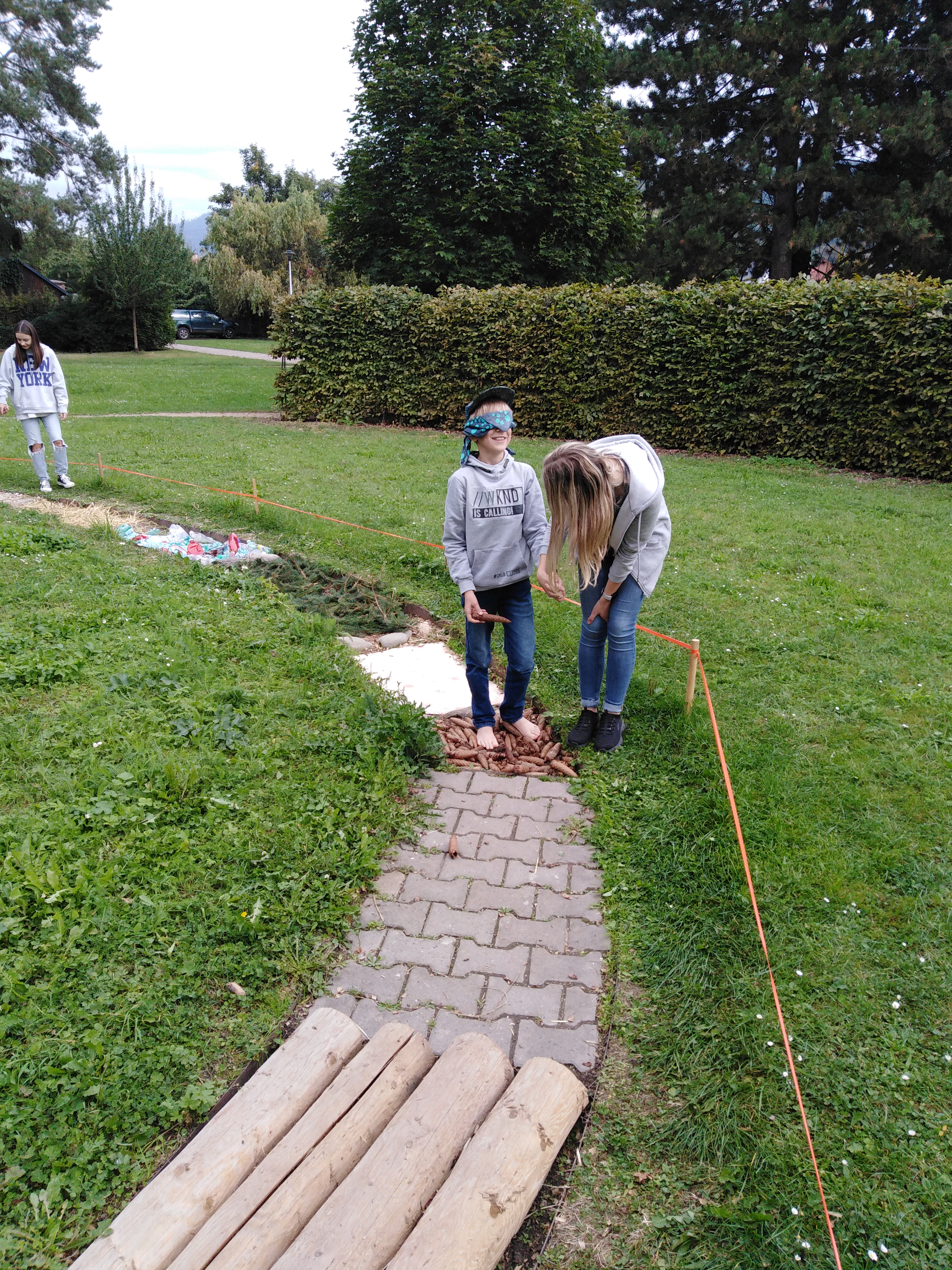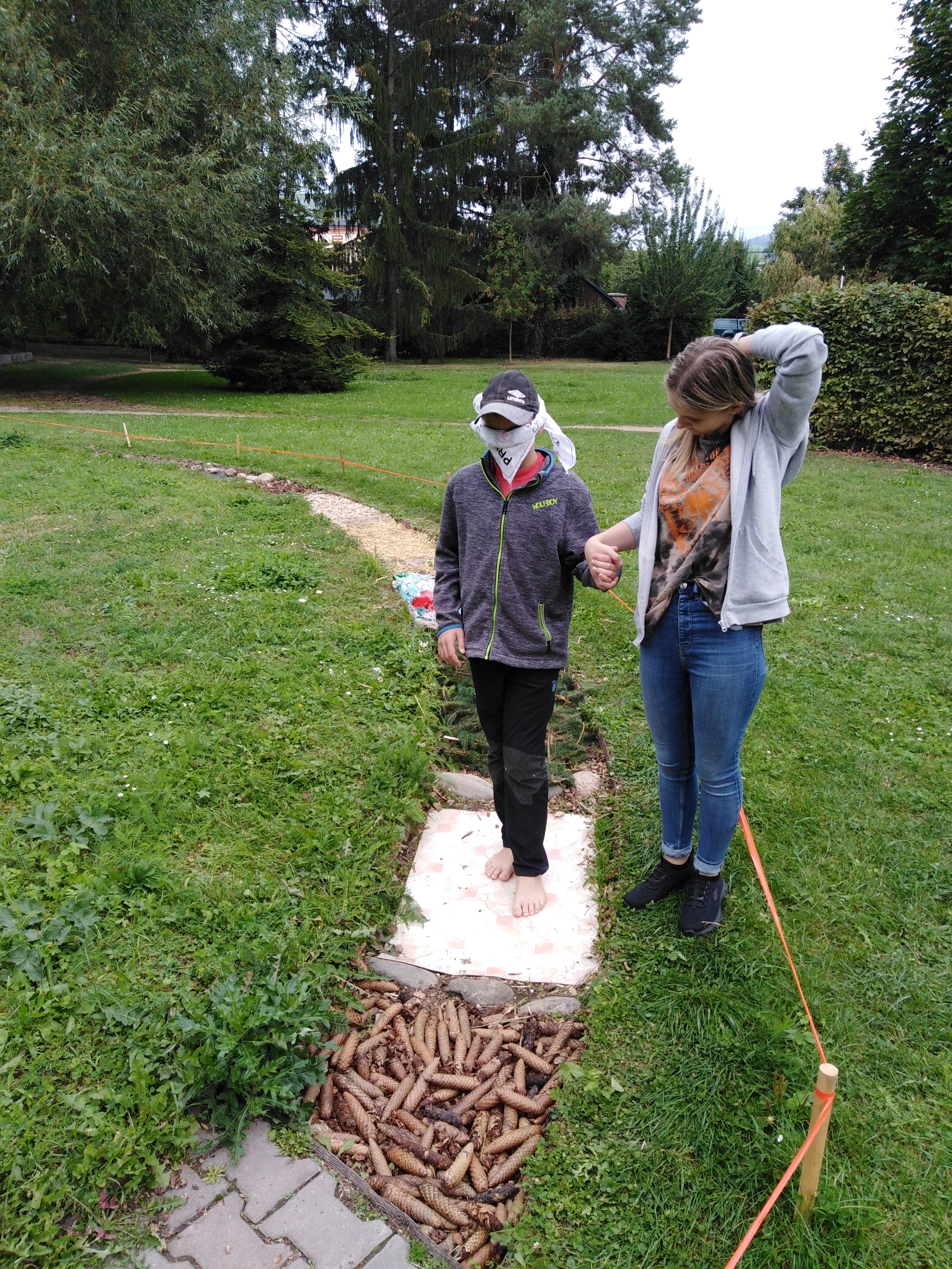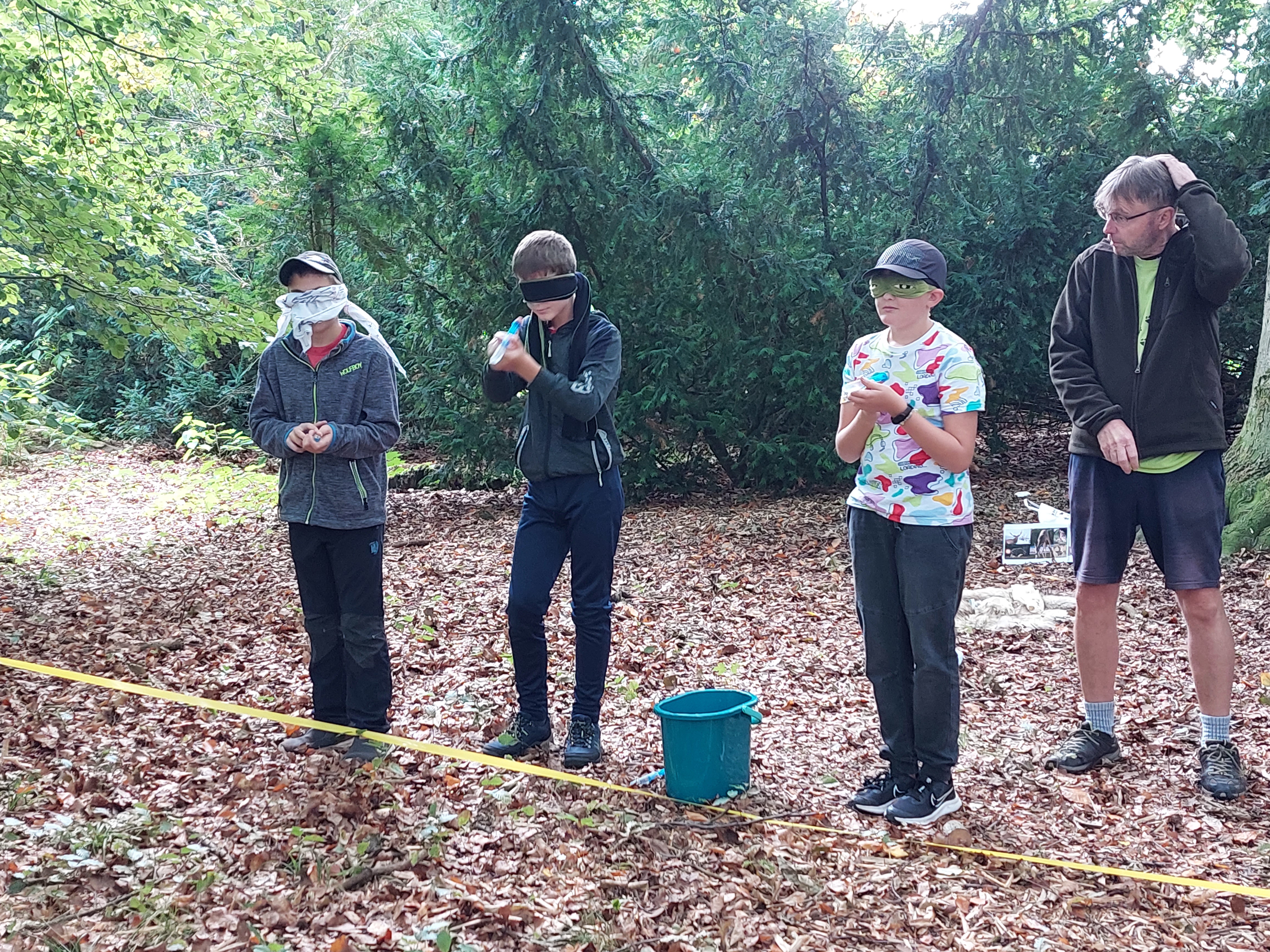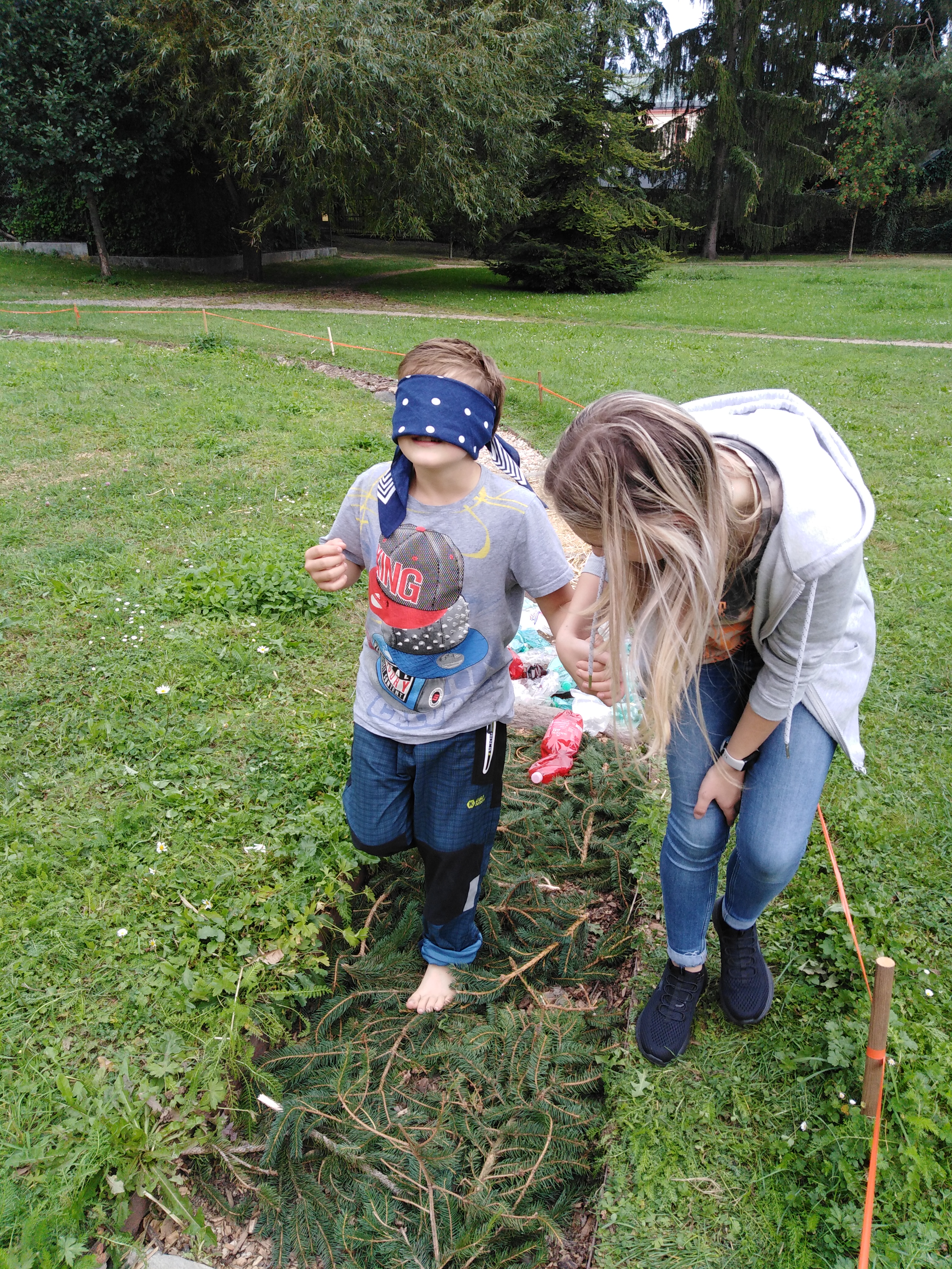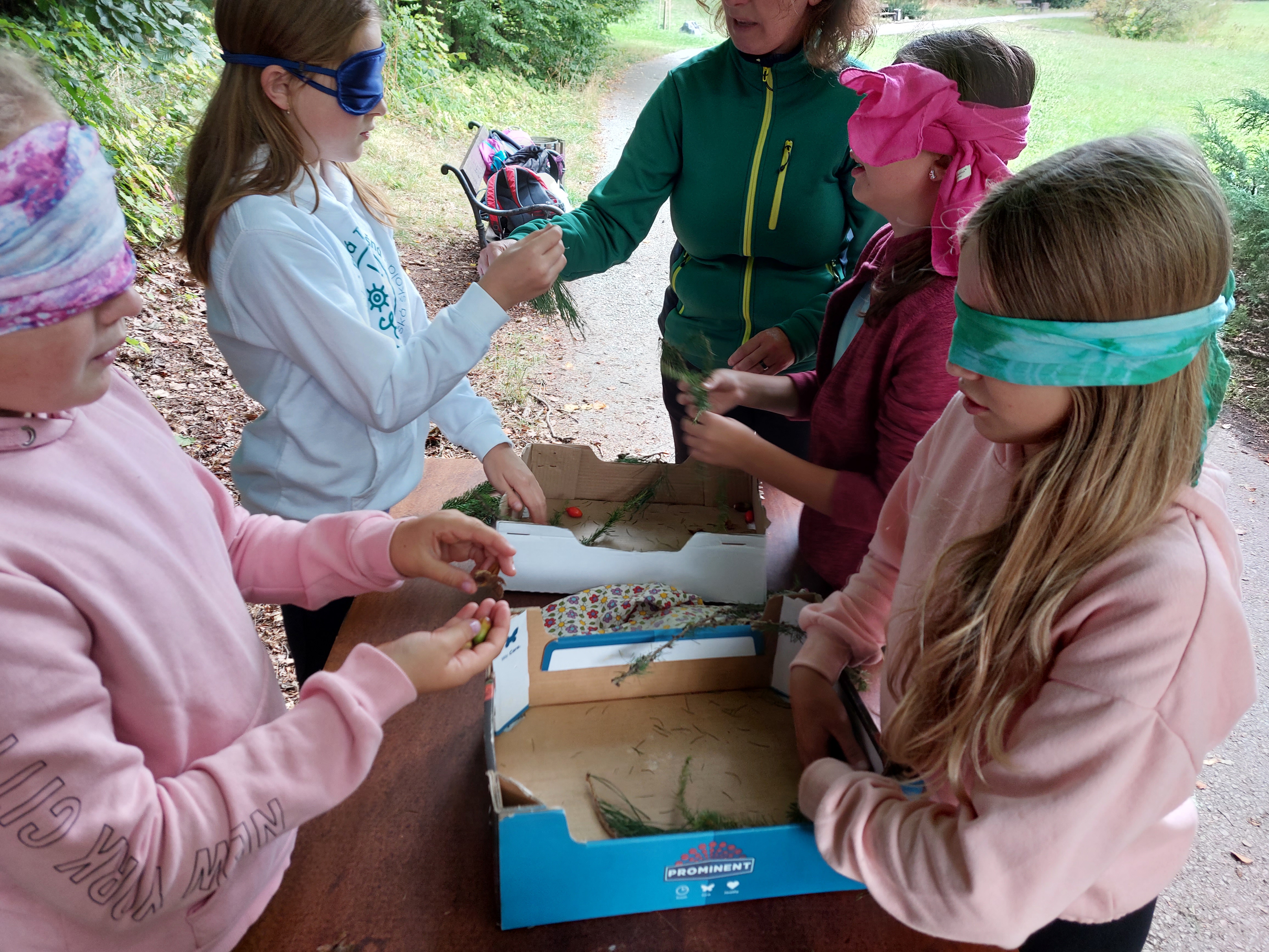Vyzkoušeli jsme si spoustu aktivit poslepu: poznávali jsme stromy pomocí čuchu, jen s pomocí hmatu jsme si zahráli přírodní pexeso a podle sluchu jsme se snažili "zasáhnout" spolužáky. Také jsme si prošli smyslovou stezku - se zavázanýma očima jsme naboso poznávali, po čem zrovna jdeme - kamínky, písek, dřevěné kulánky apod.