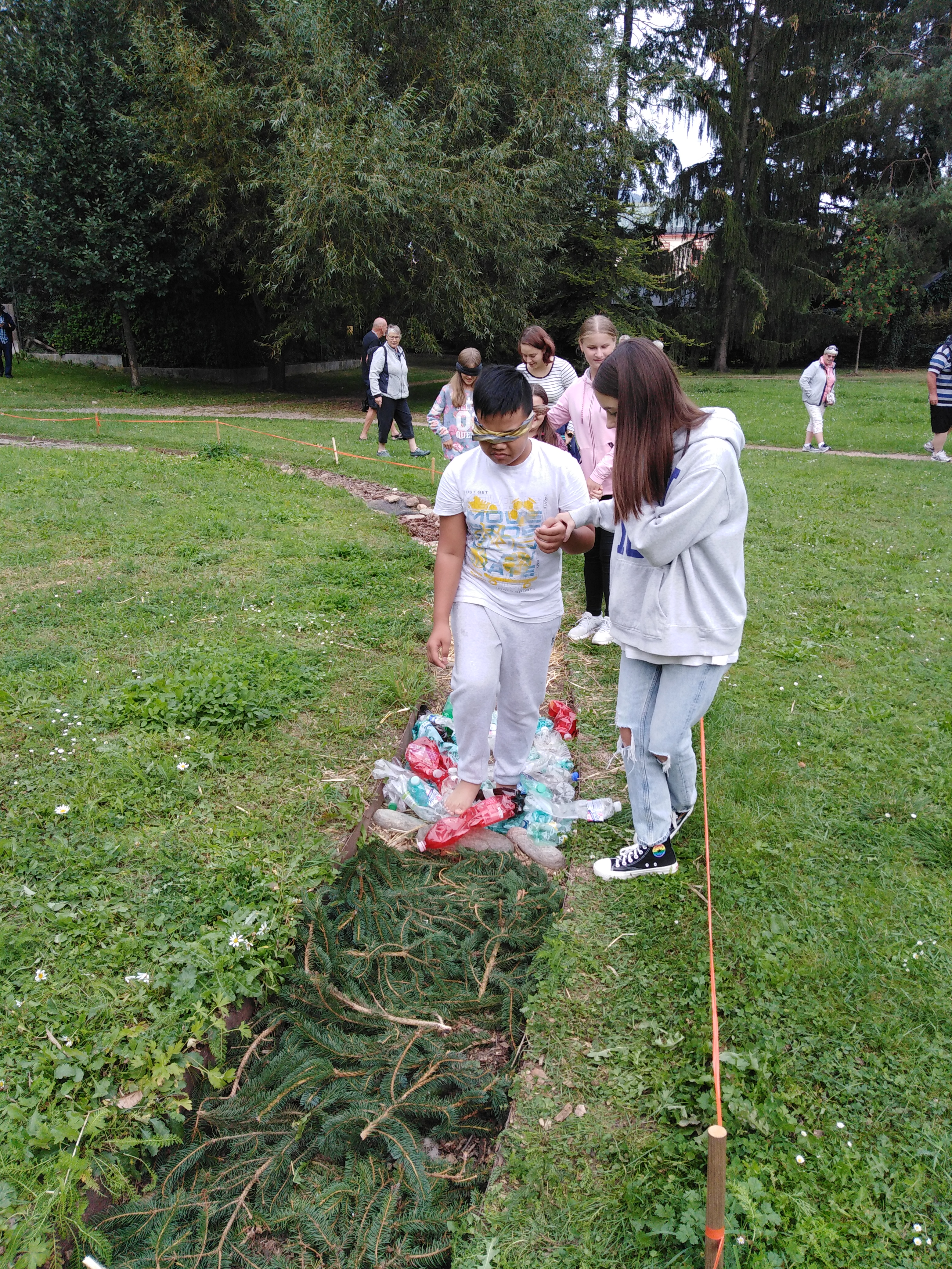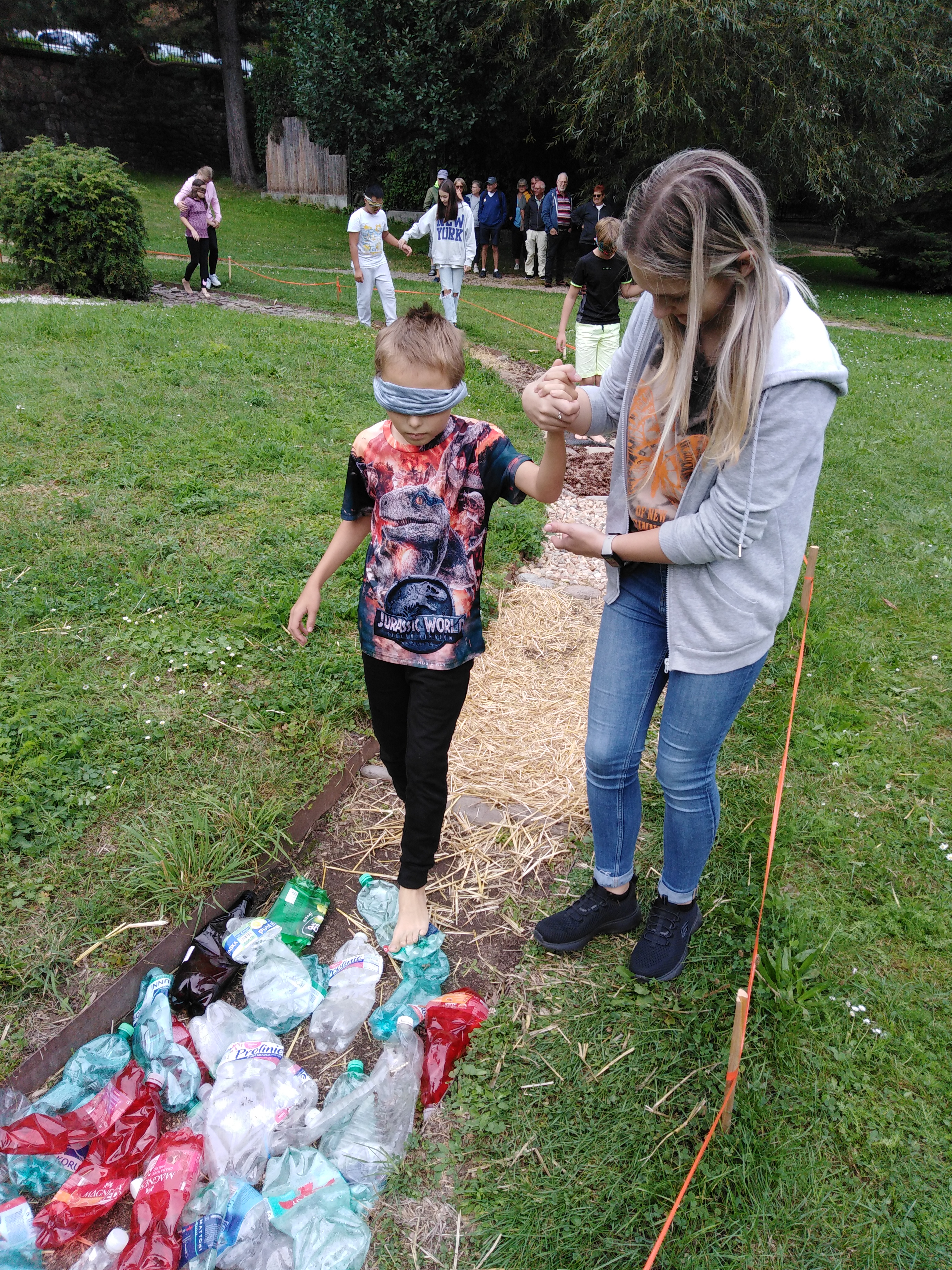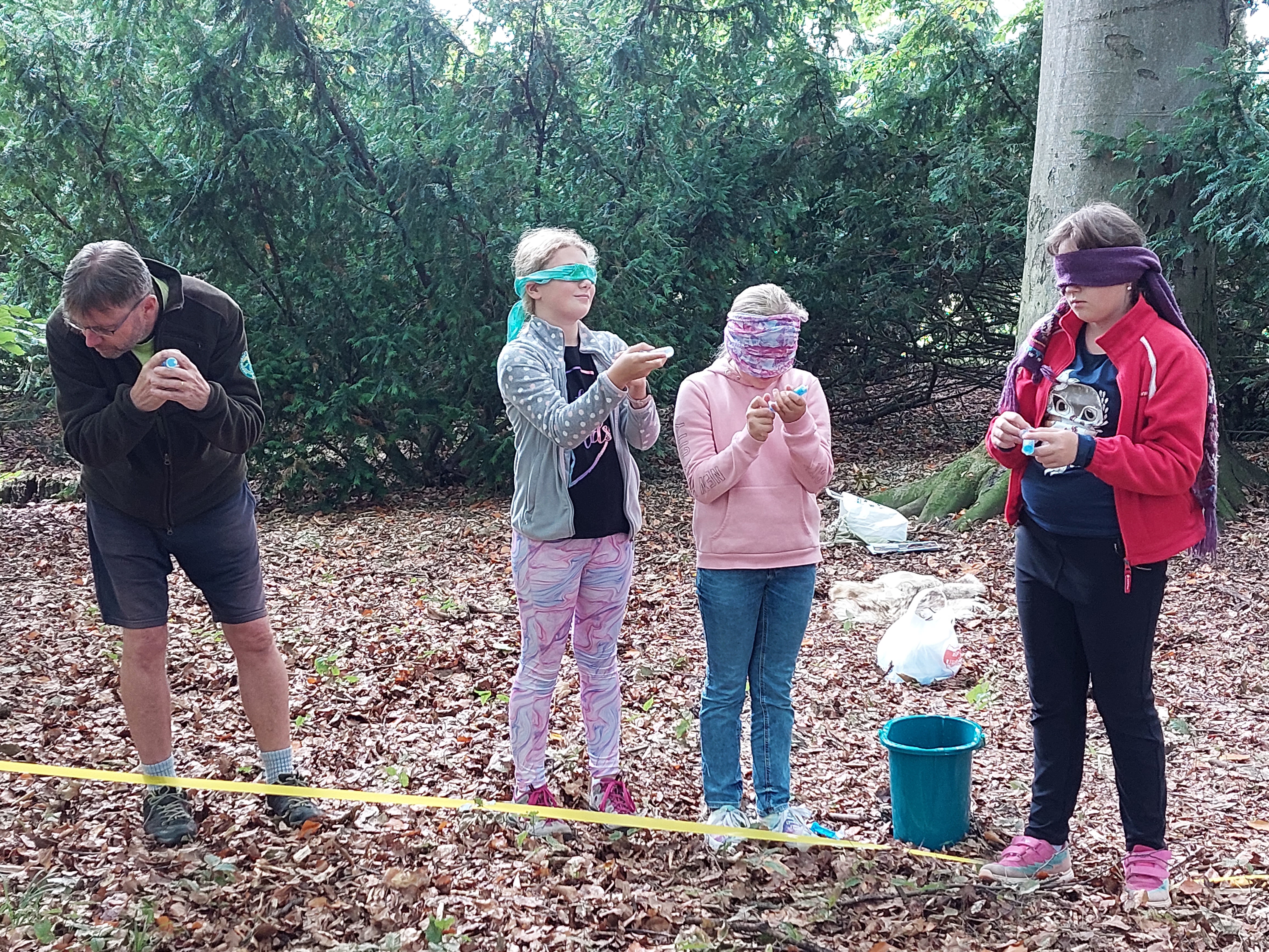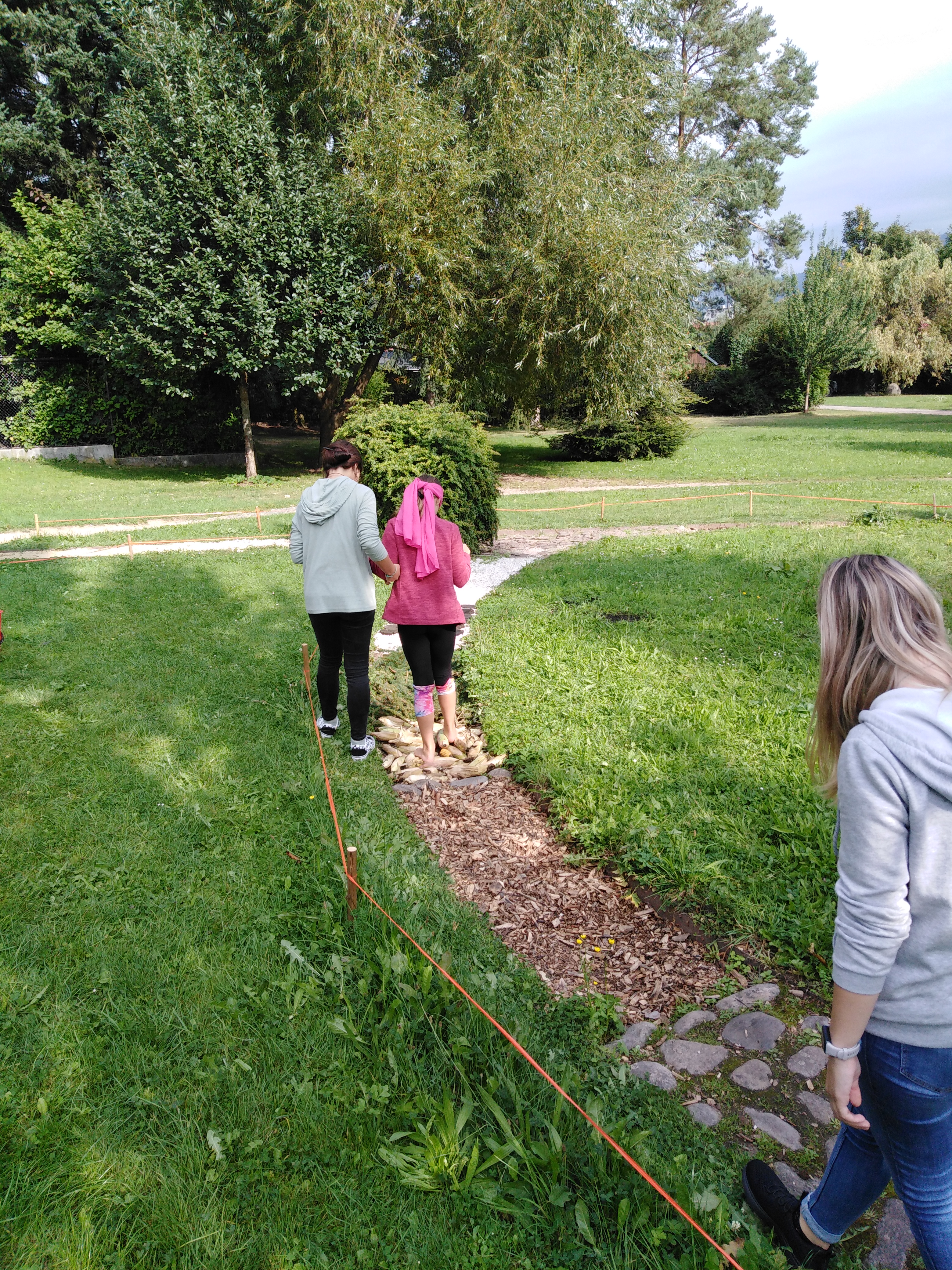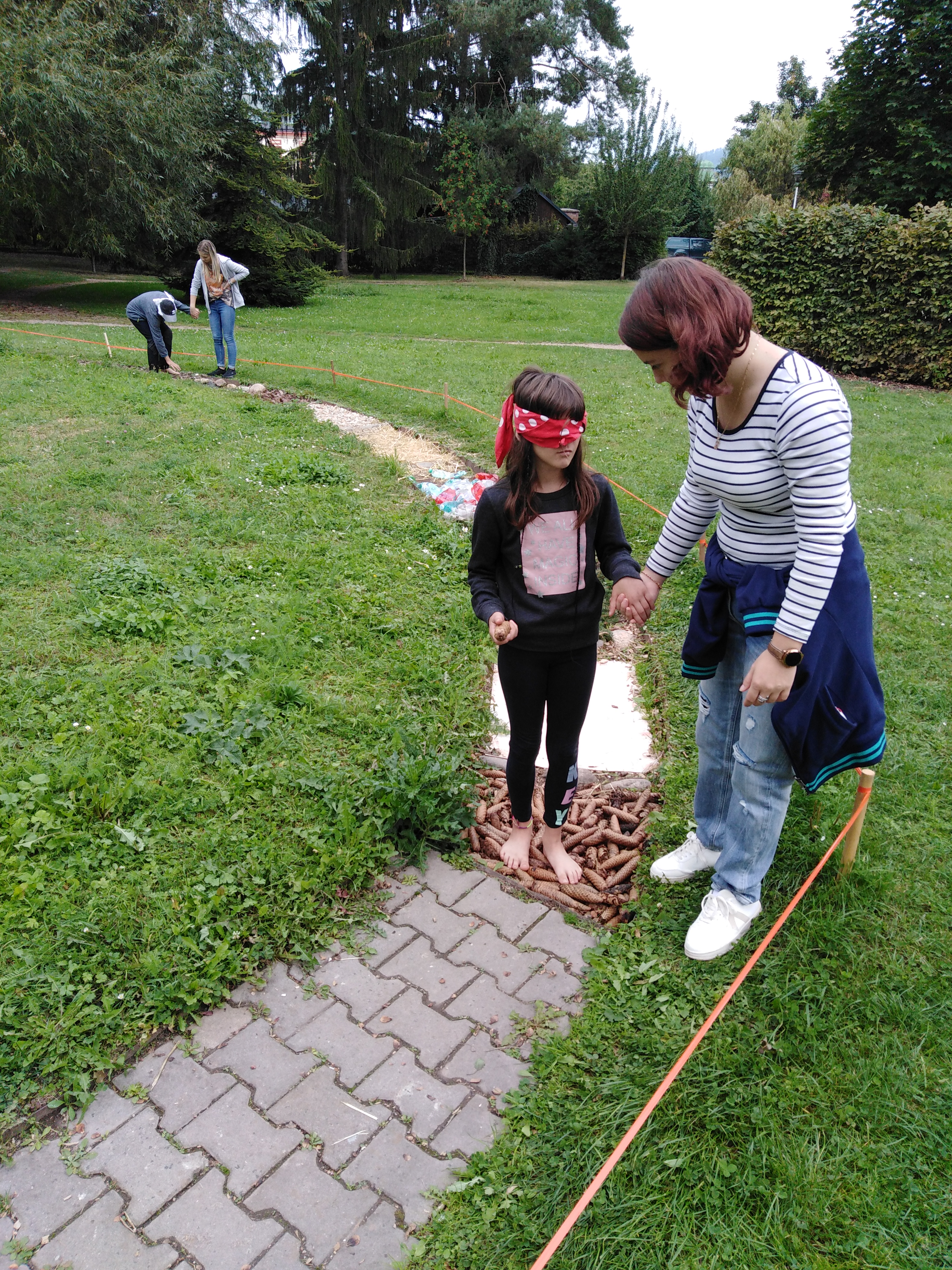 Vyzkoušeli jsme si spoustu aktivit poslepu: poznávali jsme stromy pomocí čuchu, jen s pomocí hmatu jsme si zahráli přírodní pexeso a podle sluchu jsme se snažili "zasáhnout" spolužáky. Také jsme si prošli smyslovou stezku - se zavázanýma očima jsme naboso poznávali, po čem zrovna jdeme - kamínky, písek, dřevěné kulánky apod.