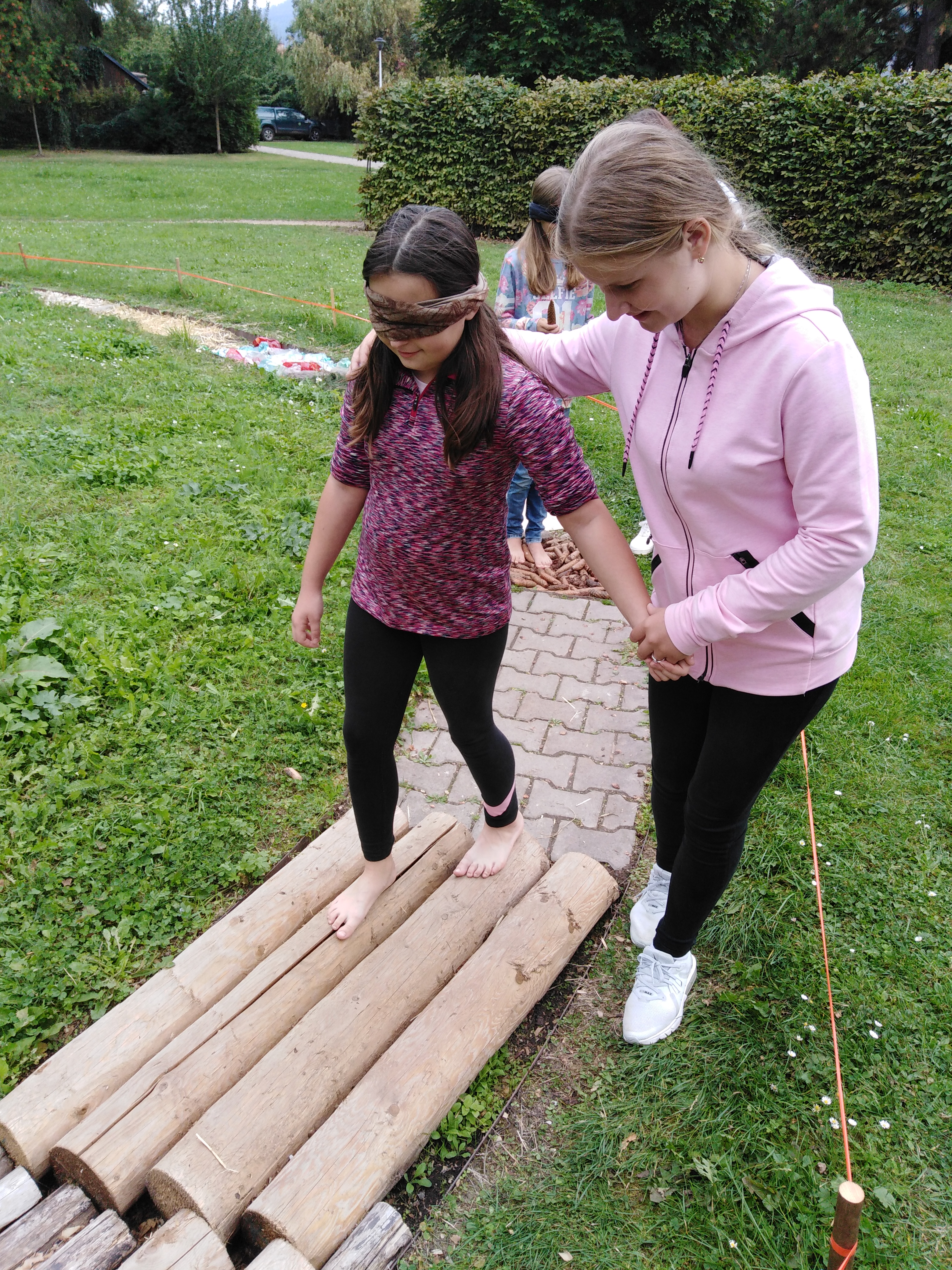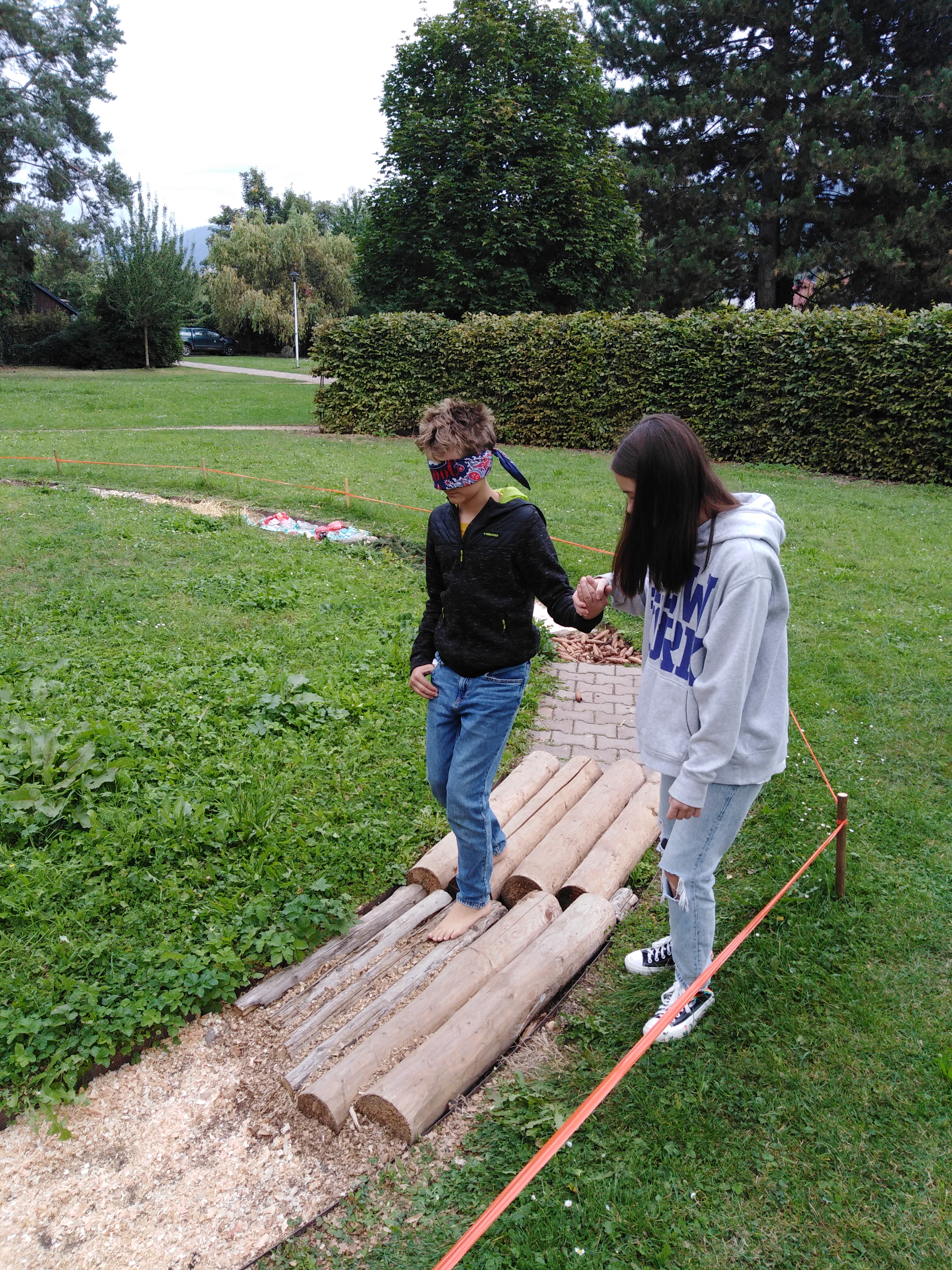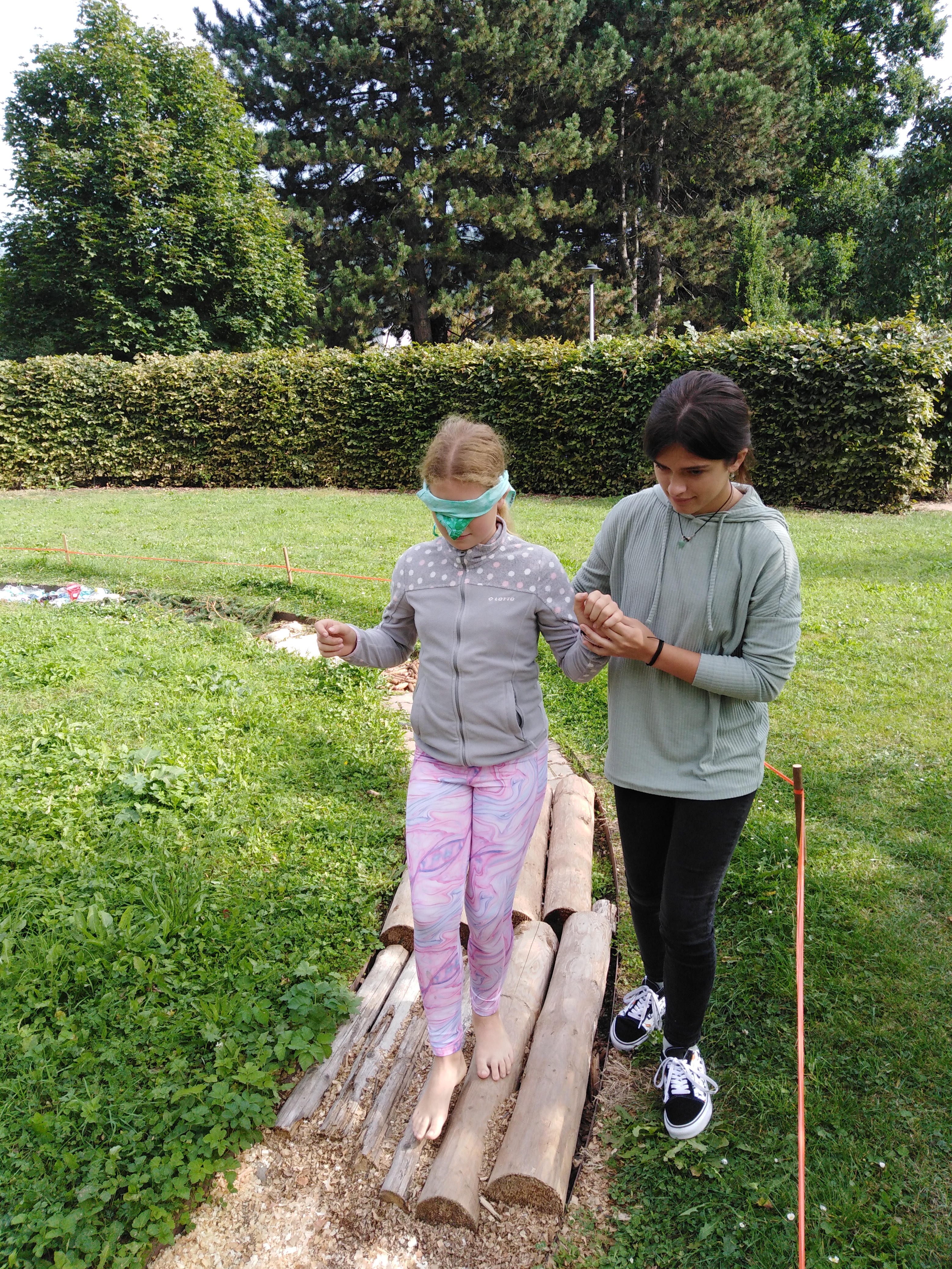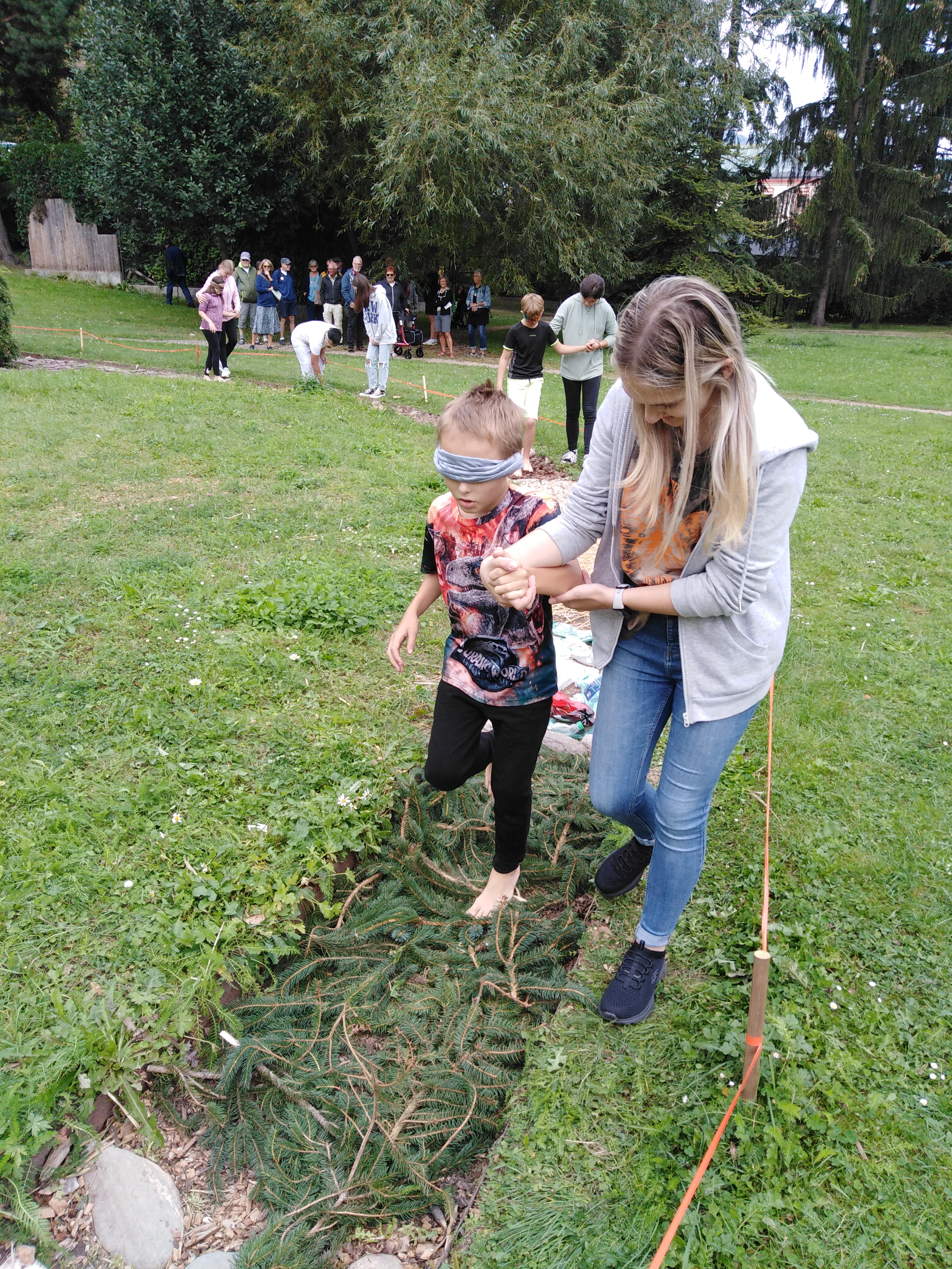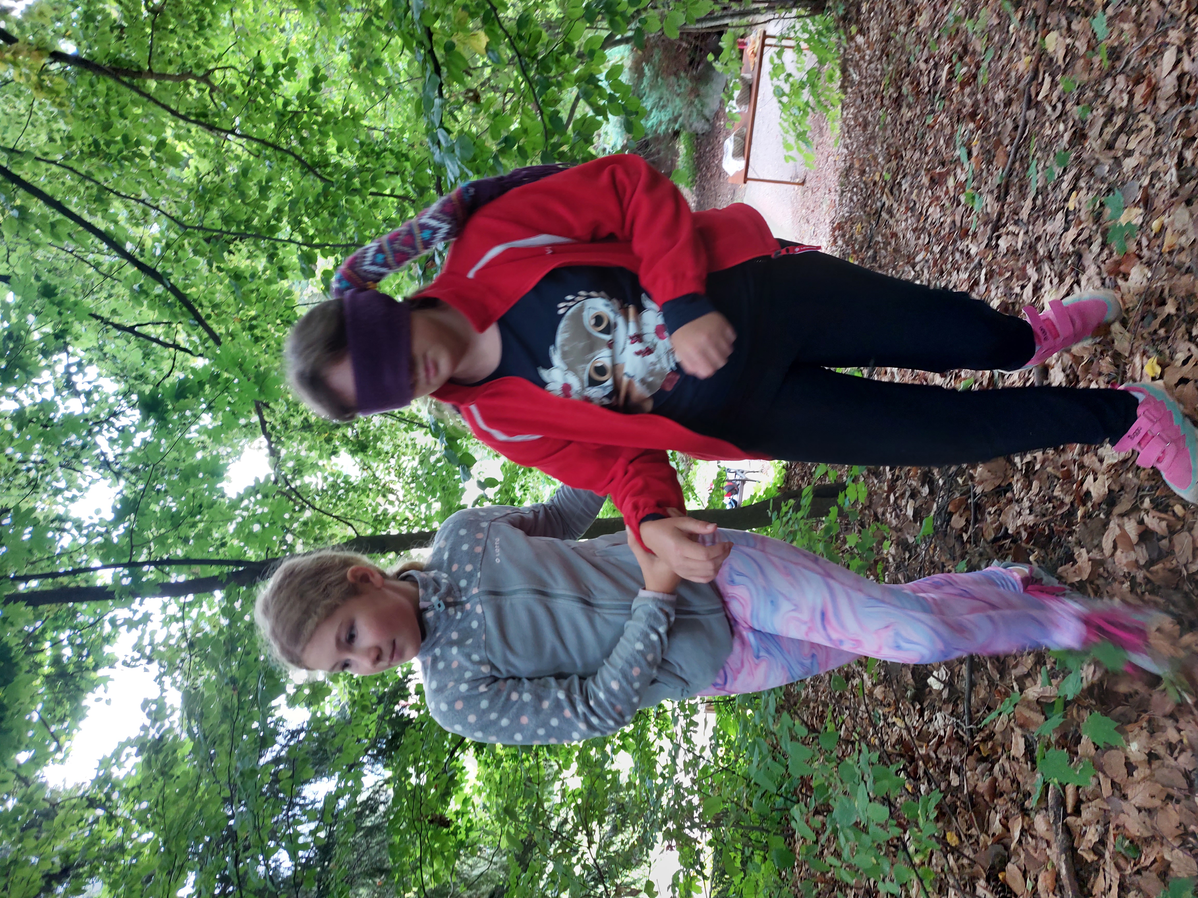 Vyzkoušeli jsme si spoustu aktivit poslepu: poznávali jsme stromy pomocí čuchu, jen s pomocí hmatu jsme si zahráli přírodní pexeso a podle sluchu jsme se snažili "zasáhnout" spolužáky. Také jsme si prošli smyslovou stezku - se zavázanýma očima jsme naboso poznávali, po čem zrovna jdeme - kamínky, písek, dřevěné kulánky apod.