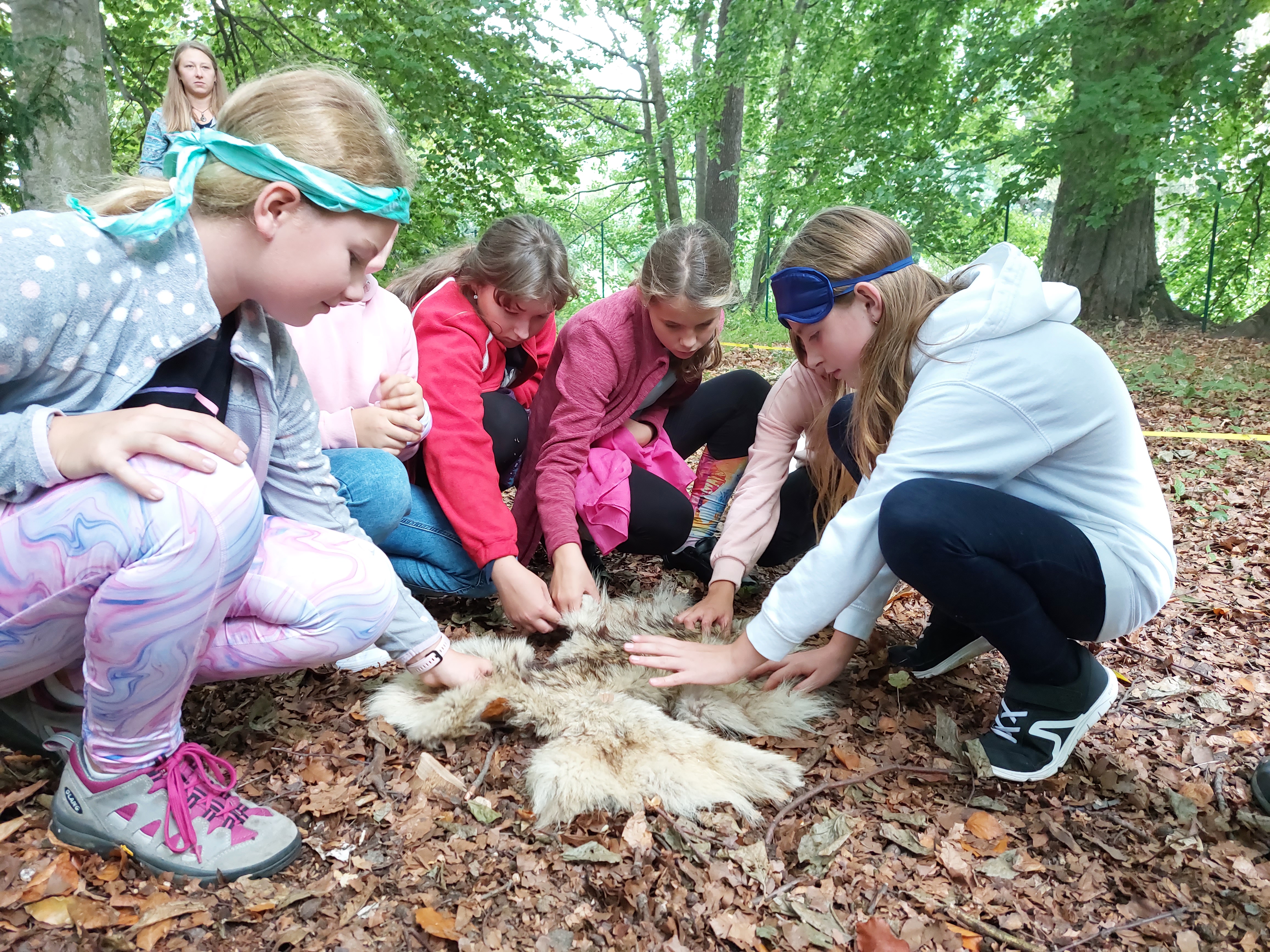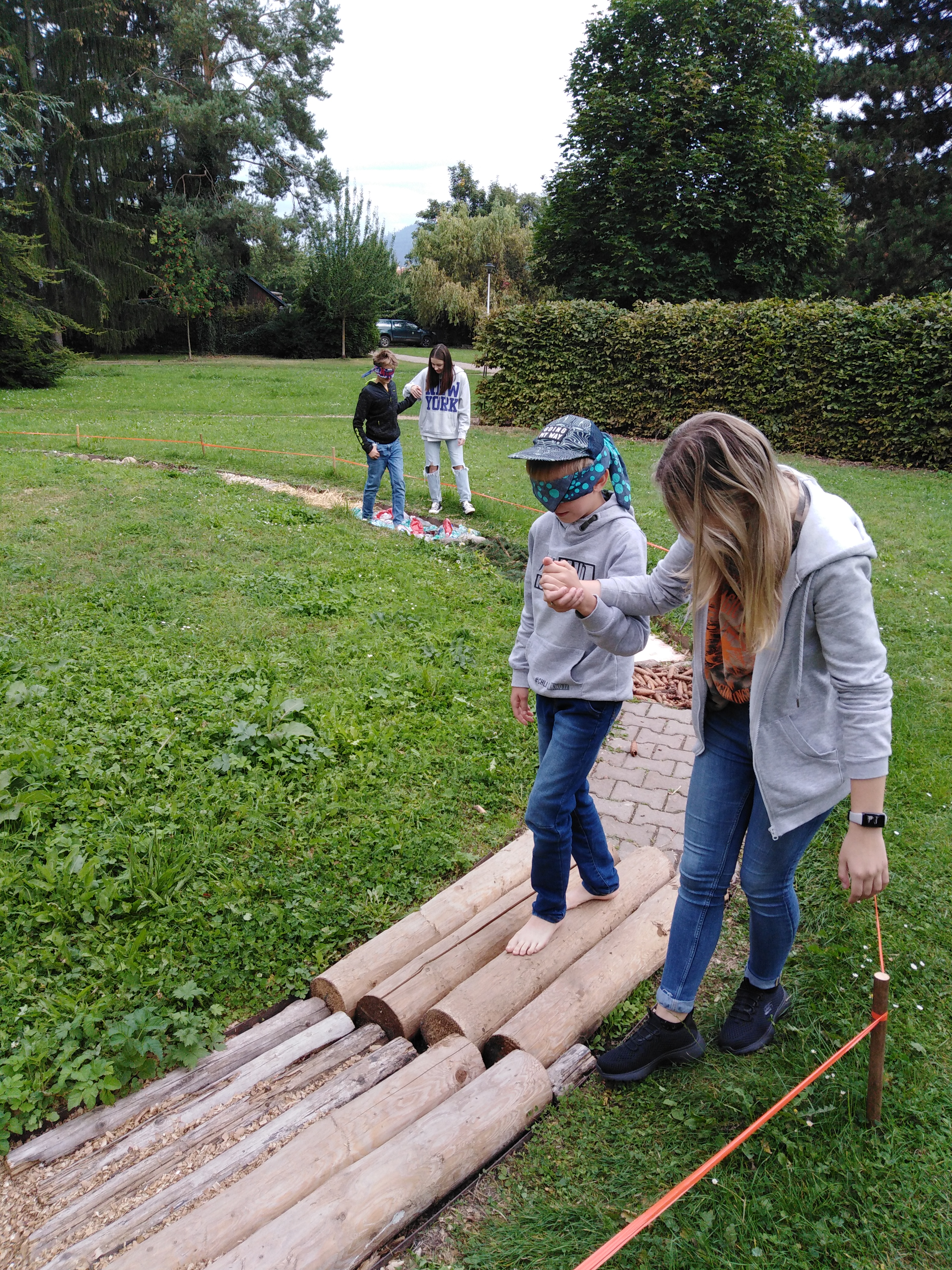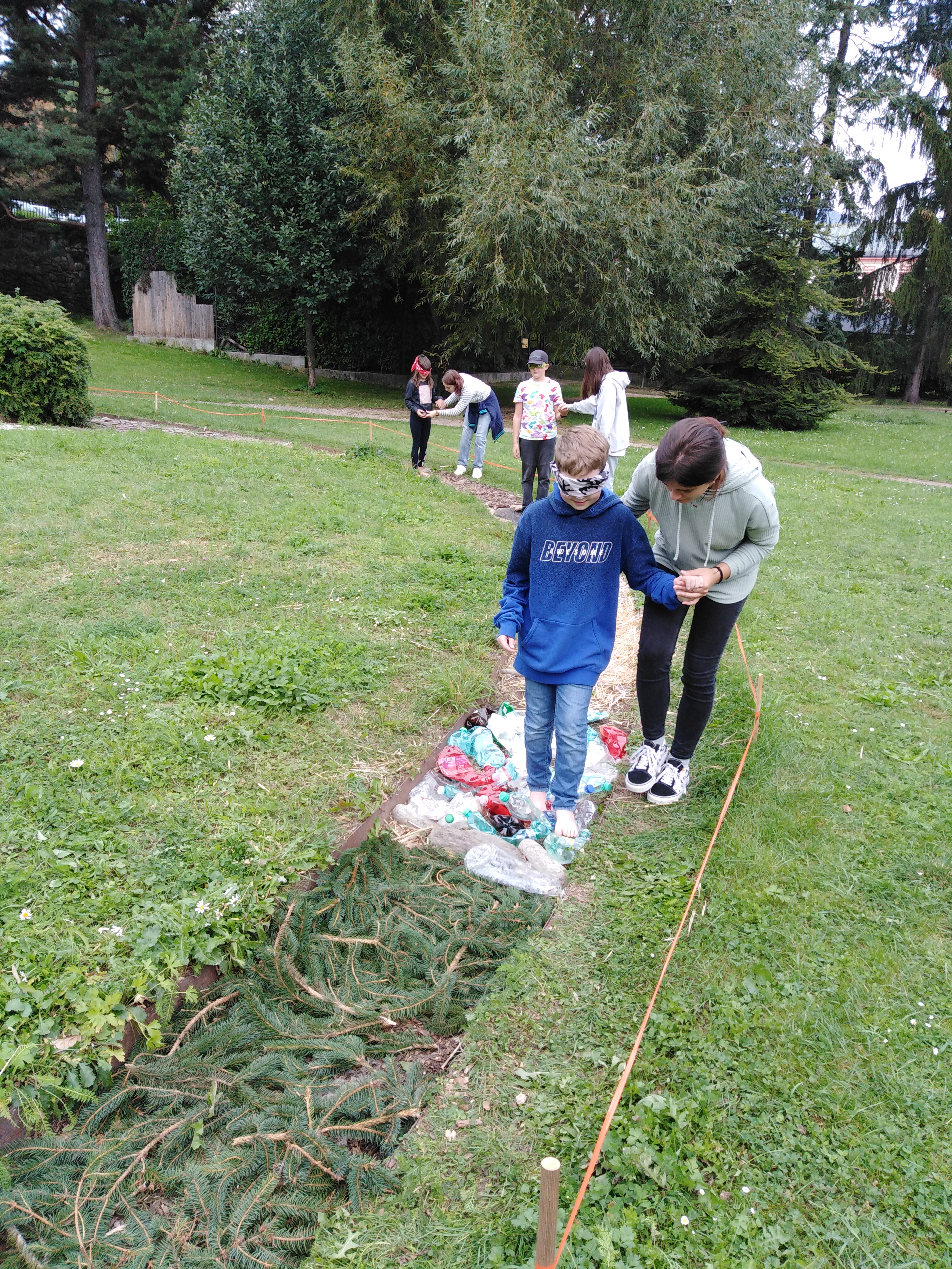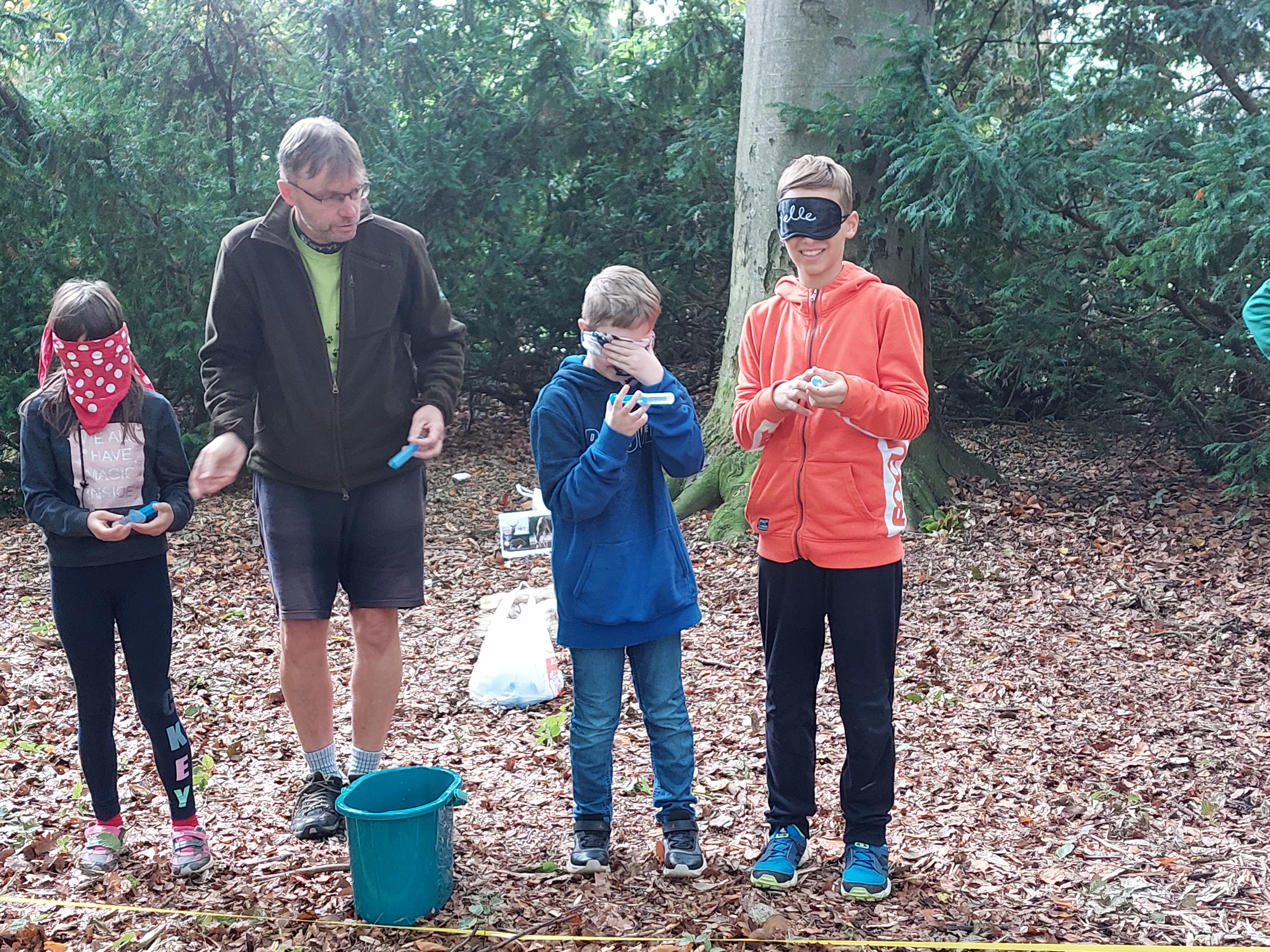 Vyzkoušeli jsme si spoustu aktivit poslepu: poznávali jsme stromy pomocí čuchu, jen s pomocí hmatu jsme si zahráli přírodní pexeso a podle sluchu jsme se snažili "zasáhnout" spolužáky. Také jsme si prošli smyslovou stezku - se zavázanýma očima jsme naboso poznávali, po čem zrovna jdeme - kamínky, písek, dřevěné kulánky apod.