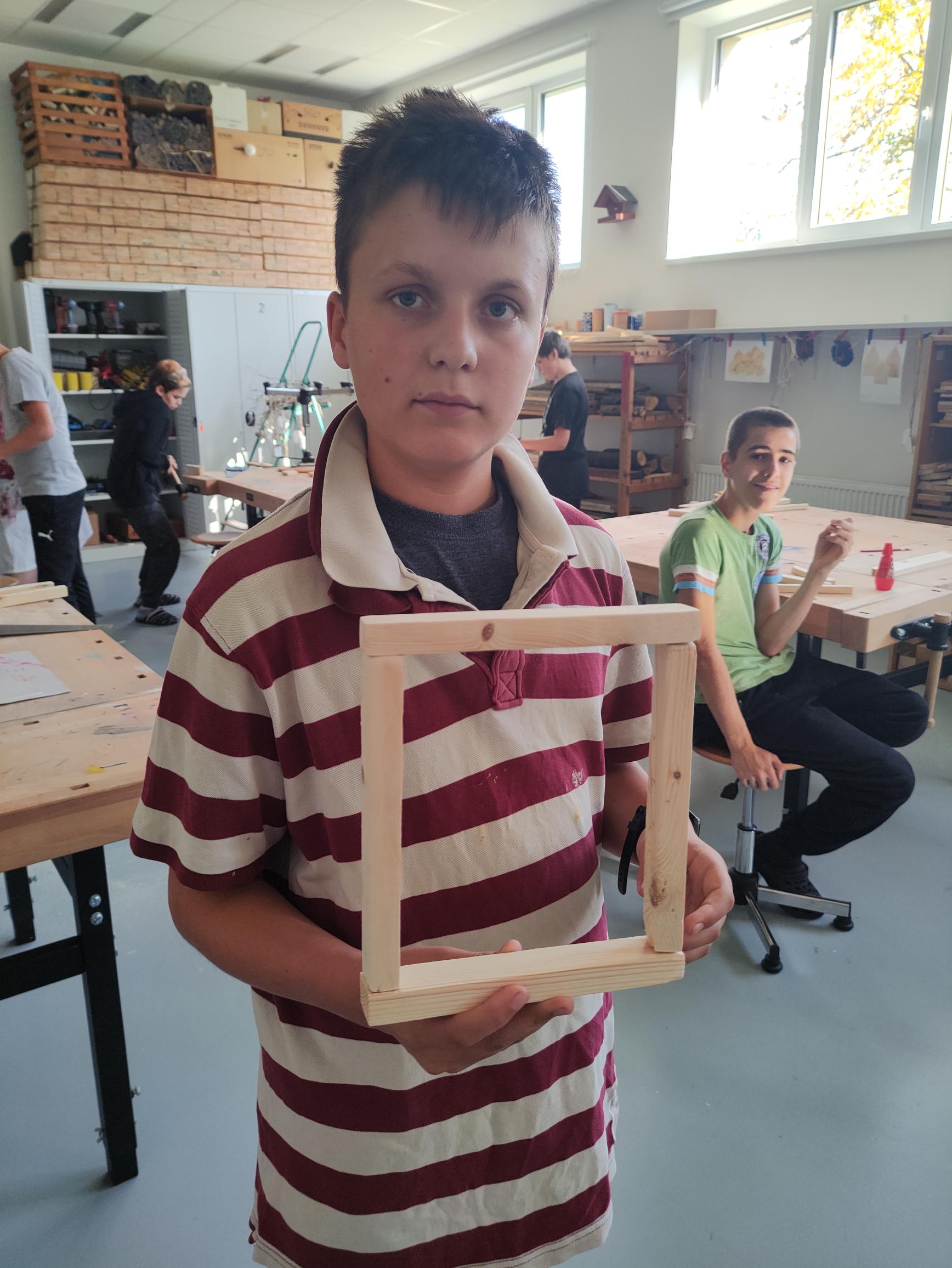 Jako správní muži se statečně porvali chlapci ze šesté a sedmé třídy s výrobou dřevěných rámečků bez využití hřebíků. Nejdříve jsme museli vše pečlivě naměřit a uříznout, poté obrousit, navrtat a následně vše spojit pomocí dřevěných týbel. Práce byla tedy zaměřena na přesnost.