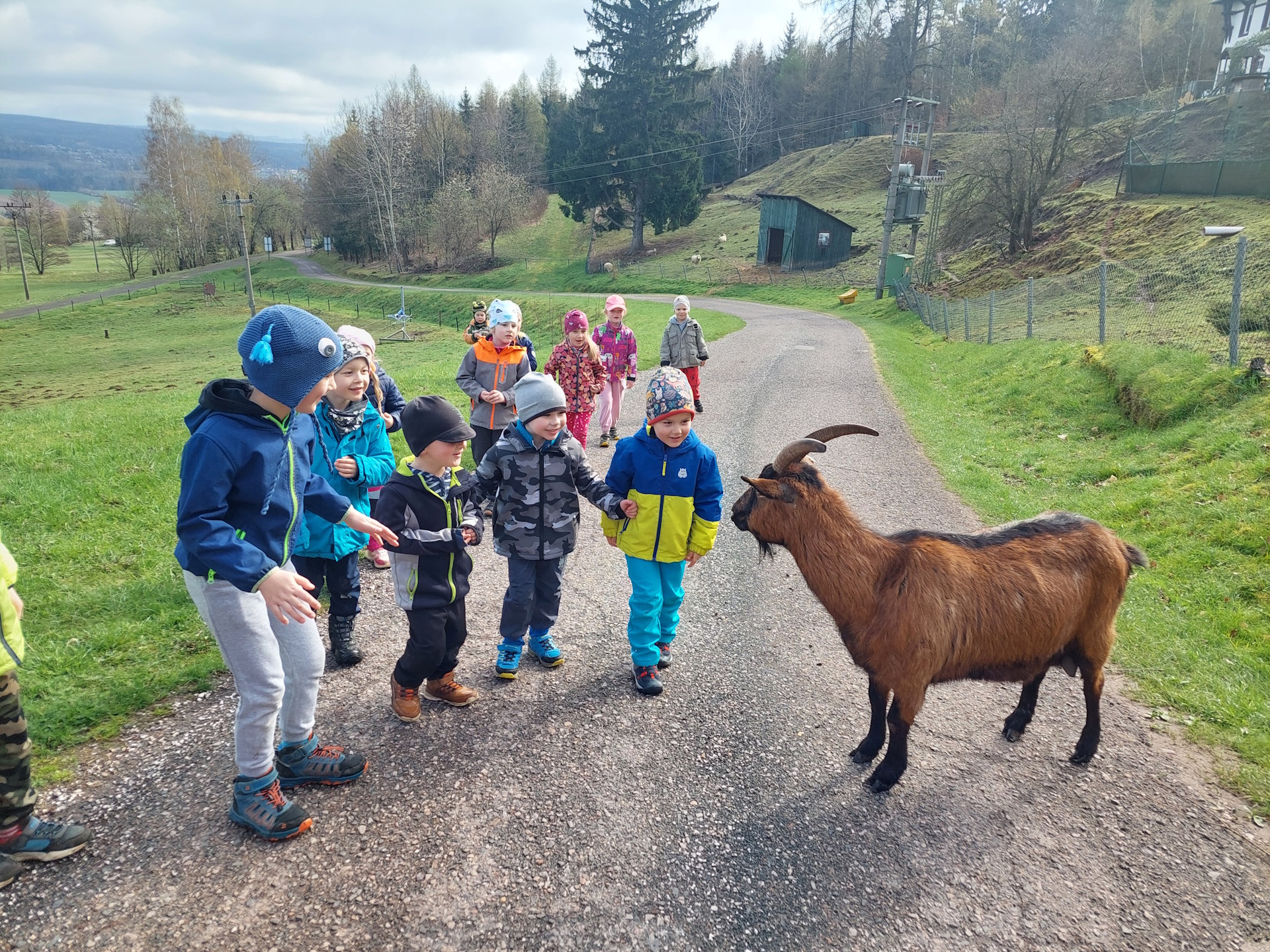 V lázních se k nám přidal kozel, který nám dělal průvodce celého areálu. Setkali jsme se s ovečkami, prasátky, poníkem a dvěma oslíky. Po náročné cestě si děti mohly odpočinout a pohrát si na venkovním hřišti. Zpáteční cesta byla z kopce dolů, ale o to náročnější. Na lesní cestě bylo samé bahno, takže to občas vypadalo, jako když po lese poskakuje tlupa opic nežli děti ze školky.