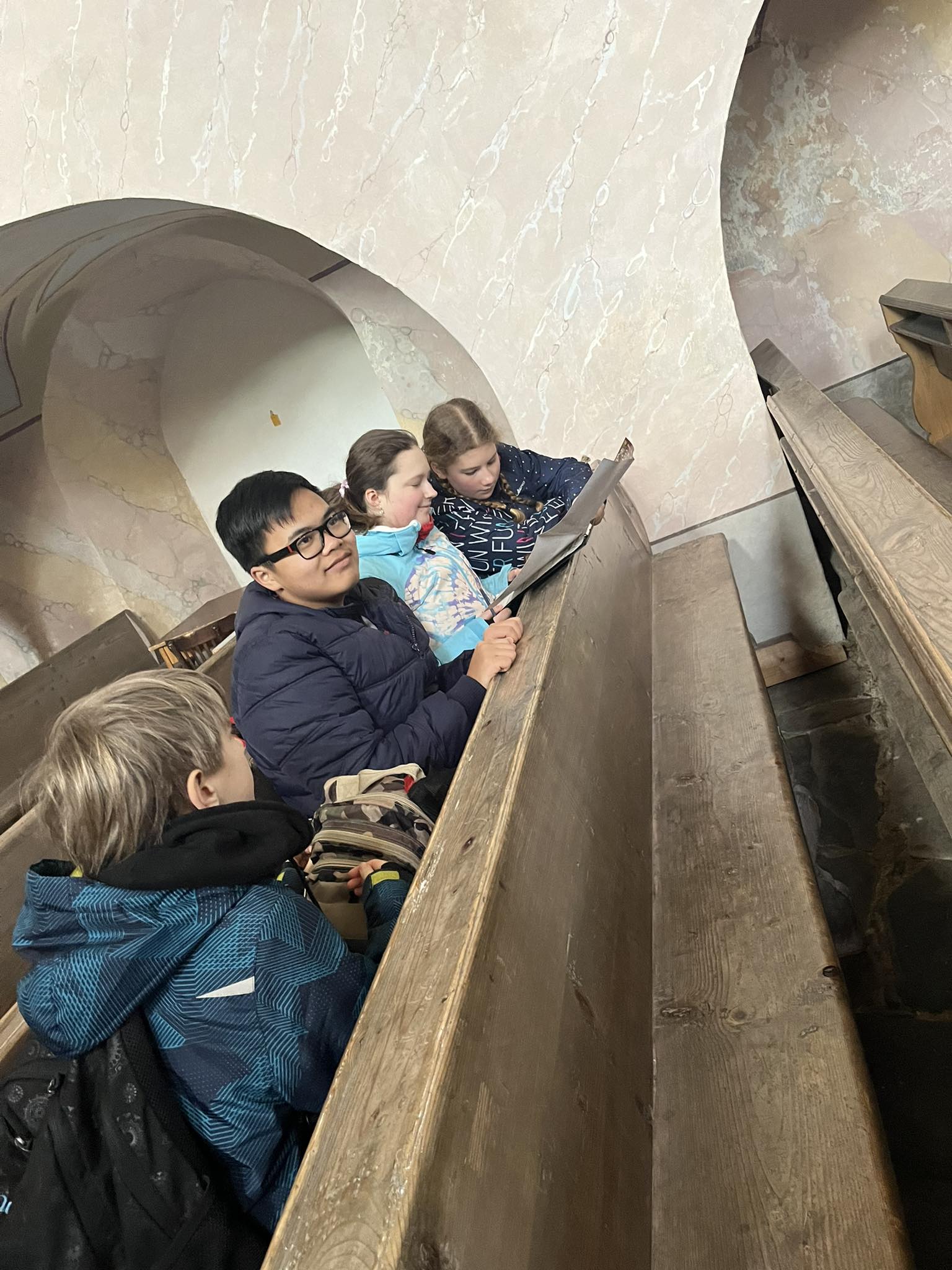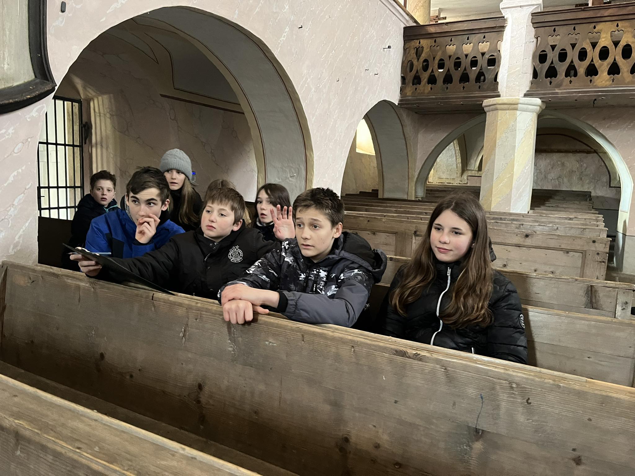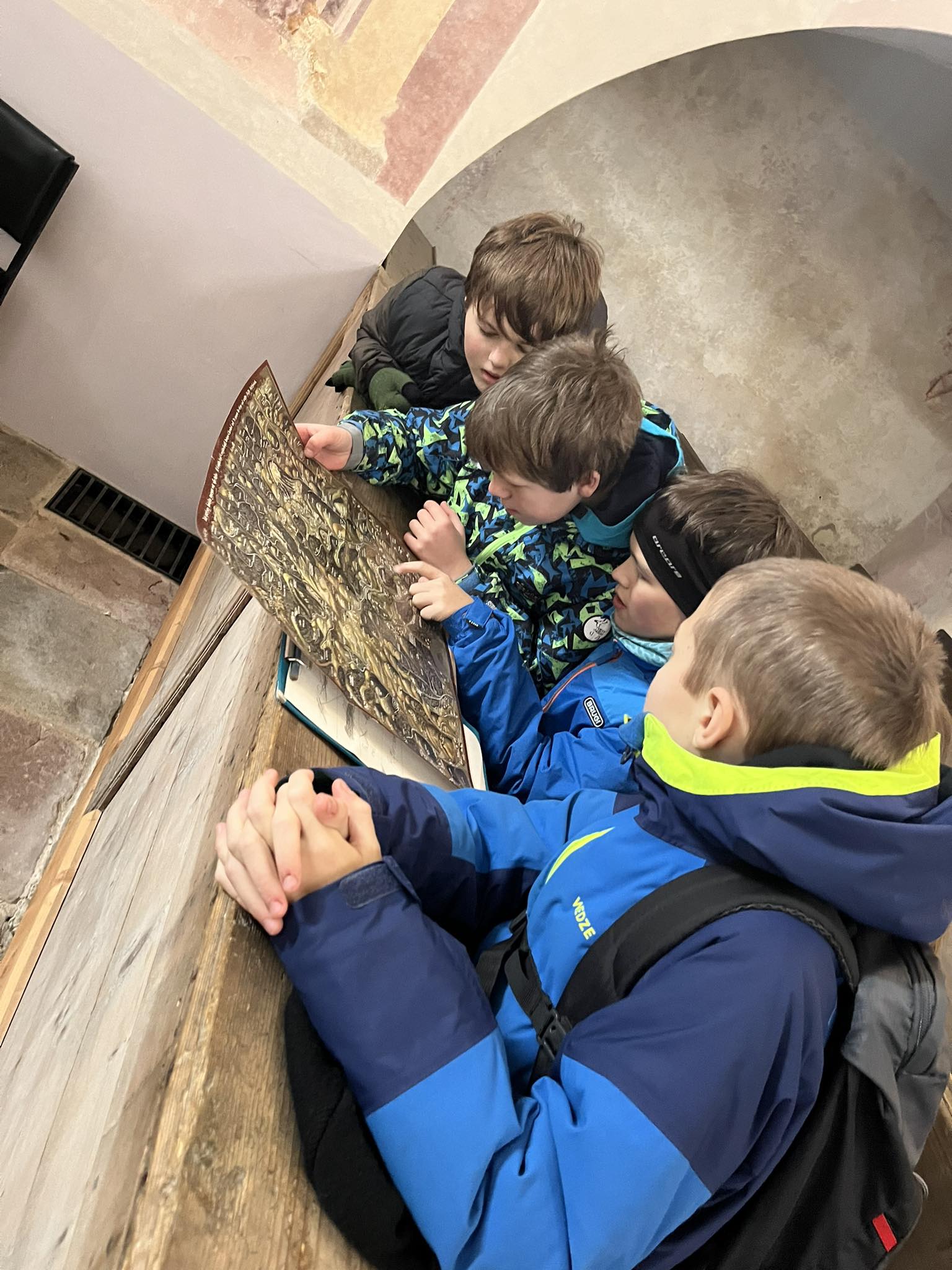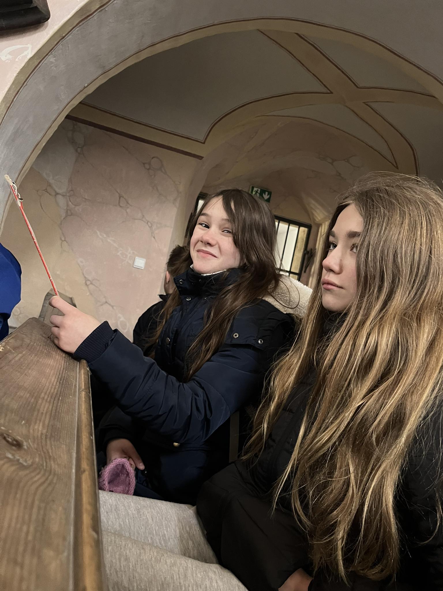 Odpoledne jsme cestovali do minulosti a "prohlédli" jsme si Krkonoše v rámci procházky v různých stoletích. Během toho jsme po týmech odpovídali na otázky a plnili různé úkoly- třeba jsme zpívali v místním kostele.