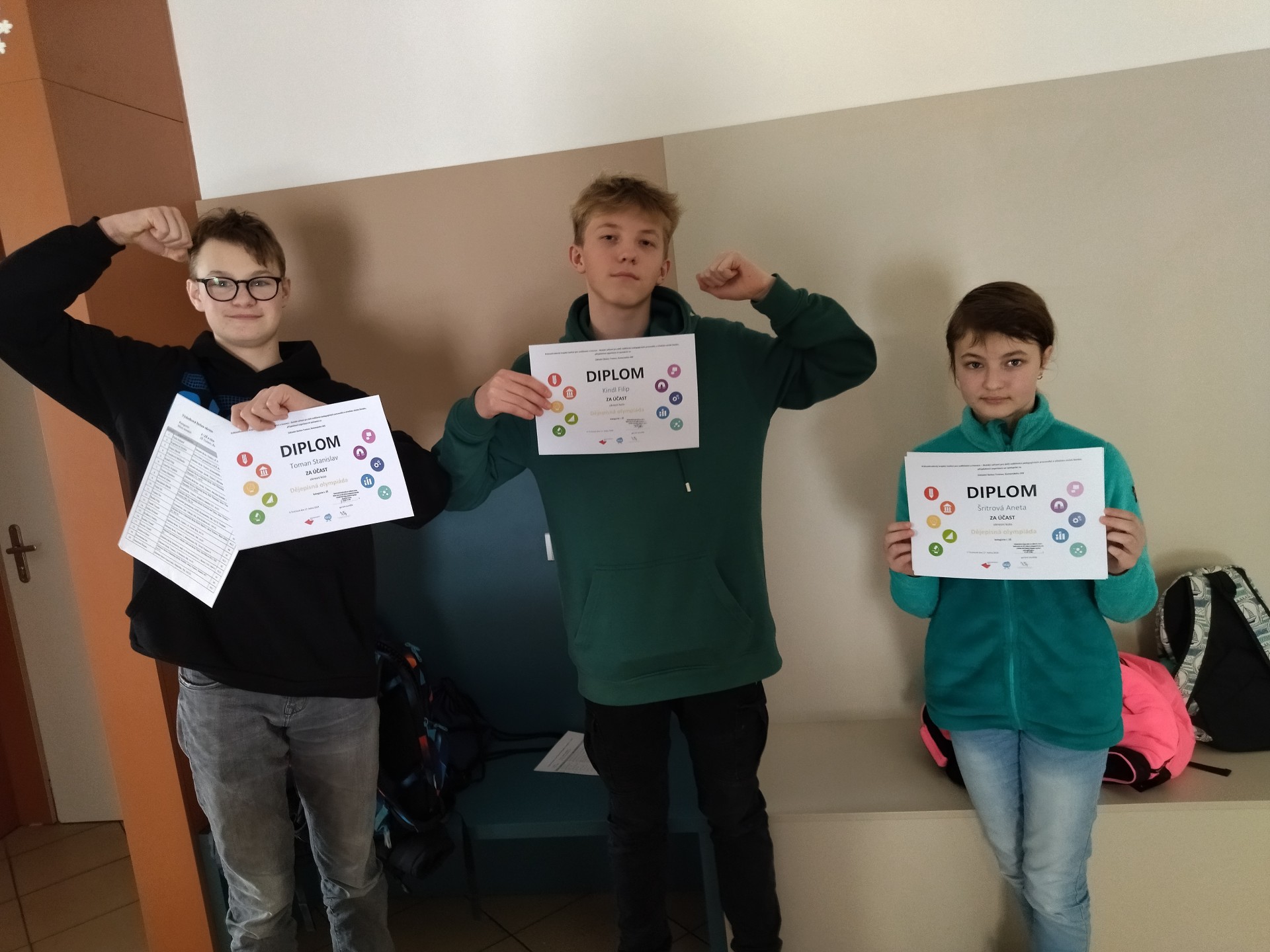 V konkurenci 30 žáků daleko větších městských základních škol i víceletých gymnázií obsadil náš osmák Filip Kindl krásné 5. místo, když zaostal za 2. příčkou o pouhý bod a získal 71 z 80 možných! Těsně v závěsu na 7. místě pak skončil Filipův spolužák Standa Toman s 68 body. Je více než reálné, že téměř jistě Filip a pravděpodobně i Standa postoupí na kraj a budou nás reprezentovat i v regionálním kole.
