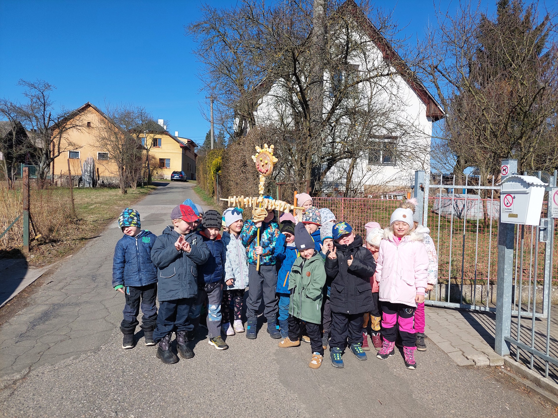 Při vycházce jsme s babicí dorazili až k rybníku, kde jsme ji pomocí veršů říkanky zahnali a následně vhodili do vody. Všichni se začínáme radovat z prvních jarních slunečních paprsků a doufáme, že se radují i vodní živočichové, kteří si možná právě teď, pochutnávají na naši babici Zimnici.