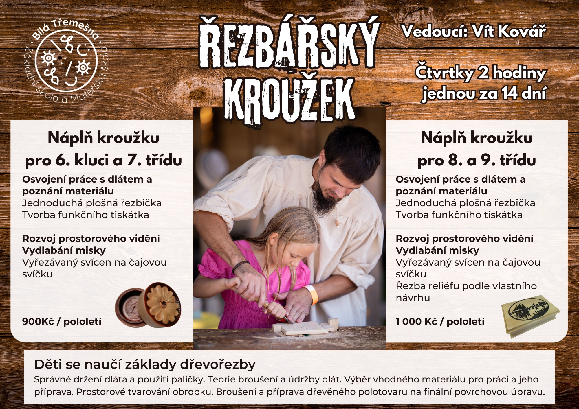 Základní škola Bílá Třemešná nabízí řezbářský kroužek pod vedením Víta Kováře. Kroužek se bude konat ve čtvrtek jednou za 14 dní.