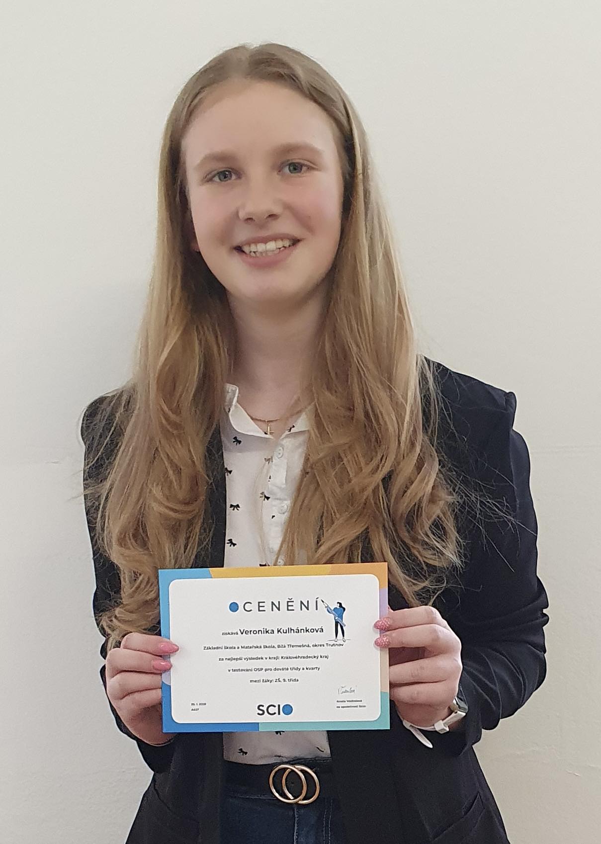 Máme obrovskou radost, že se s vámi můžeme podělit o vynikající zprávu. Naše žákyně Veronika Kulhánková dosáhla v rámci celorepublikového testování SCIO (vzdělávací projekt Národní testování) naprosto špičkového výsledku.