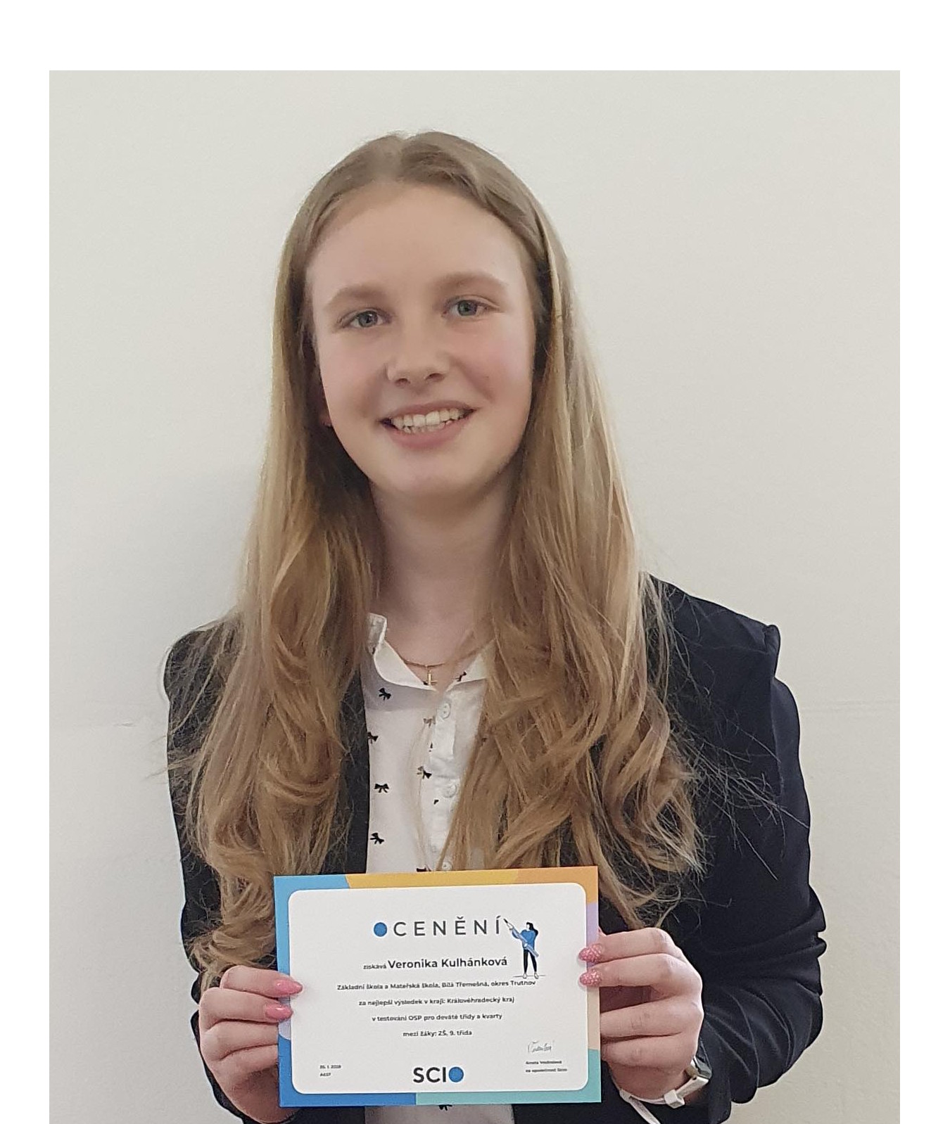 V testu Obecných studijních předpokladů (OSP) pro 9. ročníky a kvarty se Veronika umístila na 1. místě v celém Královéhradeckém kraji! ![]()