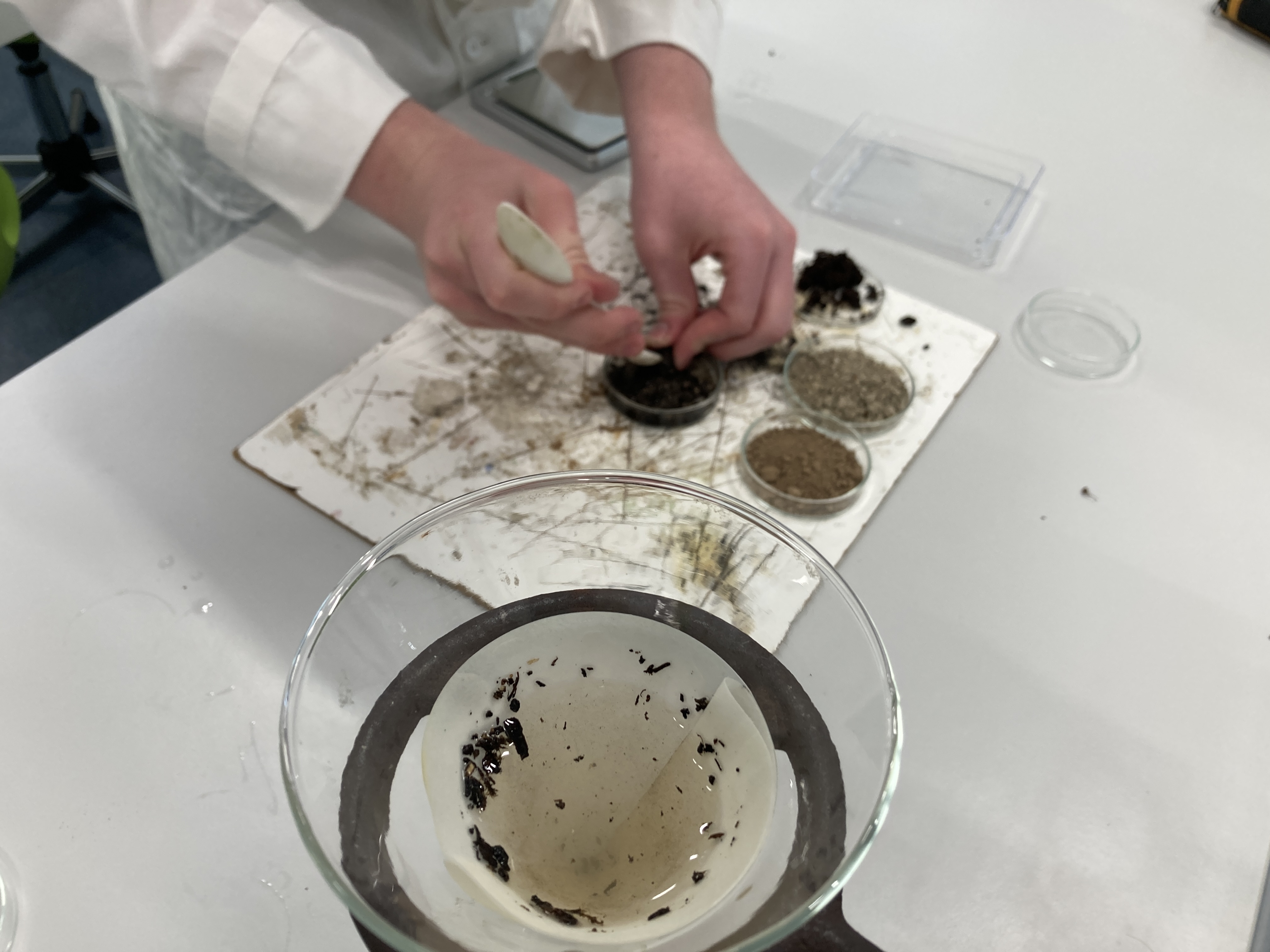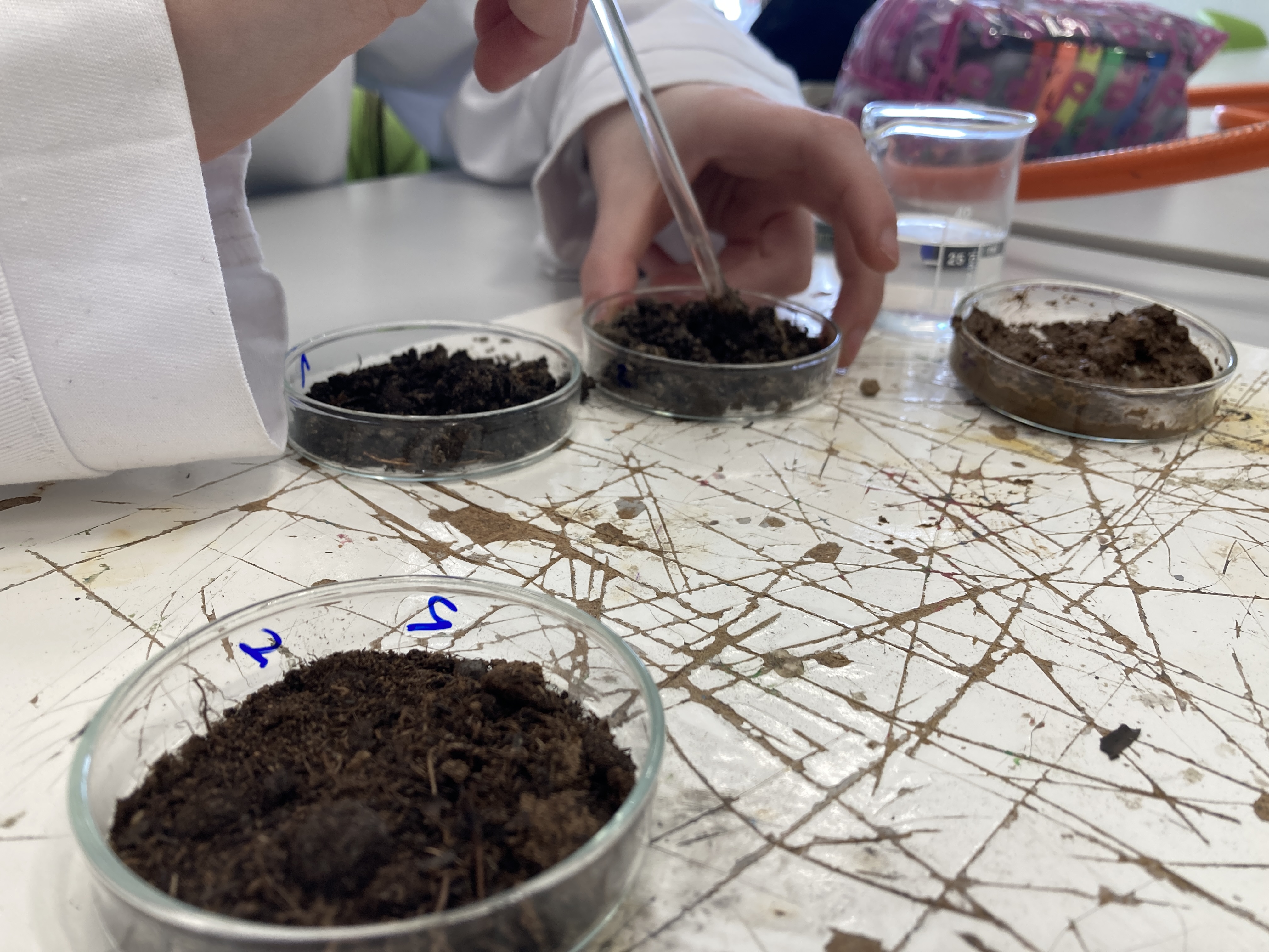 Po tomto úvodu došlo i na „špinavou“ část. V rámci laboratorního cvičení žáci o půdě zjišťovali důležitá fakta, která mnohdy rozhodují o účelném hospodaření. Dostalo se tak na pH půdy, tvarovatelnost, strukturu, zadržování vody, hustotu a další. I zde přišly na řadu dovednosti jako vedení týmu, organizace práce i uplatnění získaných znalostí k identifikaci neznámých vzorků.