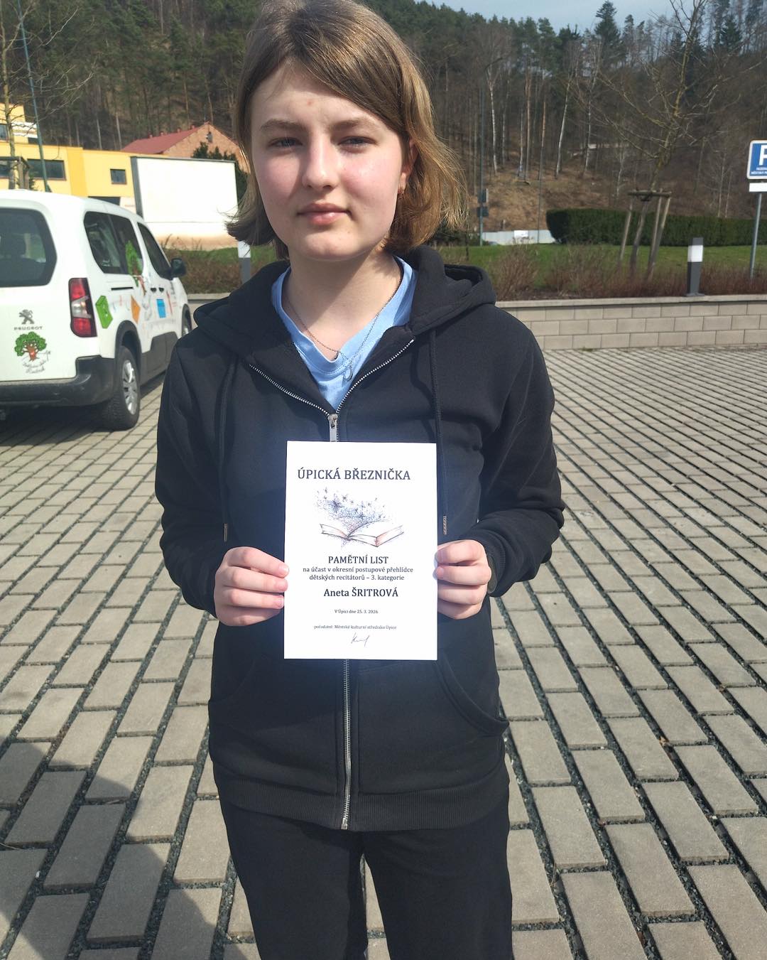 Svou zástupkyni měla naše škola i v kategorii mladších žáků 2. stupně. Poměrně složitý text si chystala sestra úspěšného Kuby a naše dlouholetá reprezentantka zejména v dějepisných soutěžích Aneta Šritrová ze 7.B. Přestože byla konkurence tentokrát nad její síly, i tak jí patří obrovský dík za skvělou reprezentaci školy, nasazení i úsilí. Letos Aneta nabrala zkušenosti, které jistě příští rok před porotou zúročí.